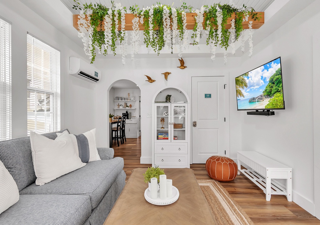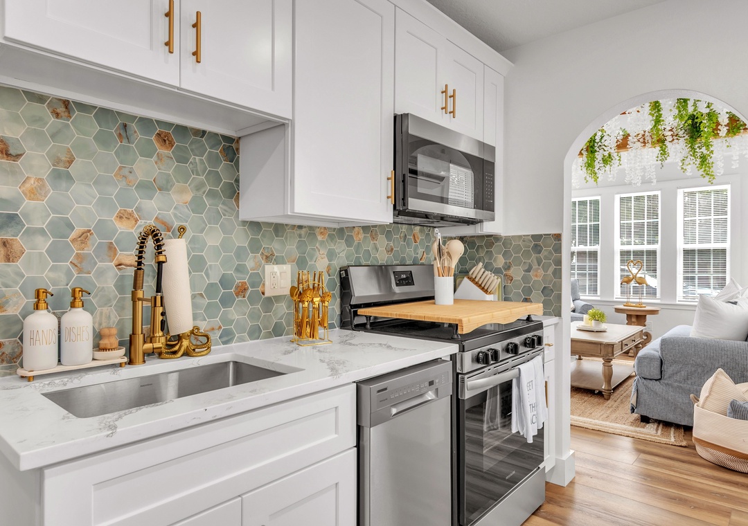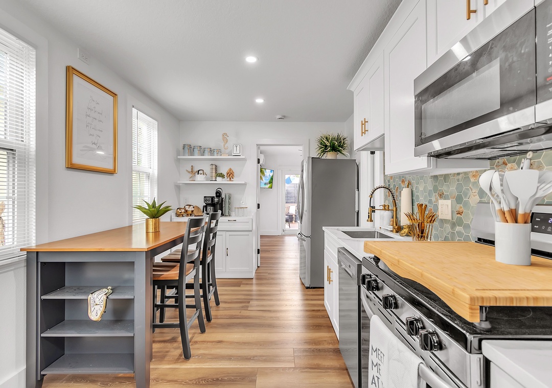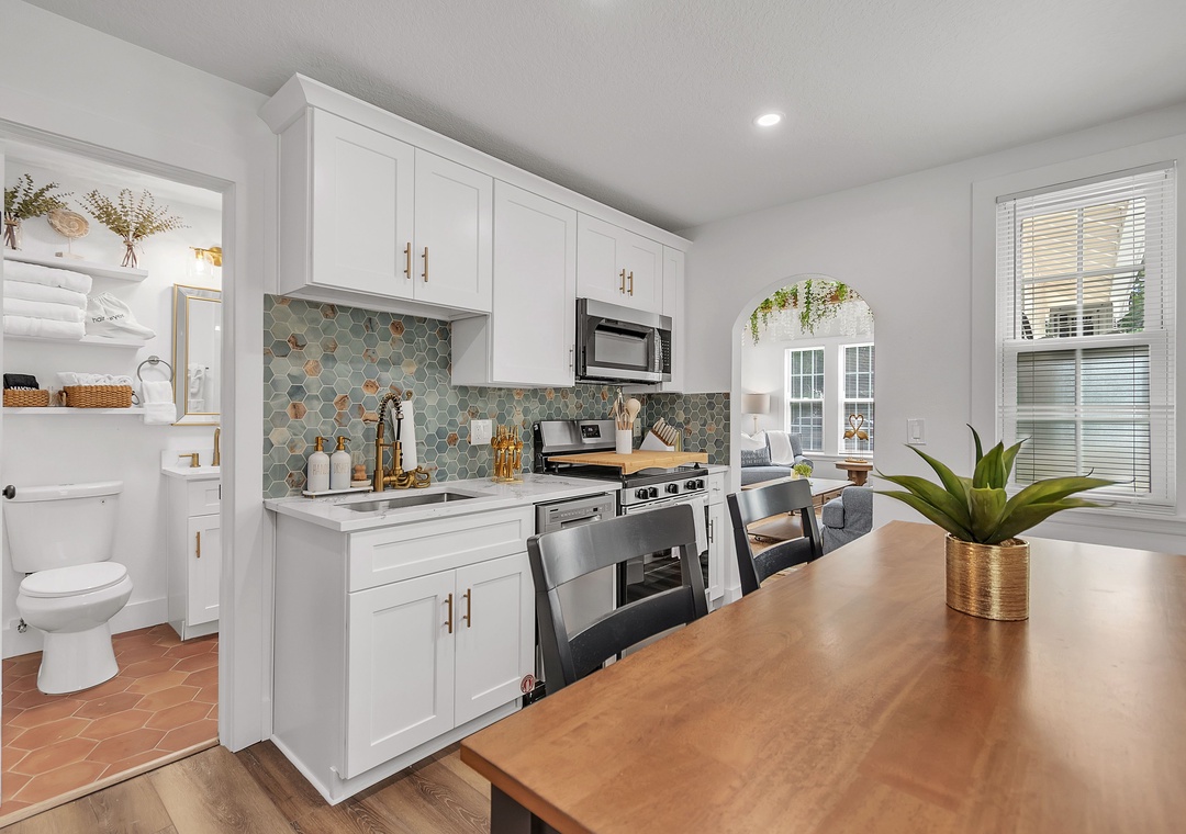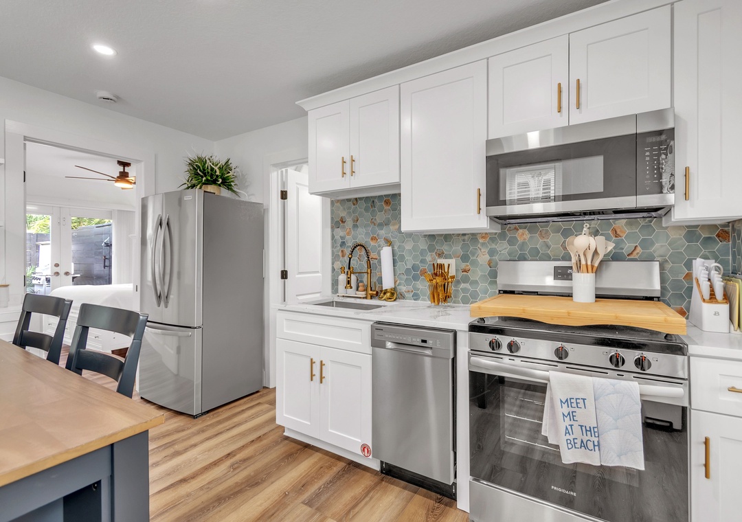 The living room is warm and inviting, furnished with a comfortable sofa that converts to a full-size bed, a coffee table, a large accent chair, and a large-screen Smart TV for relaxing evenings. Just beyond, the kitchen and dining area are thoughtfully designed and fully equipped with a large refrigerator, dishwasher, oven and stove, and ample counter space. The kitchen is fully stocked with dishes, utensils, and cookware so you’ll feel right at home, and the charming coffee bar is the perfect way to start your day. Enjoy meals indoors at the dining table or step outside for al fresco dining.