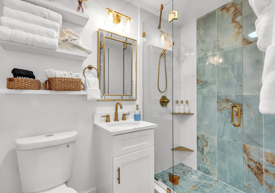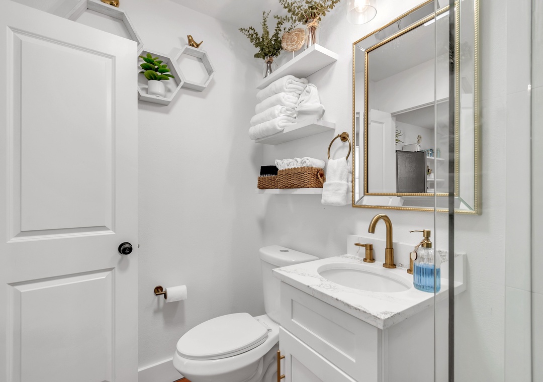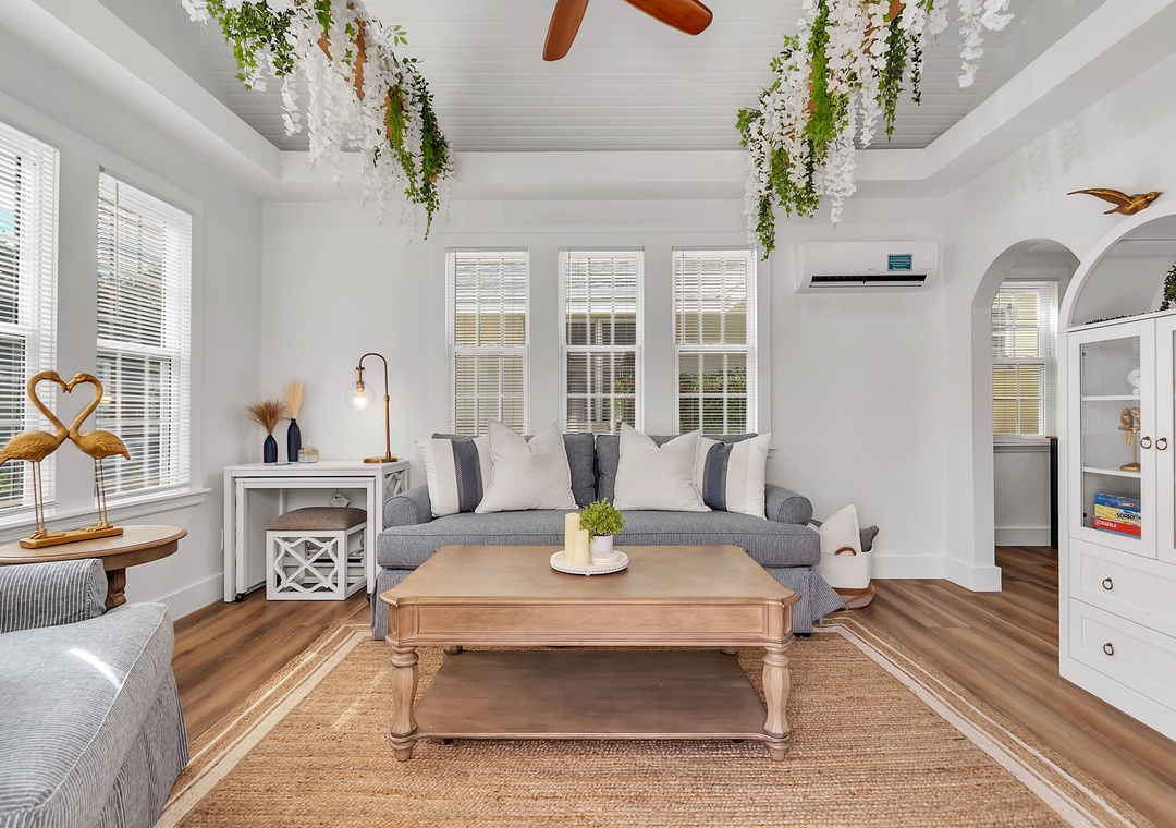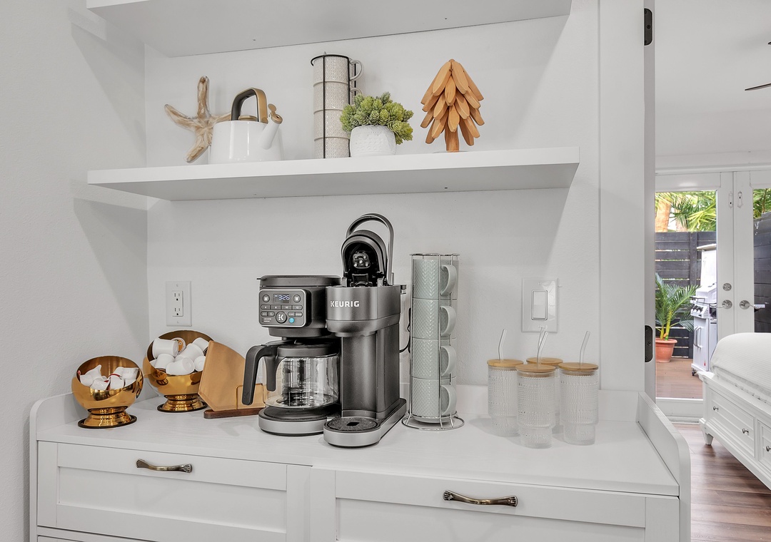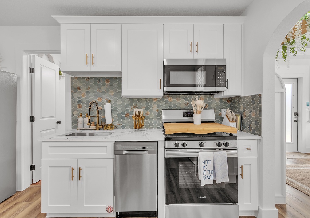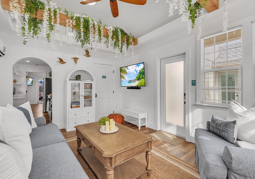 The living room is warm and inviting, furnished with a comfortable sofa that converts to a full-size bed, a coffee table, a large accent chair, and a large-screen Smart TV for relaxing evenings. Just beyond, the kitchen and dining area are thoughtfully designed and fully equipped with a large refrigerator, dishwasher, oven and stove, and ample counter space. The kitchen is fully stocked with dishes, utensils, and cookware so you’ll feel right at home, and the charming coffee bar is the perfect way to start your day. Enjoy meals indoors at the dining table or step outside for al fresco dining.