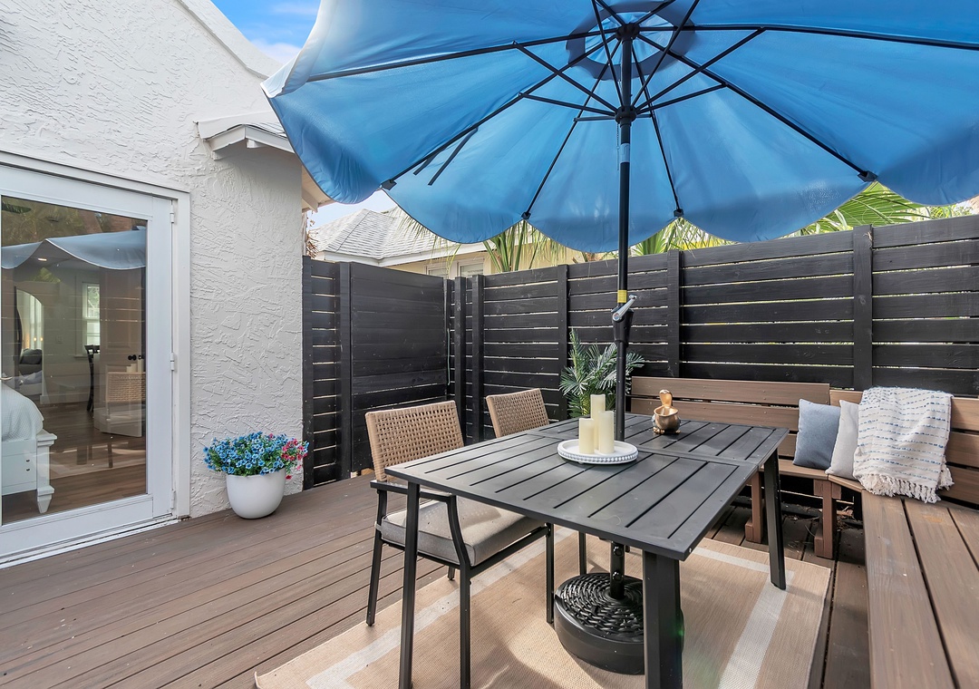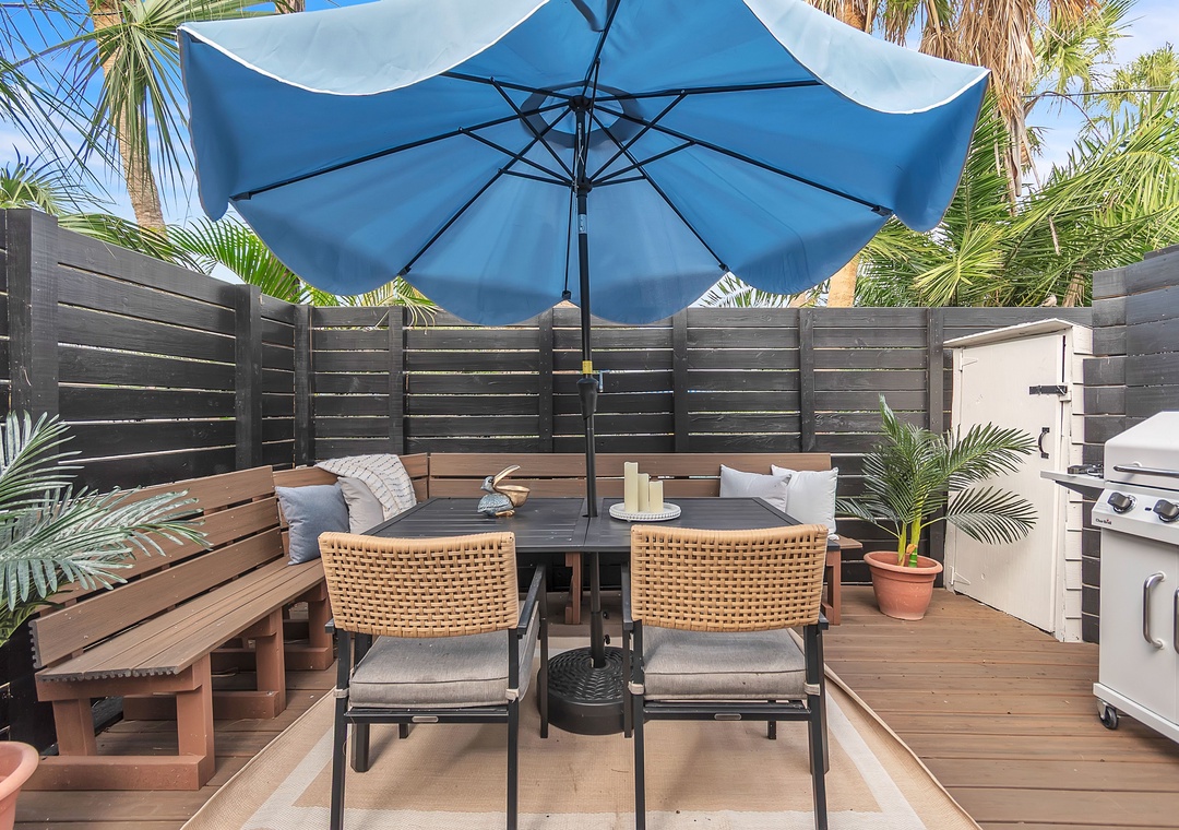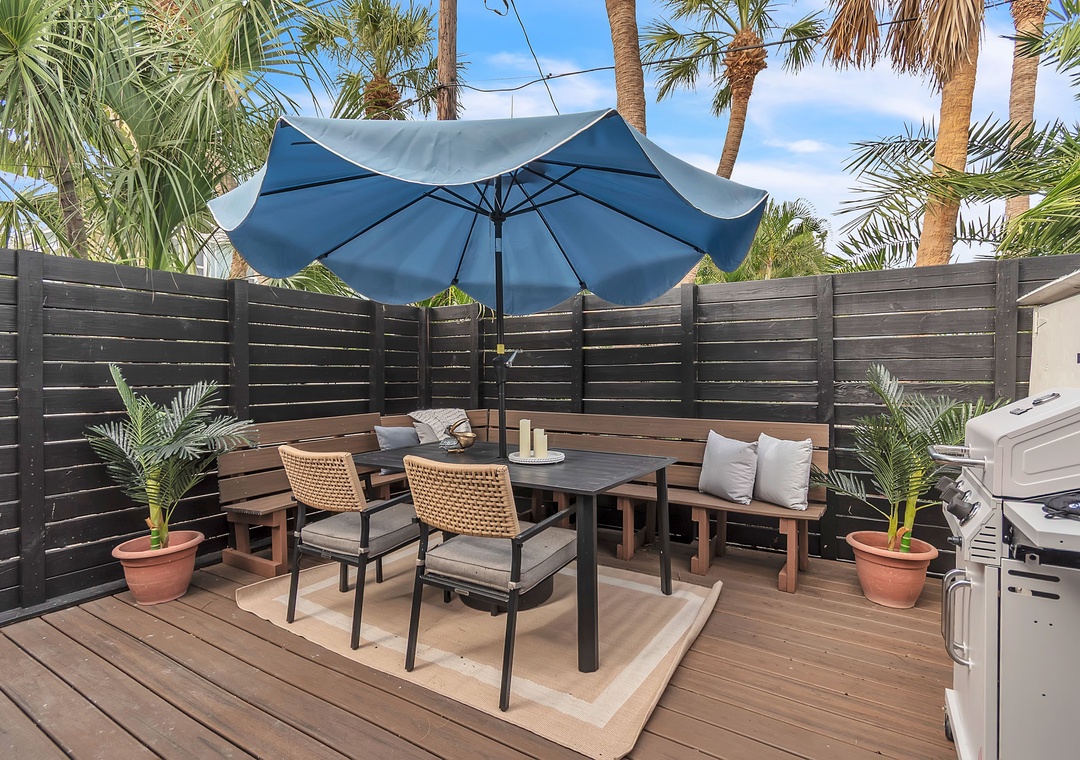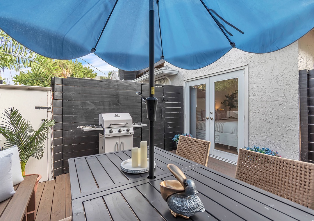 * Private Outdoor Patio Featuring a Dining Table, Seating, and Gas Grill