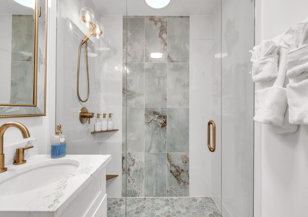 The bedroom features a comfortable king-size bed and direct access to the private patio. The bathroom is beautifully finished with elegant details, including a spacious walk-in shower with stunning tile work and a shower head with a handheld option. The private patio is a true highlight, offering plenty of space with a full outdoor dining table, bench seating, chairs, an umbrella for shade, and a gas grill—perfect for relaxing evenings and enjoying grilled dinners outdoors.