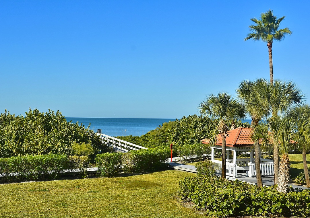 Land's End is a gated waterfront community in Treasure Island, nestled at the end of a peninsula and surrounded by water on three sides. To the east, it borders a channel of the Intracoastal Waterway, while the Gulf of Mexico lies to the west, and Blind Pass to the south. Residents can enjoy stunning views of boats passing through the channel, with dolphins and manatees often spotted nearby. The community features 10 buildings and a range of amenities, including a large, heated pool, hot tub, tennis and pickleball courts, sand volleyball, shuffleboard, gazebos, and a BBQ grilling area. Direct beach access onsite for all offers a perfect blend of relaxation and recreation for anyone.