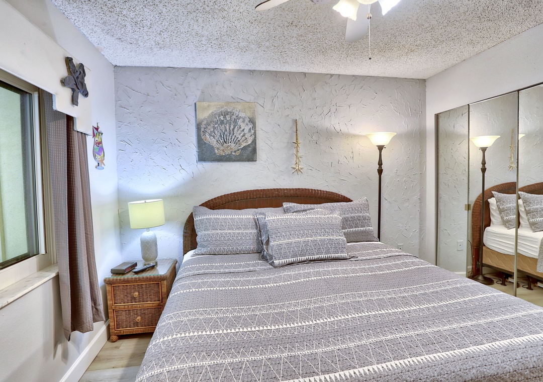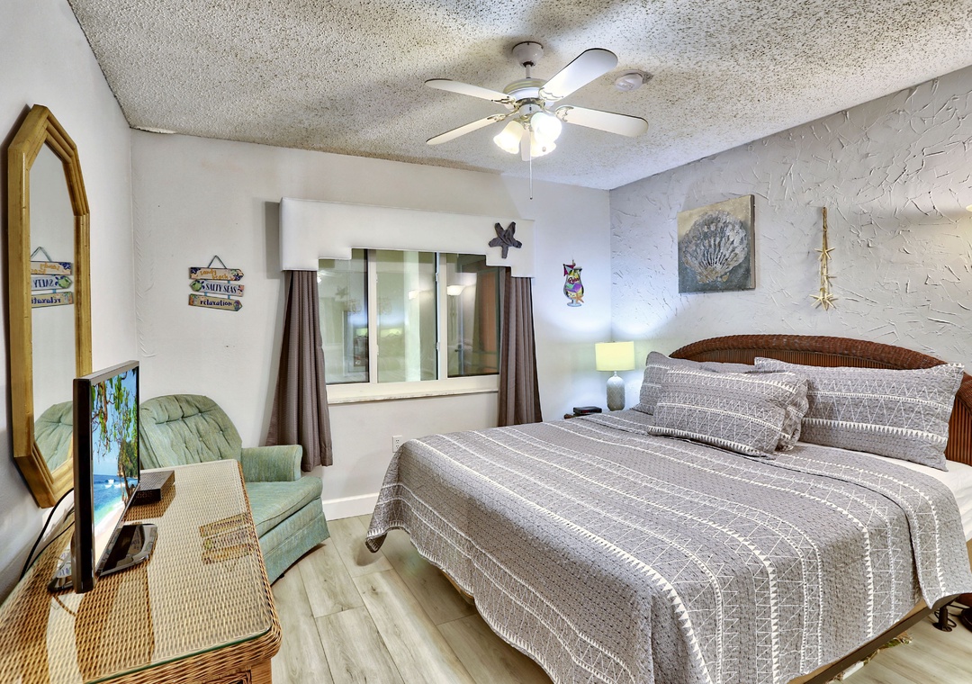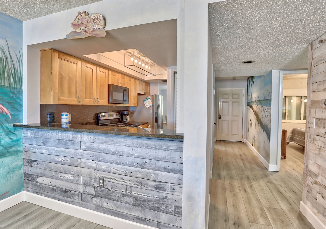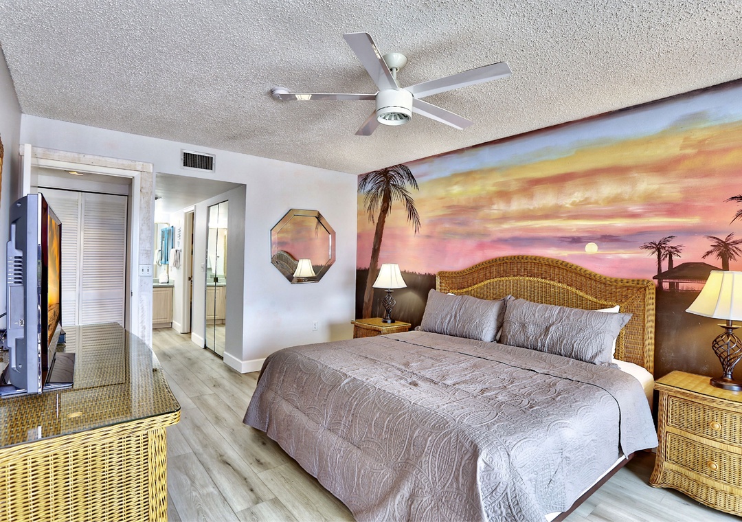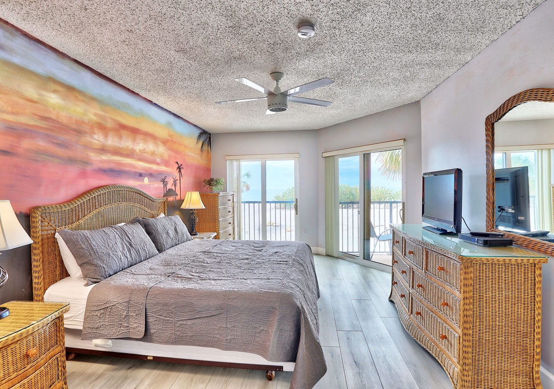 The owner-artist has made sure you will never forget your stay in this comfortable Gulf front condo. The walls are adorned with colorful, hand painted murals. Both happy and soothing, this wall art is sure to make you smile. Located in the popular Sunset Beach neighborhood, this lovely condo has a fully equipped kitchen and a private balcony facing the beach and the Gulf of Mexico. The master bedroom has a door to the balcony and a large window facing the Gulf. Let the sound of the waves lull you to sleep in this lovely condo. Free WiFi.