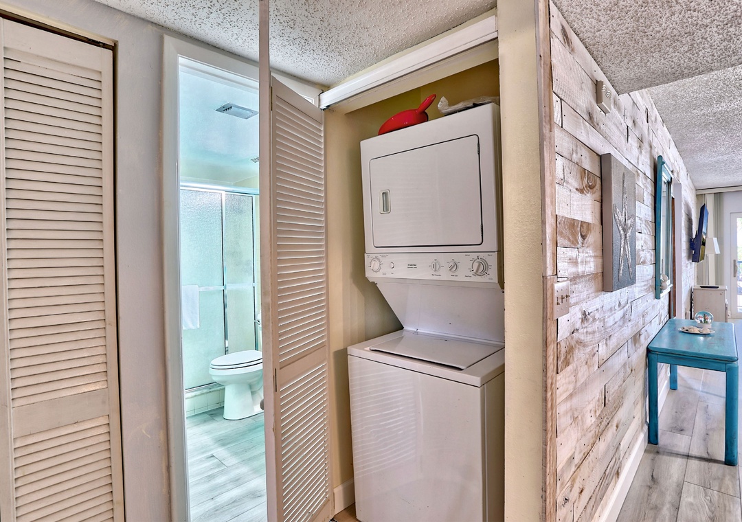 Thank you Melissa for reviewing your stay at Land's End building 11, unit 202. We hope you enjoyed your stay. We apologize for inconvenience you experience from the door to the laundry closet being off the track. We will have maintenance take care of this. We are glad the construction taking place in the complex wasn't a bother. We hope you will consider a future stay.Resort Rentals staff