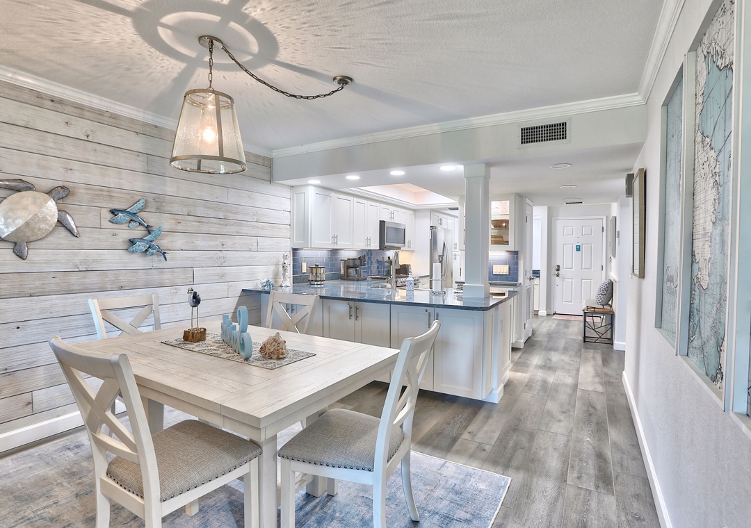 The dining area is ideal for enjoying meals together or a fun evening of card games. The fully stocked kitchen boasts gorgeous countertops, a custom backsplash, and stainless steel appliances—everything you need to feel right at home. Just off the kitchen, you’ll find a convenient built-in desk, ideal for guests combining work and play.