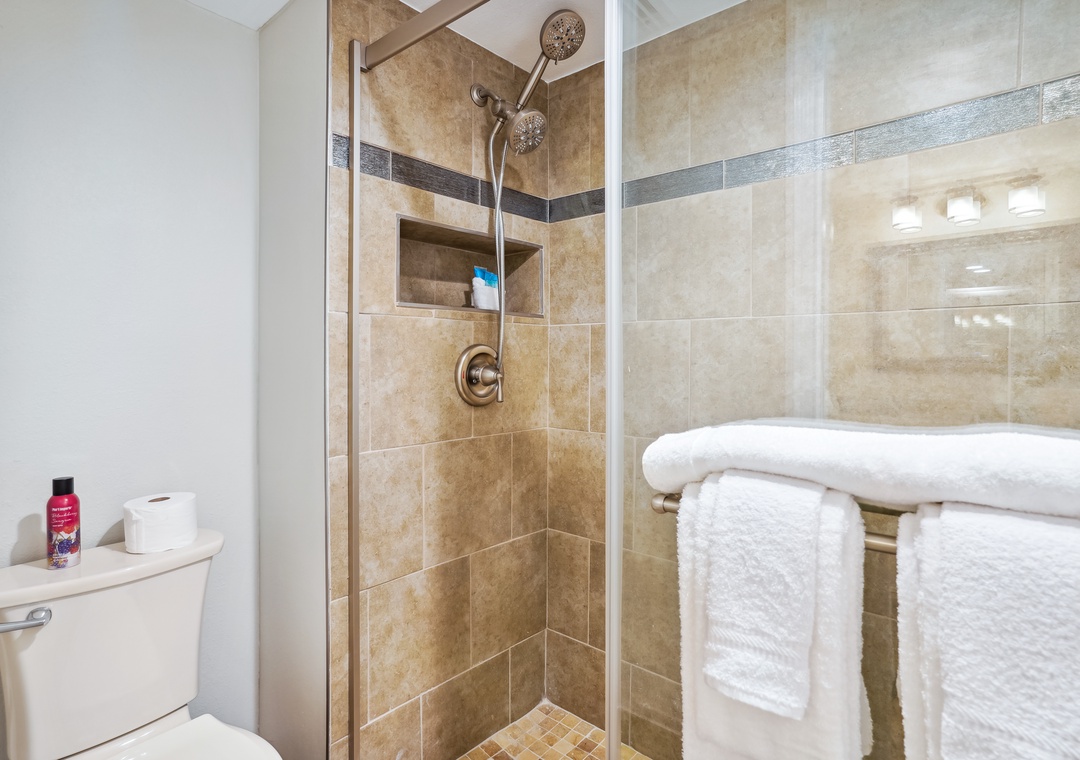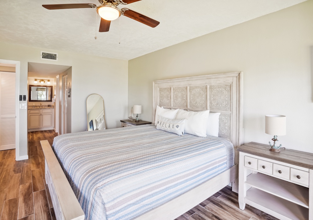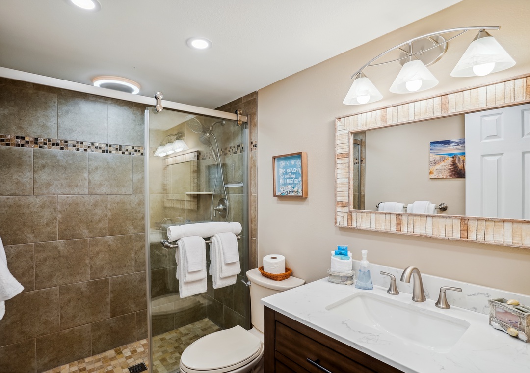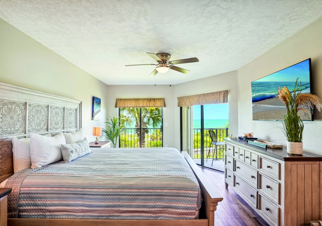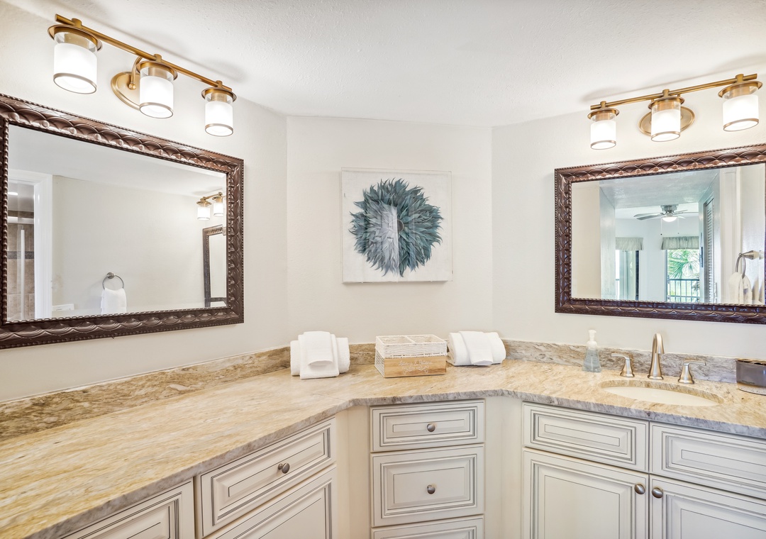 Just off the living area, you will find the main suite which has a king size bed, as well as private gulf balcony access. The attached private bathroom has beautiful granite countertops and an all tile walk in shower. The guest bedroom features a queen size bed. The guest bathroom has a large walk-in shower with sliding glass doors.