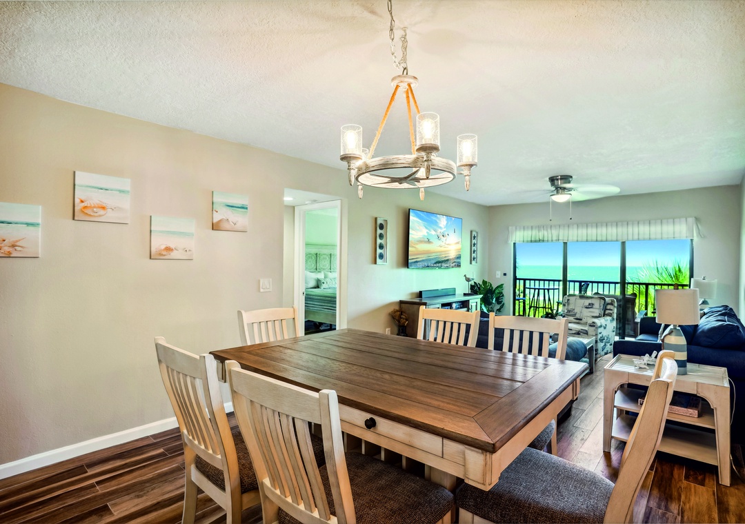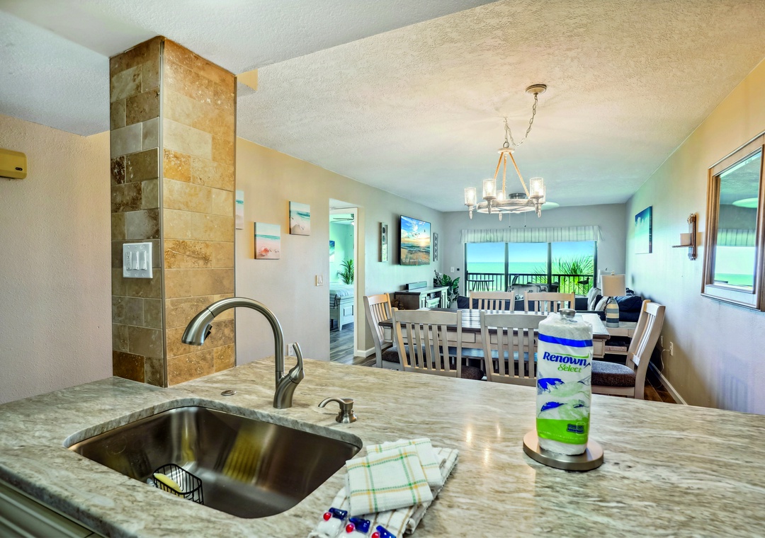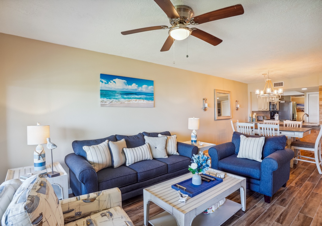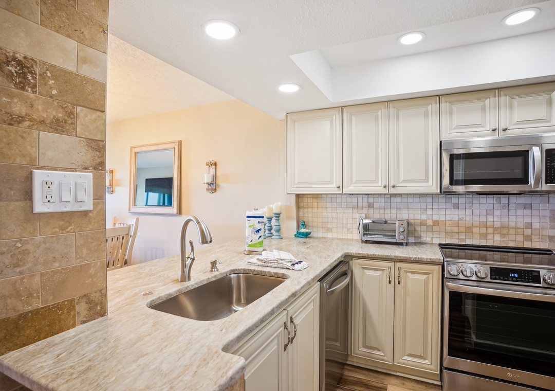 You'll find all the comforts of home in this cozy 2 bed, 2 bath getaway! This charming family-friendly beachfront condo is truly a home away from home. As you enter the unit, you’ll will fall in love with the freshly updated kitchen and living area. The fabulous kitchen has just been remodeled with new stainless-steel appliances and granite counter tops. The living area is outfitted with a plenty of comfortable seating great for lounging around after a long day of adventure. The living room is complete with a large flat screen TV and a fireplace. Step out onto the fully furnished balcony and admire the expansive gulf views.
