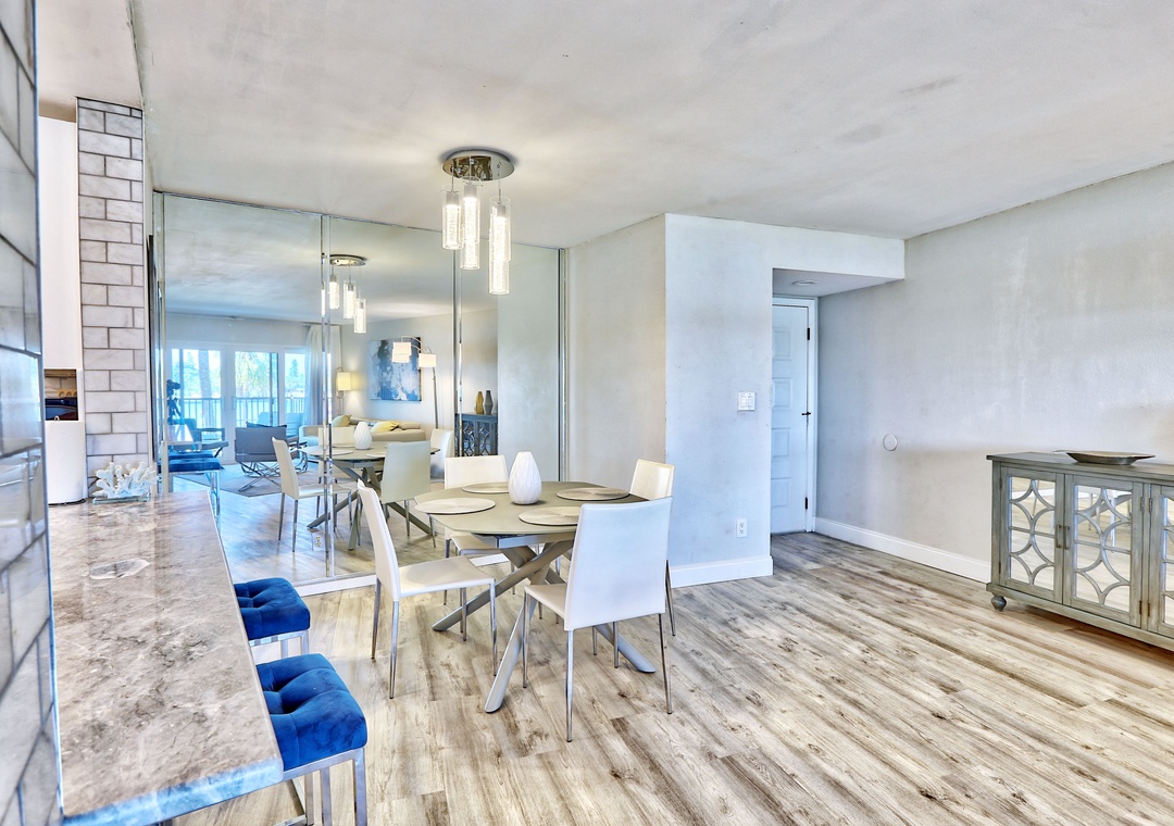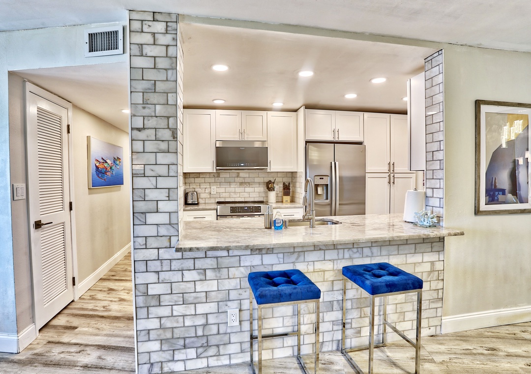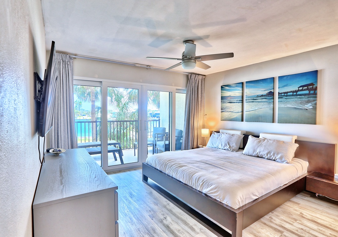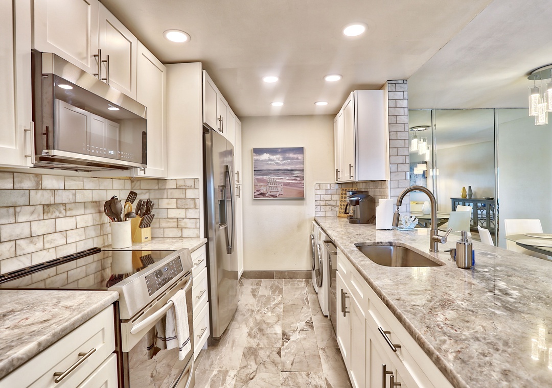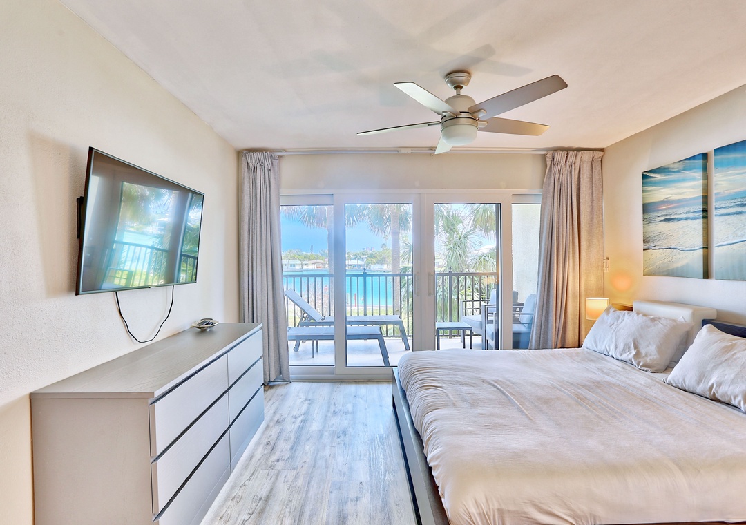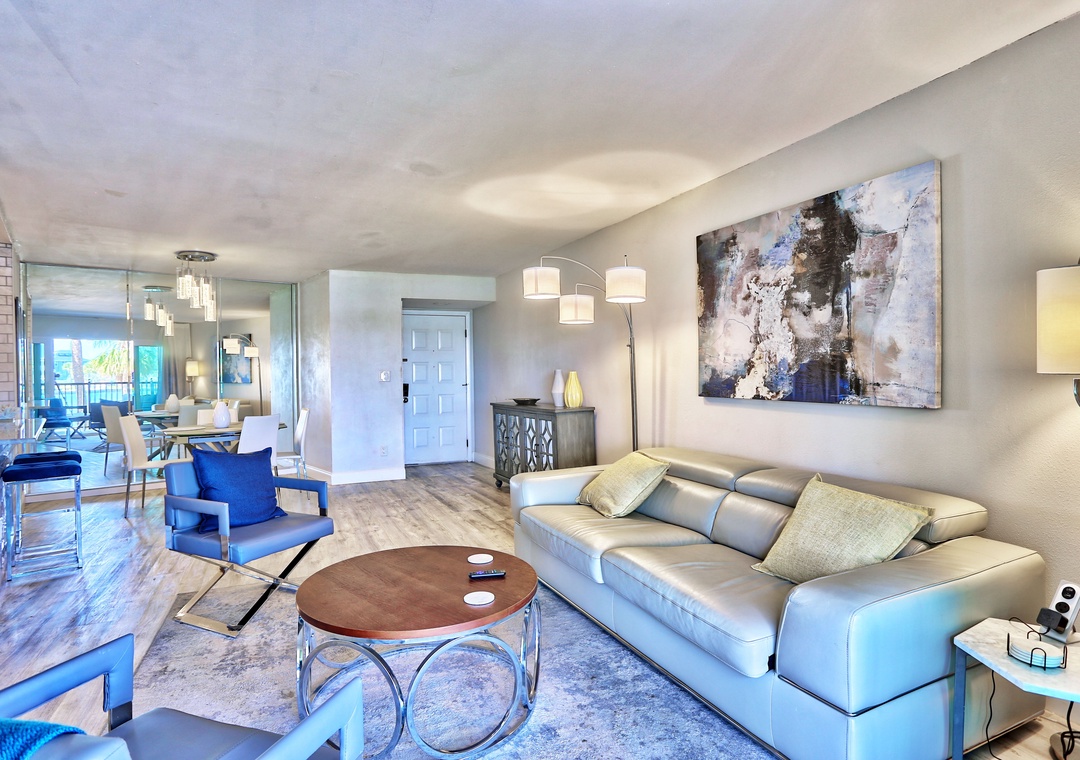 Welcome to Land's End 1-206! This beautifully updated 2-bedroom, 2-bathroom condo at Land’s End is in a gated beachfront community offering an array of amenities for the ultimate vacation experience. This open and bright condo is designed for relaxation and comfort, with a spacious living room featuring a comfy sofa, two chairs, and a large-screen TV. Step out onto a private balcony from the living room to enjoy the waterway views, complete with a table and chairs perfect for relaxing. The updated kitchen is fully stocked with dishes, cookware, utensils, and everything you need to create delicious meals at home, complemented by brand-new stainless-steel appliances. Enjoy your meals at the dining table, with extra counter seating available. The entire condo, including the master shower, is Alexa-enabled, allowing you to control the curtains, lights, and temperature with your voice. Experience modern luxury and convenience in this exceptional condo!