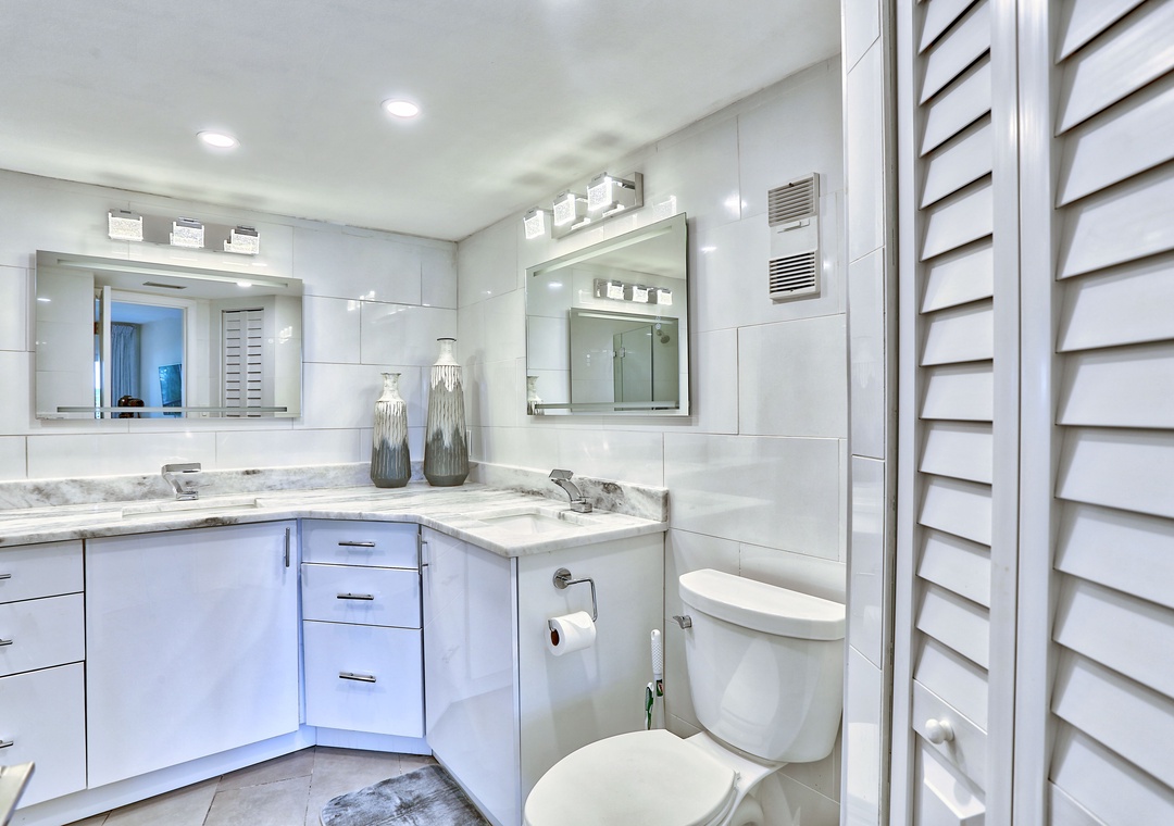 The master bedroom boasts a king-sized bed, large-screen TV, and access to a 2nd private balcony with seating. The attached master bathroom is a luxurious retreat, featuring double sinks and a walk-in shower with a built-in bench. The second bedroom is perfect for families or friends, offering a trundle bed set up with twin over twin bedding. The condo also includes a washer and dryer for added convenience and a sofa sleeper in the living room for extra sleeping space.
