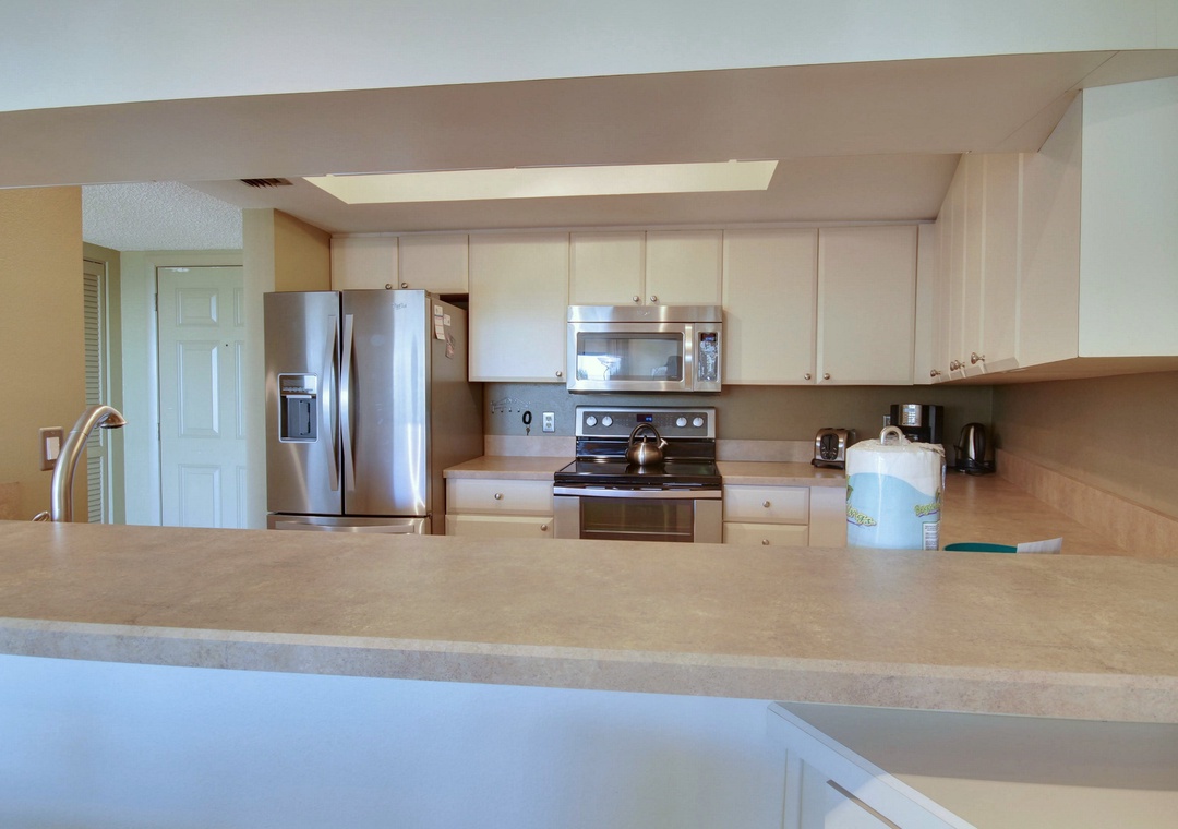 From the moment you enter, this renovated north corner condo embraces you with both comfort and elegance. The warm earth tones coupled with the contemporary decor beckon you to relax and unwind while the striking fully equipped kitchen stirs up your inner chef. Relax on your balcony that offers a unique view of the pool area with the gorgeous Gulf of Mexico in the distance. Other amenities include a washer and dryer, 2 flat screen TV’s and wireless internet service. Building #1 is just across from the pool and only a short walk to the beach access onsite.