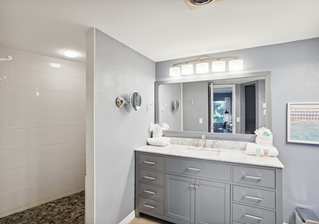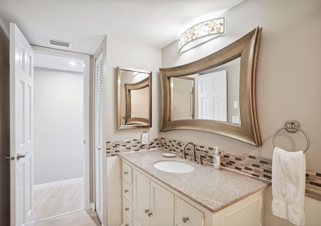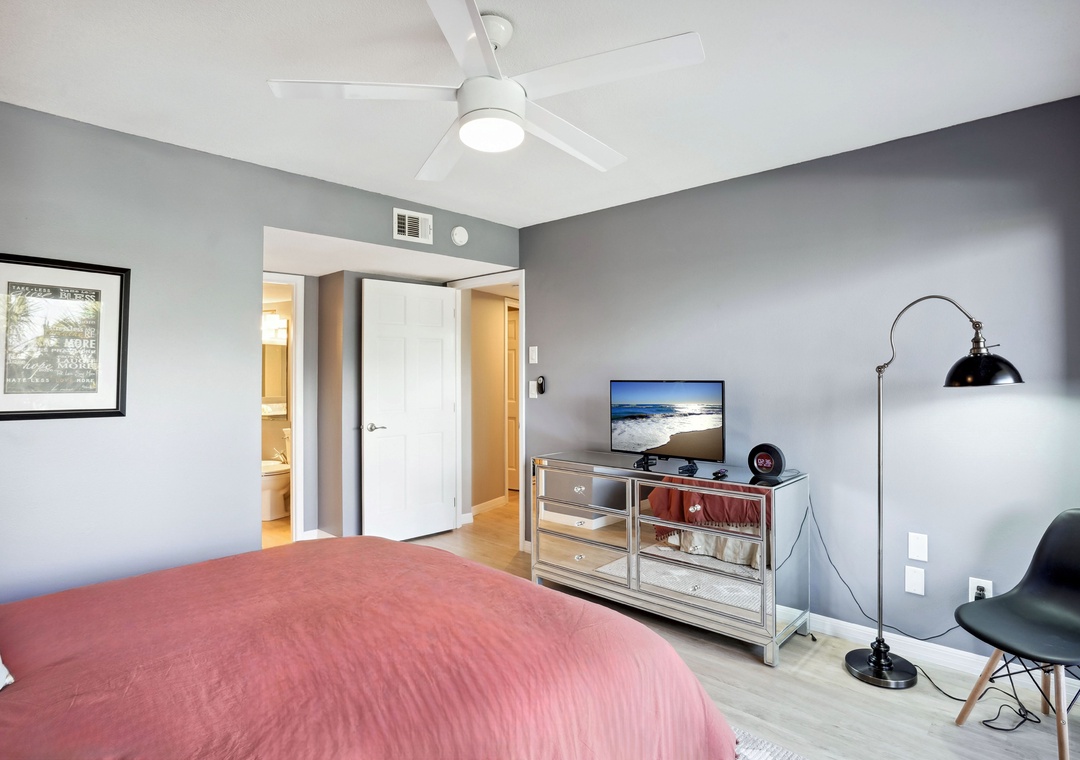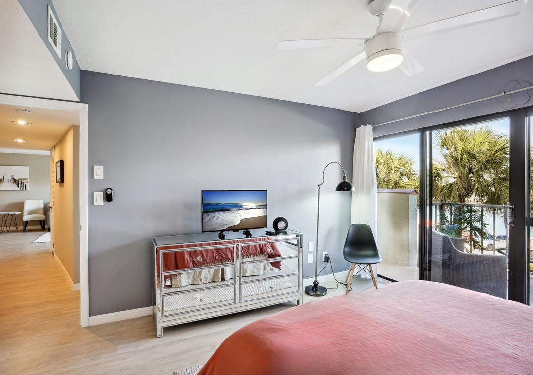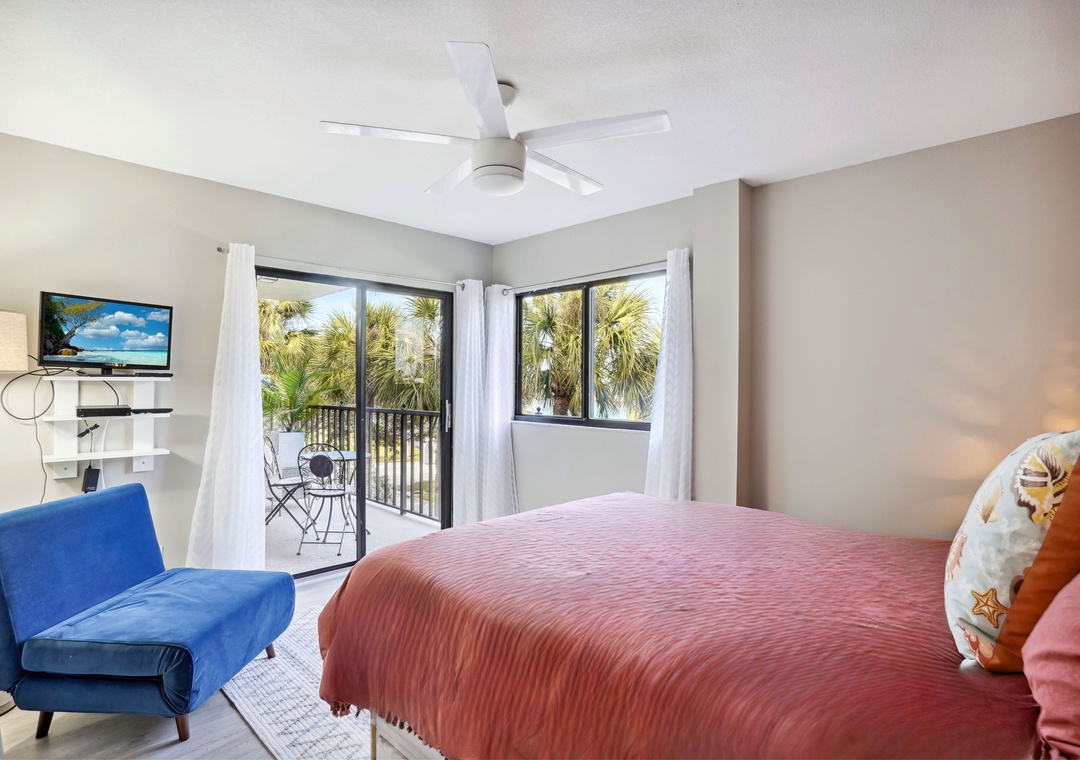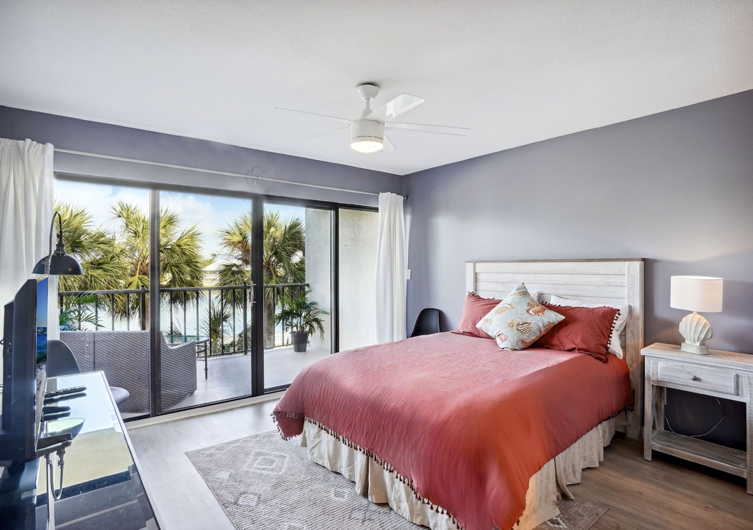 The spacious main bedroom features a queen-sized bed and floor-to-ceiling glass doors that open onto a scenic balcony overlooking Boca Ceiga Bay, where you can take in the gentle sea breeze while relaxing on the comfortable patio furniture. The main bath includes a stunning walk-in shower. The guest bedroom offers a comfy queen-sized bed as well as access to an additional bathroom which features a tub/shower combo.