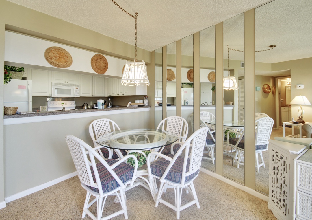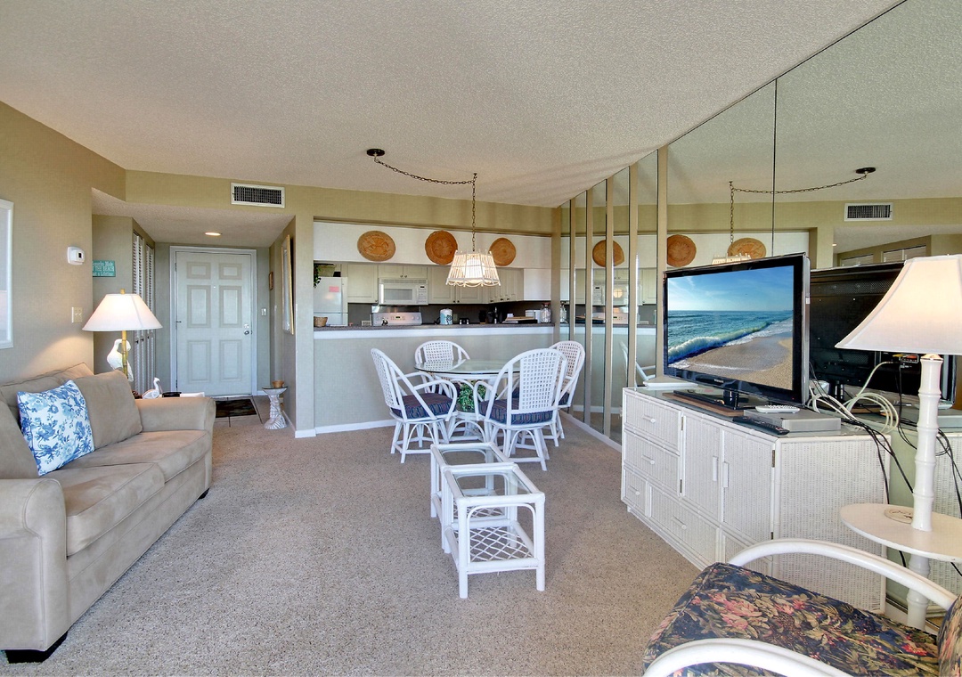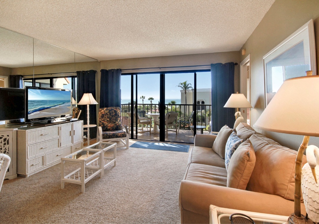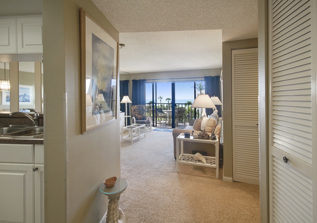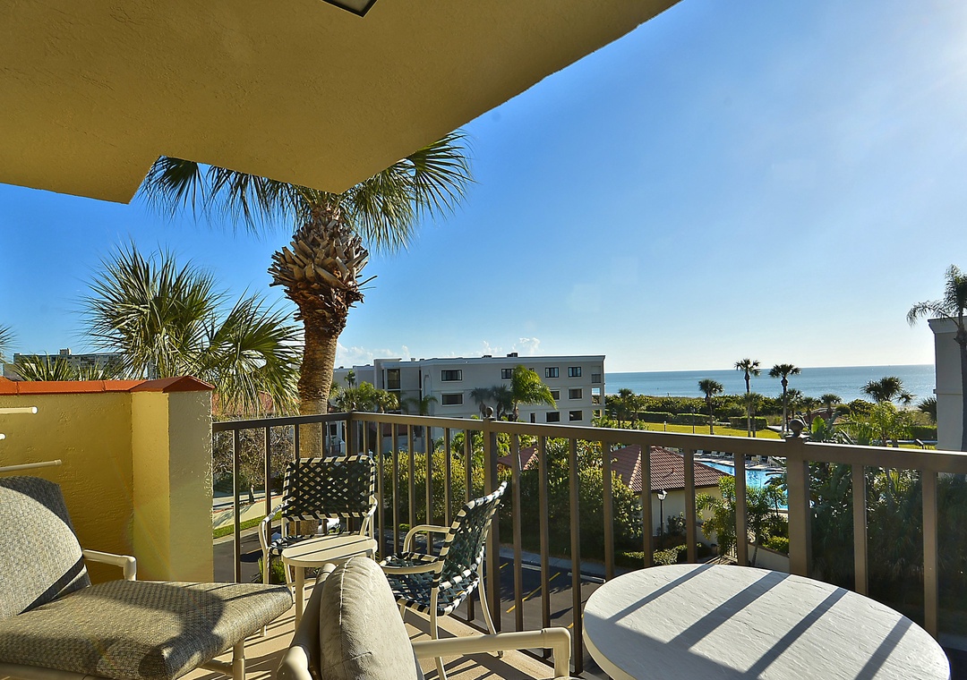 This top floor, 1 bedroom condo has an updated kitchen and a unique view. It is located across from the pool on the east side of the property. Both the living room and bedroom open onto the private balcony facing west and you can see the Gulf of Mexico sparkling in the distance. Located in the popular Sunset Beach neighborhood, you just walk across the property to the beach. Free internet service. Building #1 is just across from the pool and only a short walk to the beach access onsite.