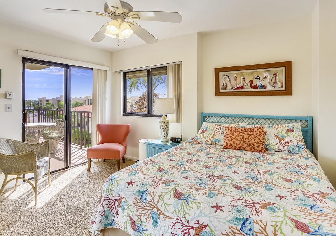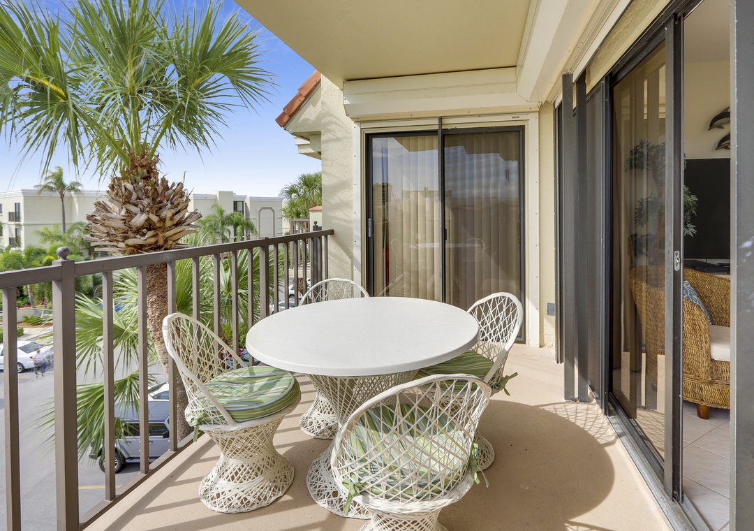 This lovely condo has a special floor plan and 2 private balconies with a unique water view. The fully equipped kitchen is stocked and ready for you to start creating! The living room and guest bedroom open onto a private balcony and the master bedroom has its own private balcony. This condo is located across from the pool on the east side of the property. Both private balconies and all windows face west so you can see the Gulf of Mexico sparkling in the distance. This is a great condo for 2 couples to share since both bedrooms have a large bed and a door to a private balcony. Free wireless internet service. Building #1 is just across from the pool and only a short walk to the beach access onsite.
