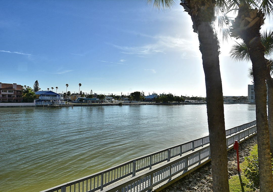 Land's End is a gated waterfront community in Treasure Island, nestled at the end of a peninsula and surrounded by water on three sides. To the east, it borders a channel of the Intracoastal Waterway, while the Gulf of Mexico lies to the west, and Blind Pass to the south. Residents can enjoy stunning views of boats passing through the channel, with dolphins and manatees often spotted nearby. The community features 10 buildings and a range of amenities, including a large, heated pool, hot tub, tennis and pickleball courts, sand volleyball, shuffleboard, gazebos, and a BBQ grilling area. Direct beach access onsite for all offers a perfect blend of relaxation and recreation for anyone.