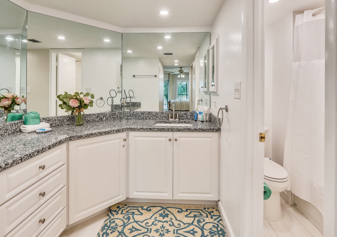 This 2 bedroom, 2 bath condo was completely remodeled including new, fully equipped kitchen with granite counter tops and stainless steel appliances, brand new bathrooms with granite counter tops, all new flooring and paint throughout. Condo is beautiful, bright and tastefully decorated. The views from your private balcony with seating is stunning. Equipped with free wifi, flat screen TVs and so much more!! Building #3 is next to the grilling area on grounds making your cookouts nice and convenient, it is also near the pool and a very easy walk to the beach access onsite!