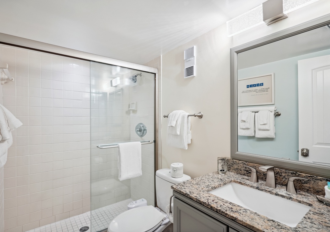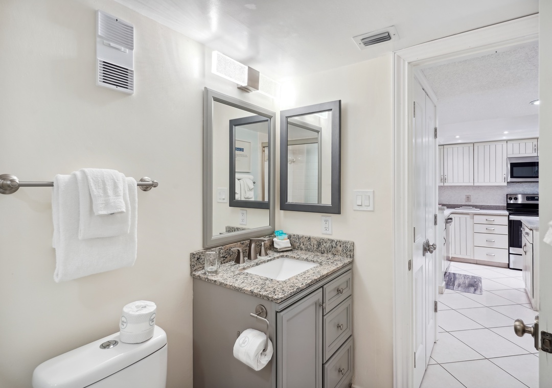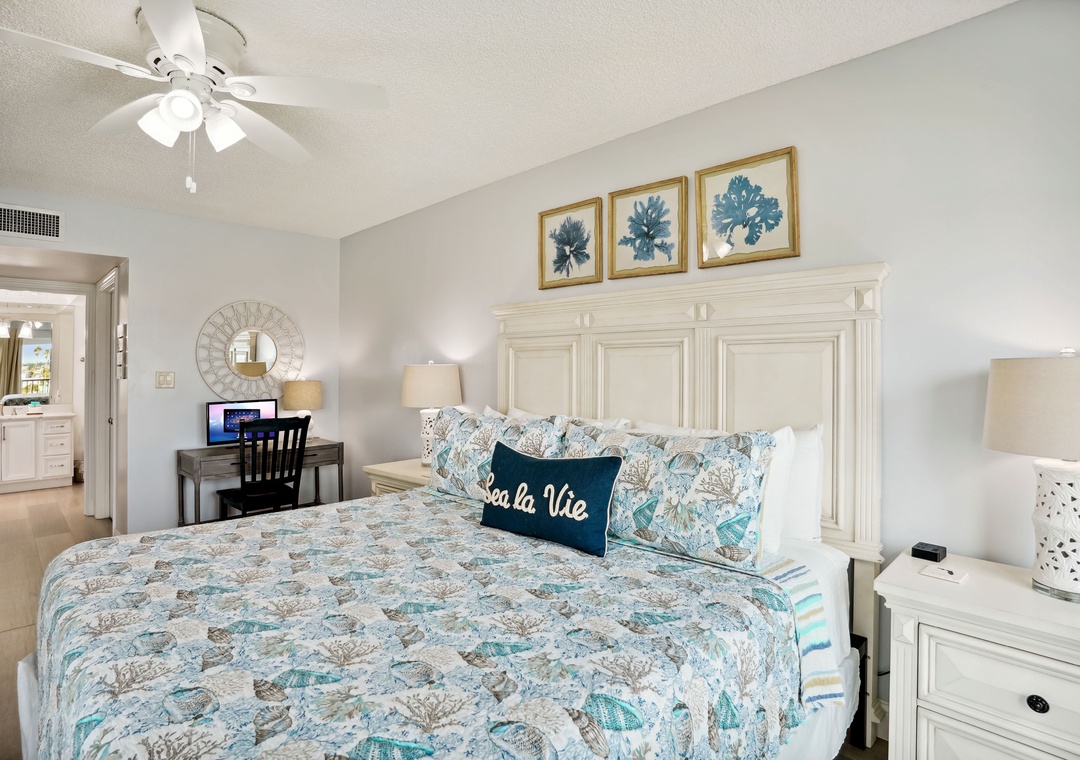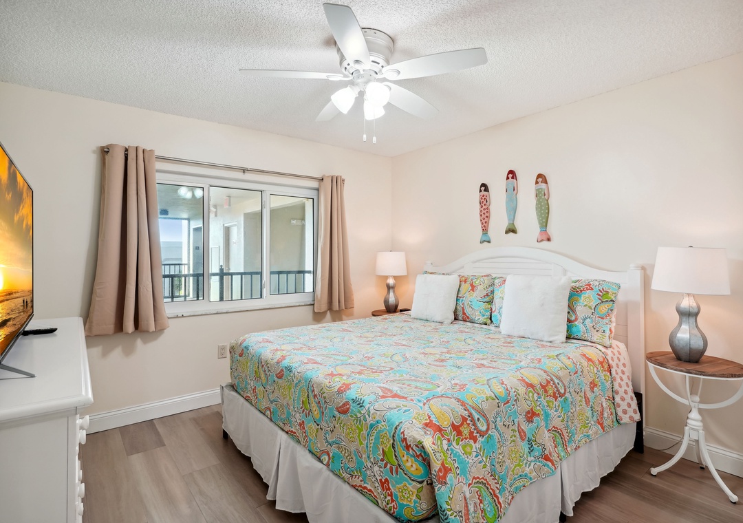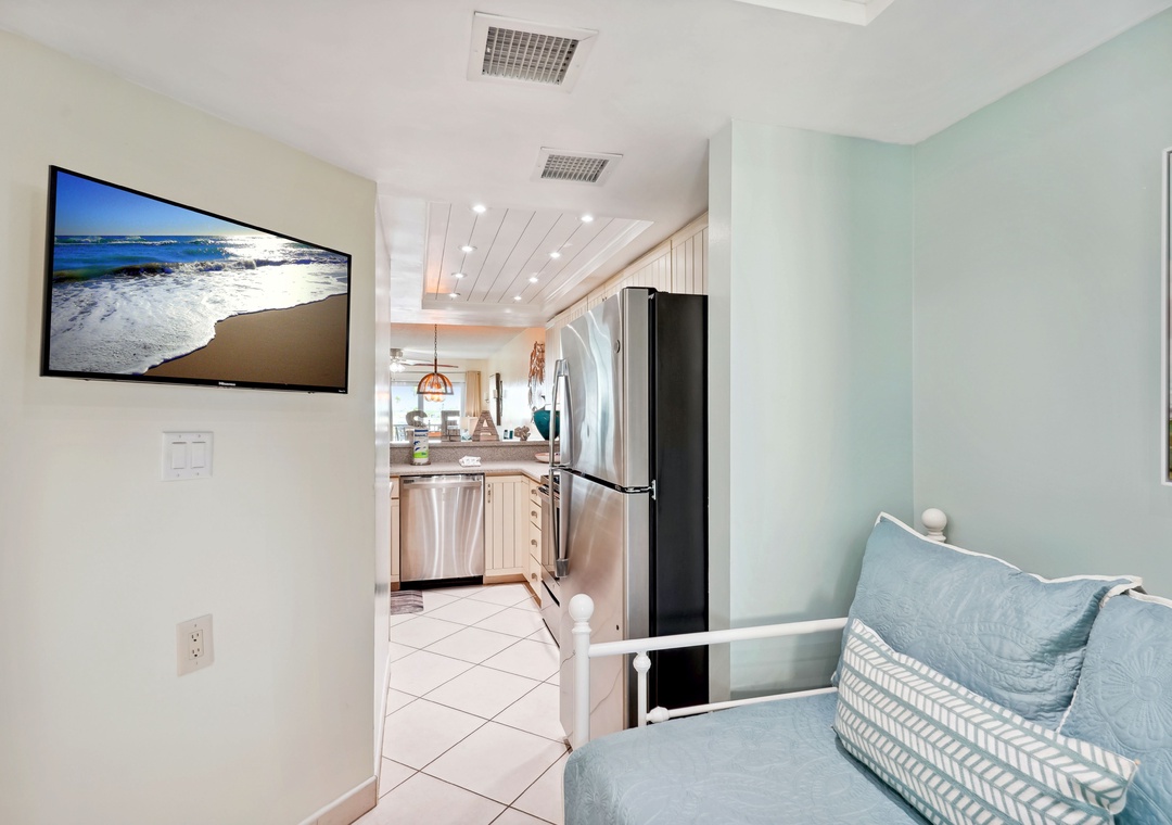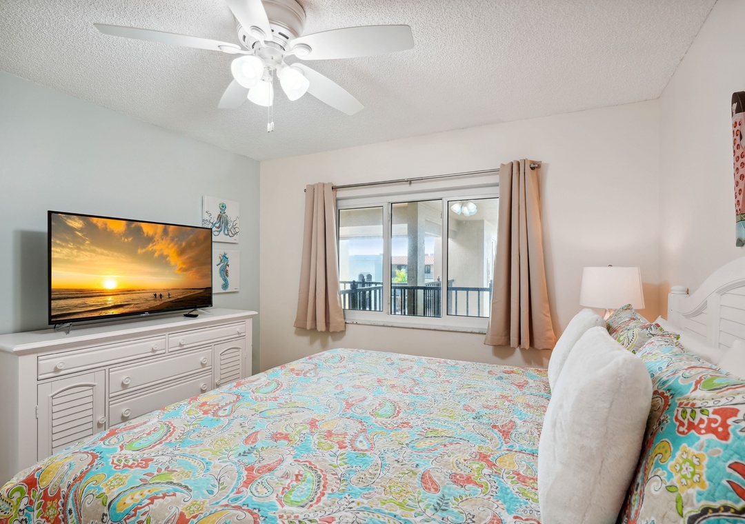 The main bedroom features a cozy king size bed and a large flat screen television so you can relax after a busy day at the beach or pool. The attached bathroom has dual sinks and a beautiful custom shower/tub combo. The guest bedroom offers a king size bed, and the guest bathroom has a walk-in shower. You will find a trundle bed in the common area, which allows this beach home to sleep up to 4 people comfortably.