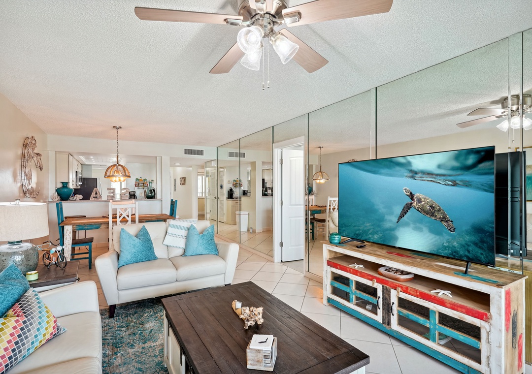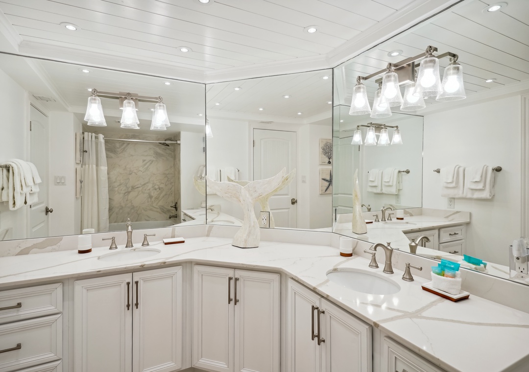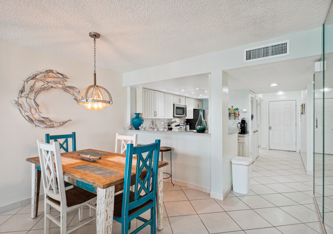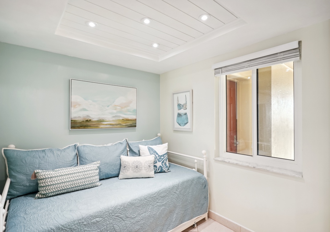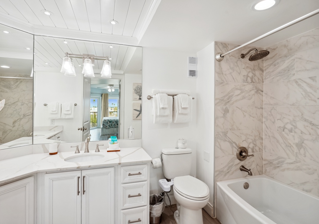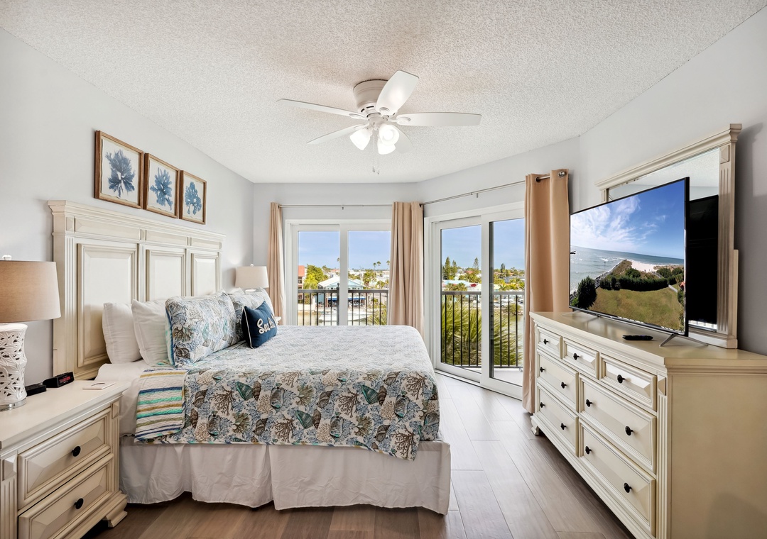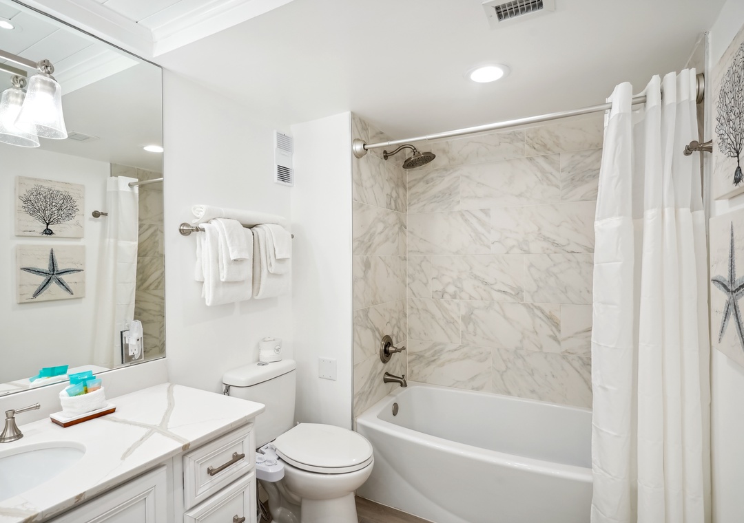 The main bedroom features a cozy king size bed and a large flat screen television so you can relax after a busy day at the beach or pool. The attached bathroom has dual sinks and a beautiful custom shower/tub combo. The guest bedroom offers a king size bed, and the guest bathroom has a walk-in shower. You will find a trundle bed in the common area, which allows this beach home to sleep up to 4 people comfortably.