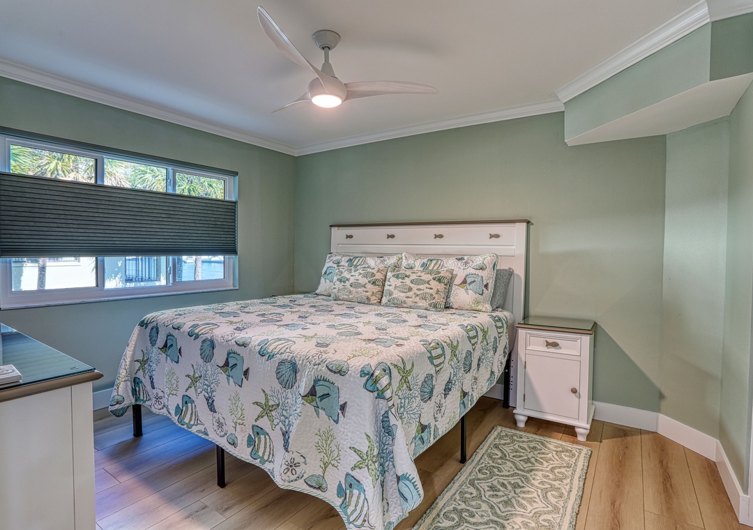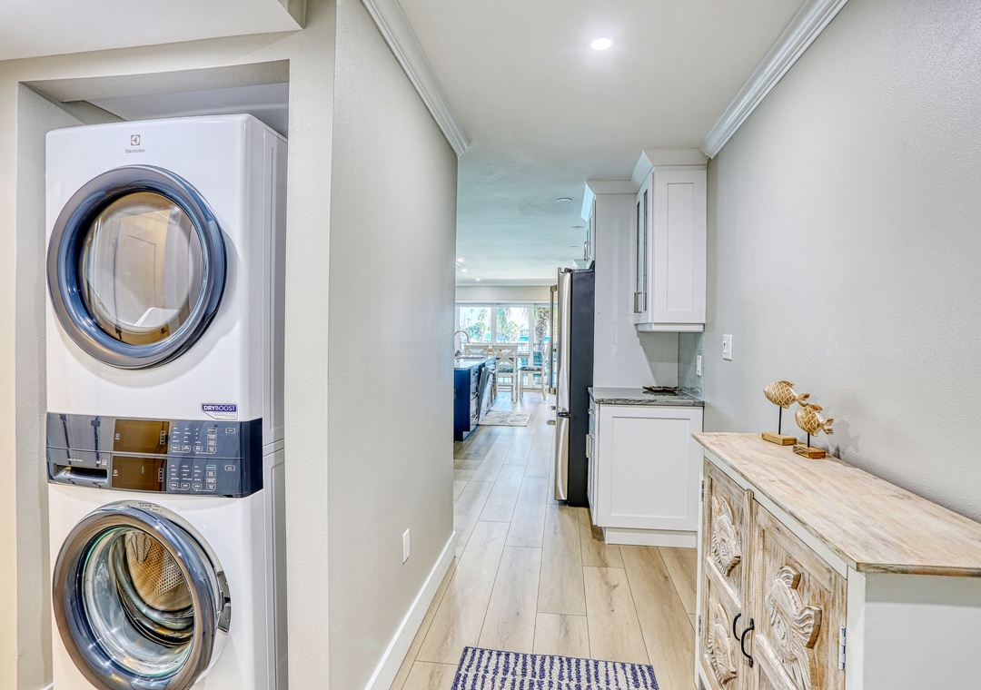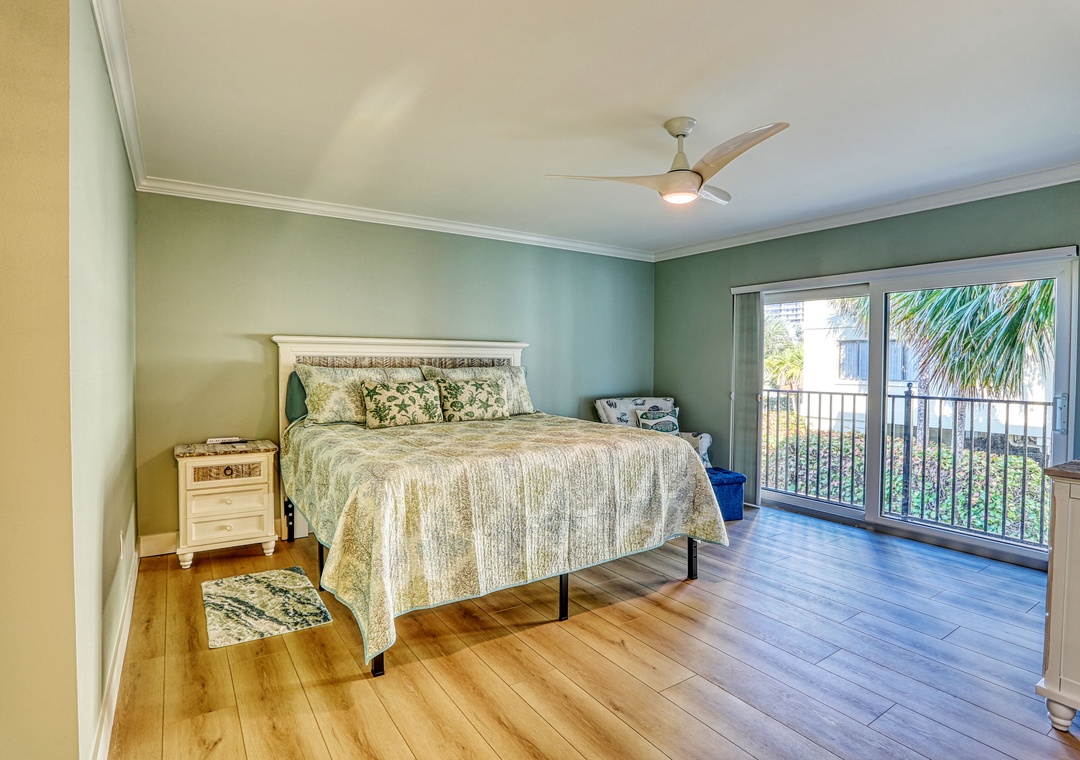 The master bedroom offers a king bed, TV, and a Juliet balcony—slide open the door and take in the refreshing Gulf breeze. Its attached bathroom is stylishly updated with granite countertops and a large walk-in shower featuring beautiful tile work. The guest bedroom also features a king bed, while the guest bathroom mirrors the same modern design with granite and eye-catching tile patterns. New flooring runs throughout the condo, and a washer and dryer are provided for your convenience. Located on the 2nd floor with elevator access, this unit also includes assigned parking within the gated community and free wifi.