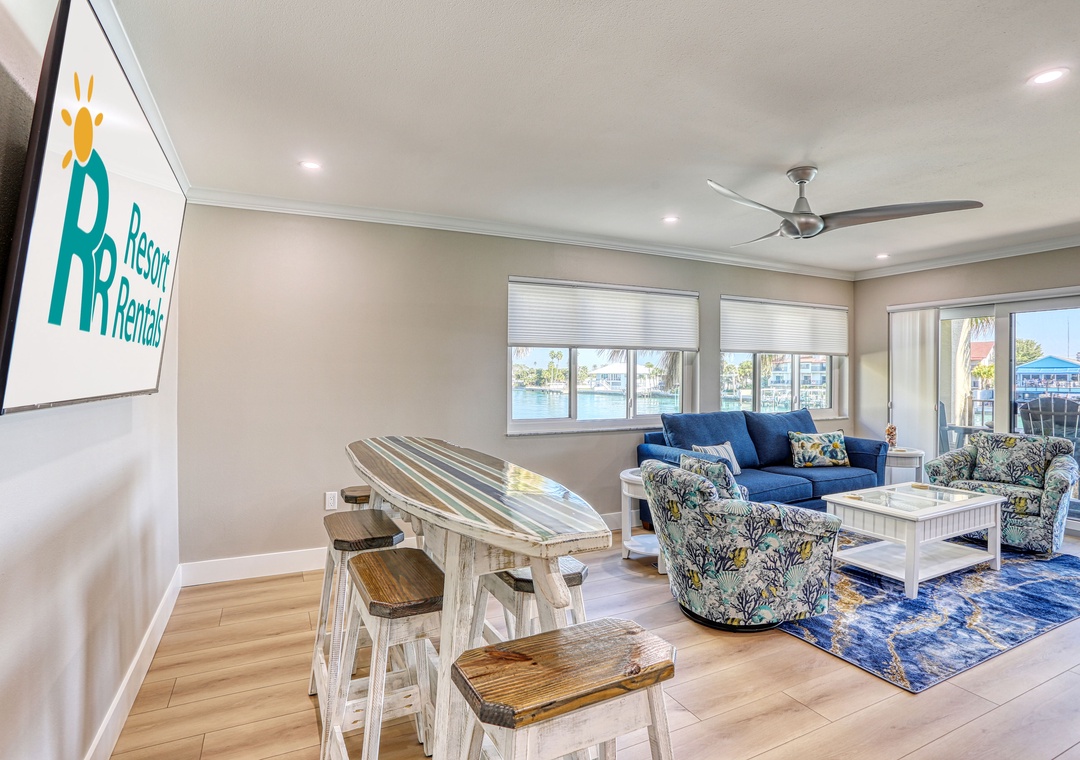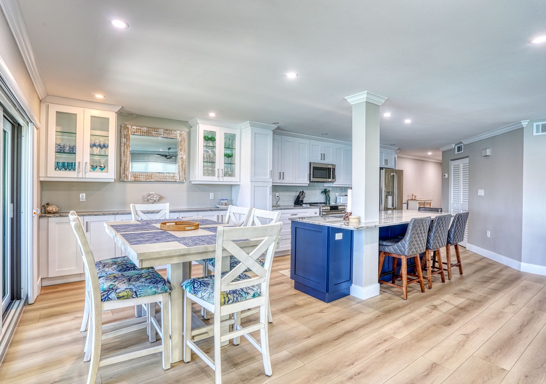 This lovely condo faces the serene Intracoastal Waterway, providing extra interior space and an expanded private balcony only an end unit can offer. Step inside to fresh, modern updates and sleek beach-inspired style. Natural light pours in through balcony sliders and a wall of windows, creating an inviting, open atmosphere. The living room features a comfortable sofa and sitting chairs, a large TV, balcony access, and a high-top table perfect for extra dining space or a nighttime game of cards. The kitchen is fully renovated with stainless-steel appliances, granite countertops, great cupboard space, and a spacious island ideal for meal prep, casual dining, or chatting with the chef. A fully stocked assortment of dishes, cookware, and utensils ensures you have everything you need. The dining table is set and ready for memorable meals with your family and friends.