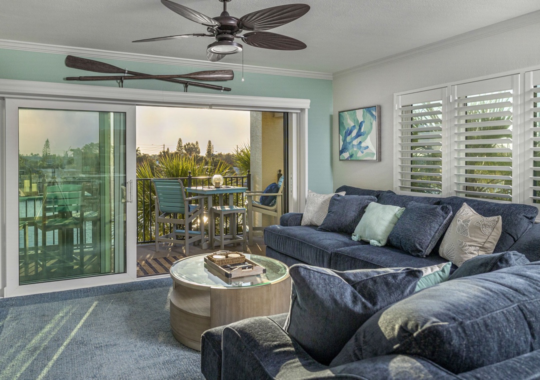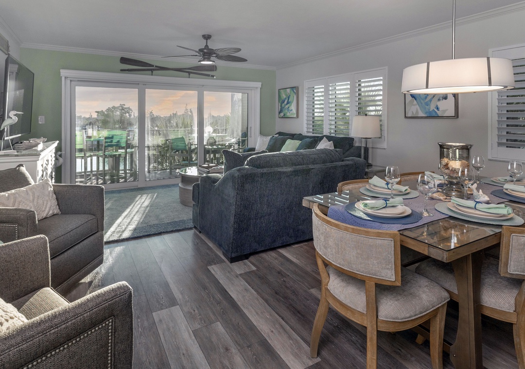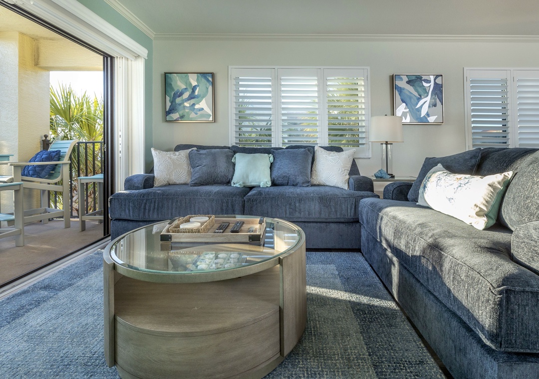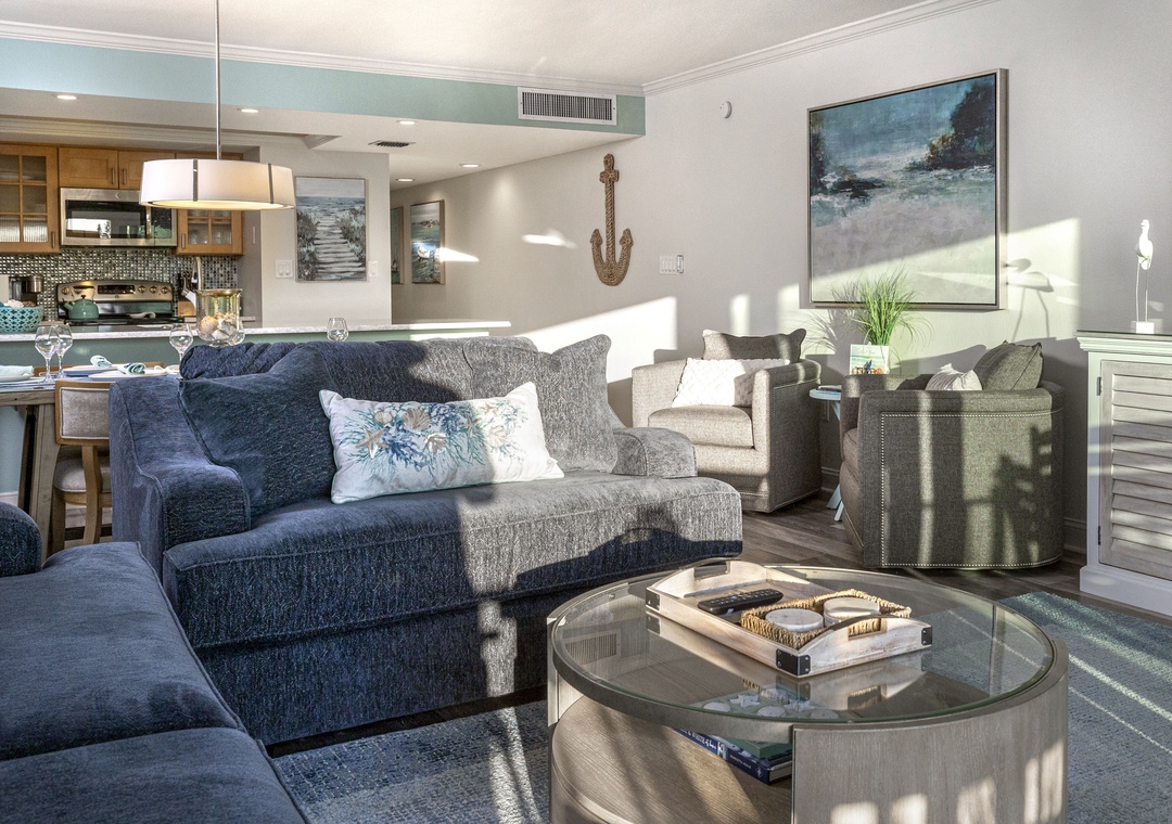 The main bedroom features a comfortable king size bed and a large flat screen television so you can relax after a day at the beach or pool. The attached bathroom has dual sinks and a beautiful custom walk-in shower. The guest bedroom offers two full size Murphy beds, to best utilize the guest bedroom space and the guest bathroom also has a stunning walk-in shower. You will find a Queen size sleeper sofa in the living room area, which allows this bayfront condo to sleep up to 6 people comfortably.