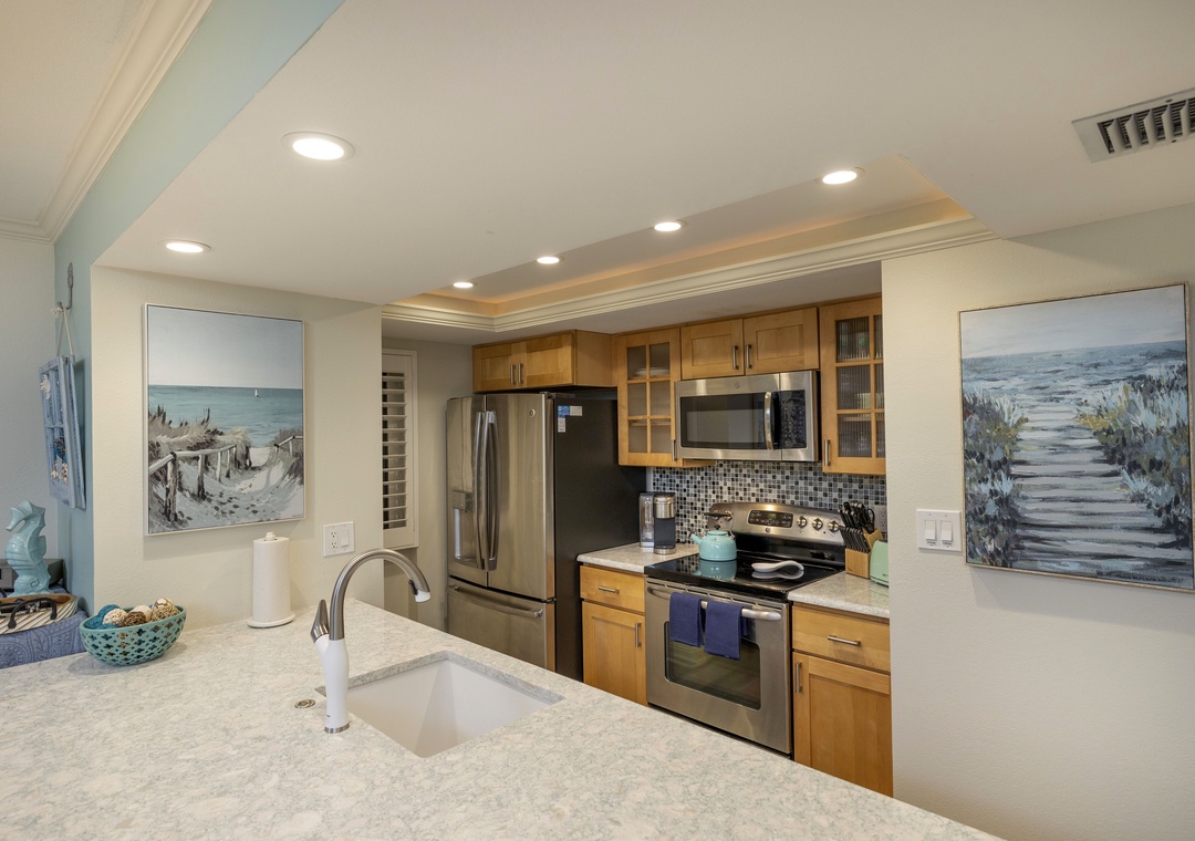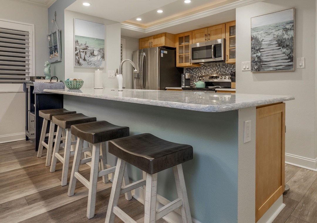 This stunning Bay front Condo has been completely renovated and is decorated elegantly with seaside charm. The unit is cozy enough for two and spacious enough for six; from a romantic getaway to a family-friendly adventure, this unit is perfect for any beach getaway! Take in the spectacular bay views from the private 3rd floor balcony, furnished with comfy chairs and two tables for an unforgettable outdoor dining experience. Enjoy the sunrise with a cup of coffee while watching all the wildlife fly by and swim by in and over the Bay. For those coming from cold weather who desire fresh warm air the windows open and the sliding glass doors stack open. Relax in the warm rays of the sun by the shore, lounge around by the outdoor pool, or hang out inside while you socialize. The interior won’t disappoint! The kitchen is fully equipped with Quartz countertops and stainless-steel appliances. Pair that with the buildings AMAZING amenities for a vacation you will never forget.