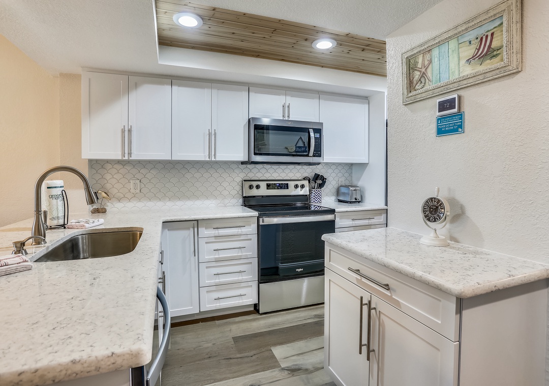Wonderful updates and fresh décor plus a great view from your private balcony make this a spectacular vacation condo. The kitchen has been renovated and is fully equipped and ready for some amazing creations! This condo has a washer and dryer for your use, laminate and tiling flooring throughout, free wifi and so much more! Building #4 is across the waterway from St Pete Beach so kick your feet up and watch the action go by! This building is situated nicely near one of the hot tubs on property, close to the BBQ area and is a very easy walk to the pool and beach access onsite!