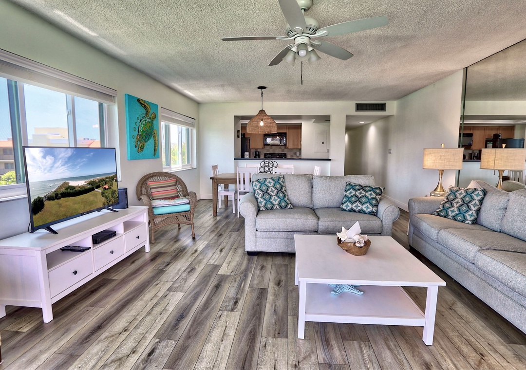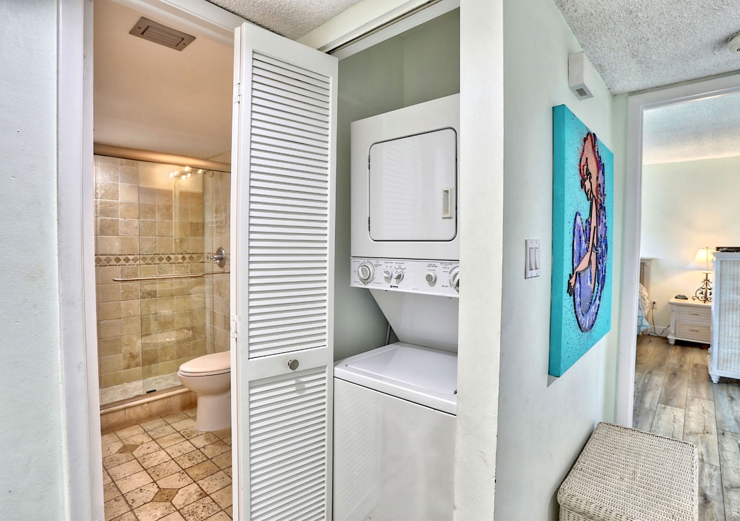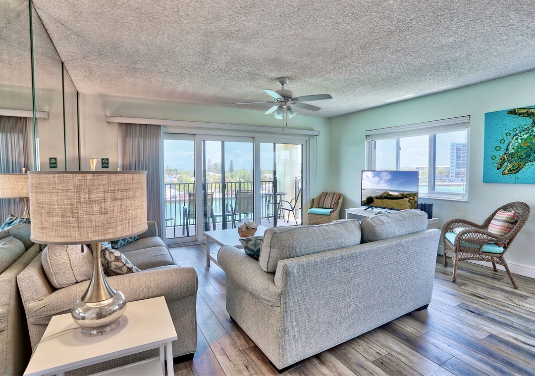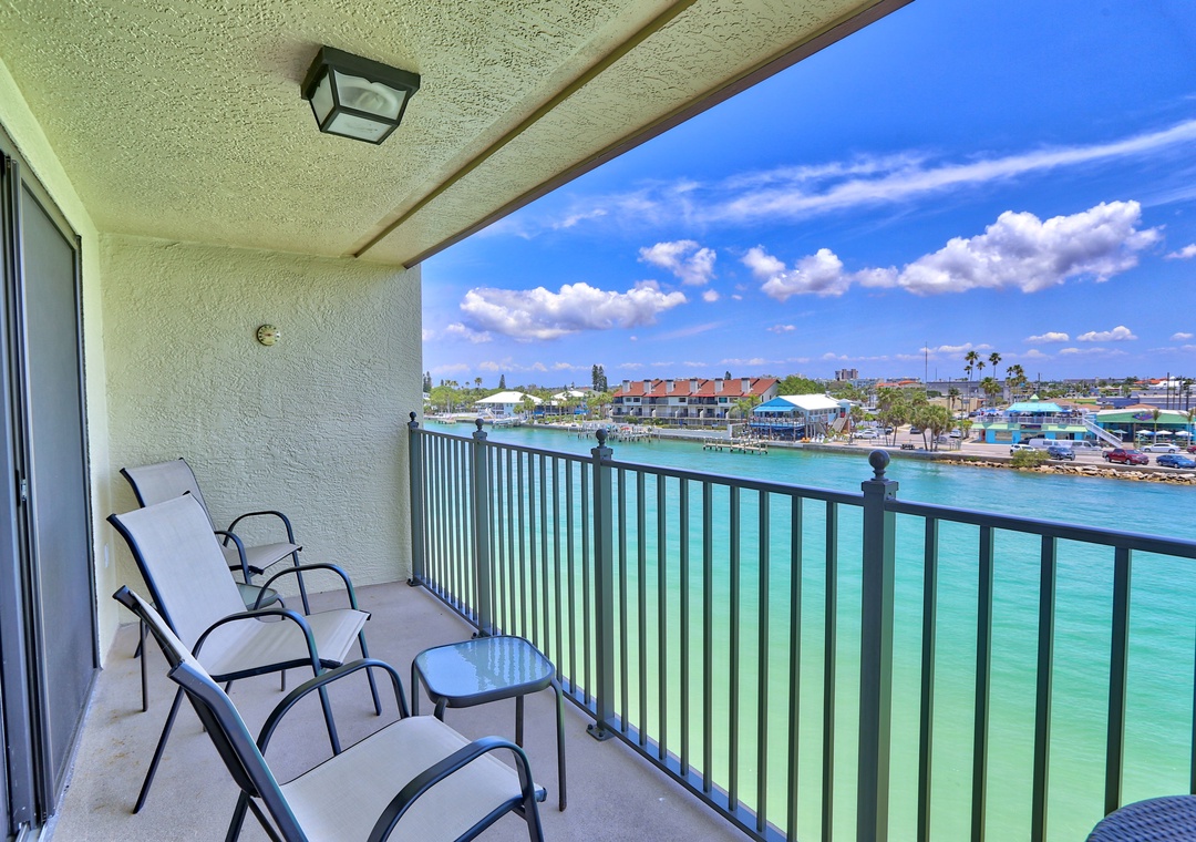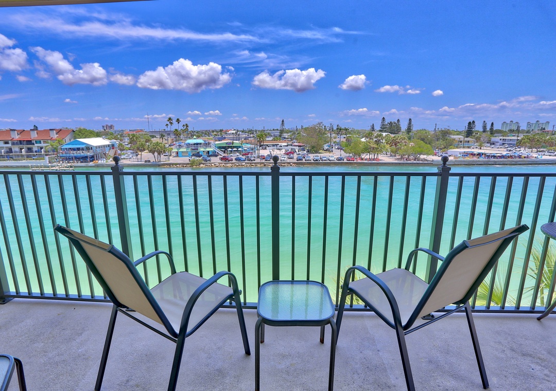 This is a very nice, top floor, south corner condo with an updated kitchen that is fully stocked and ready for your use, washer and dryer inside for you, private balcony off of the living room with direct views of the Intracoastal waterway, big windows in the living room and dining room area that let in lots of extra light, free internet service and unlimited calls to US and Canada and much more! Building #4 is across the waterway from St Pete Beach so kick your feet up and watch the action go by! This building is situated nicely near one of the hot tubs on property, close to the BBQ area and is a very easy walk to the pool and beach access onsite!
