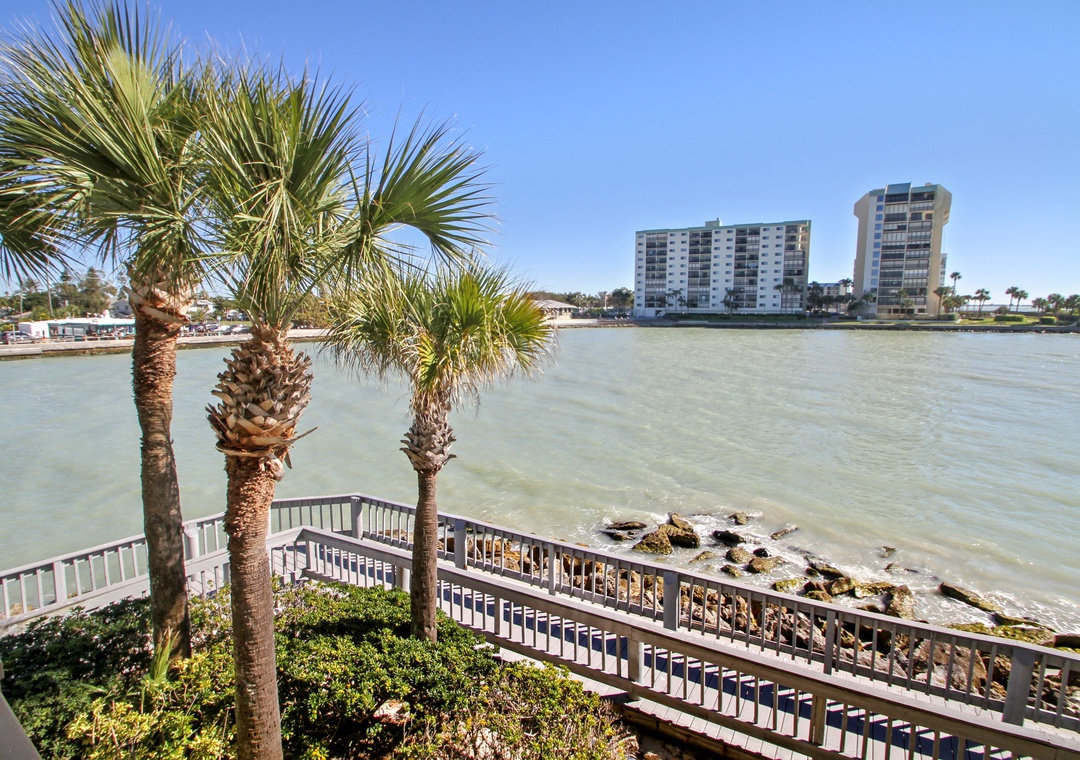 Land's End is a gated waterfront community in Treasure Island, nestled at the end of a peninsula and surrounded by water on three sides. To the east, it borders a channel of the Intracoastal Waterway, while the Gulf of Mexico lies to the west, and Blind Pass to the south. Residents can enjoy stunning views of boats passing through the channel, with dolphins and manatees often spotted nearby. The community features 10 buildings and a range of amenities, including a large, heated pool, hot tub, tennis and pickleball courts, sand volleyball, shuffleboard, gazebos, and a BBQ grilling area. Direct beach access onsite for all offers a perfect blend of relaxation and recreation for anyone.