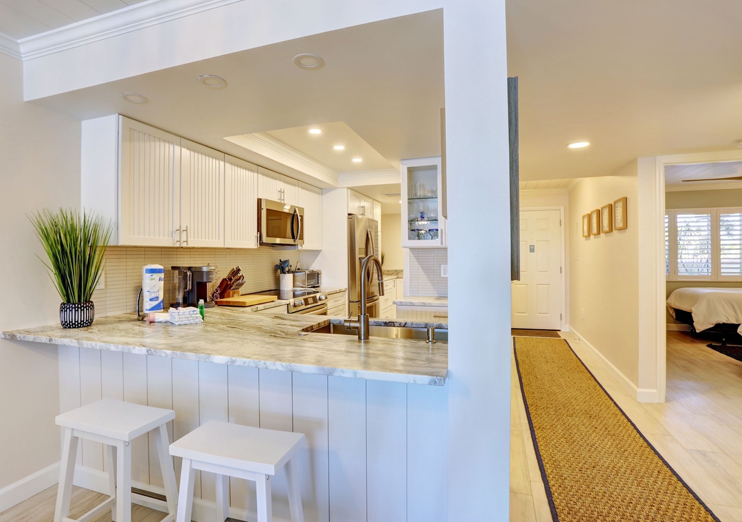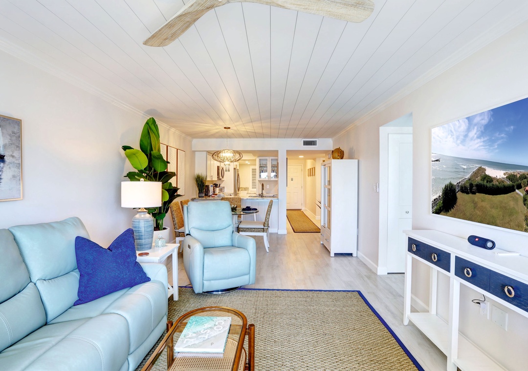 Wonderful super clean and wonderful furnishings. Recliner sofa and chair with lumbar support; two walk in showers with great water spray and lots of counter space/drawers. Kitchen fully stocked with everything you need but bring your own dish soap, sponge and extra tall trash liners. Bring your own coffee and Spices, Beach towel, laundry detergent, dishwasher pods, bath soap, shampoo and conditioner. Toilet tissue and hand soap were furnished but cheap stuff. Also two low seating beach chairs, large beach umbrella, kids sand toys and a few water styrofoam floats are available to use. Large pool available; great shells on beach to collect as well as great sunsets on the beach.