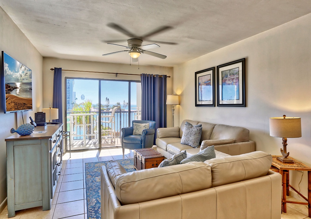 Located on the tip of the island, this 2 bedroom/2 bathroom condo boasts amazing views of the Gulf of Mexico, Blind Pass and the Intracoastal waterway; you can’t get any closer to the water than this!! This fabulous unit offers ample space to sit back and enjoy your Florida vacation as both the master bedroom and the living room area will provide you access to the private balcony. There are 2 king sized beds in this unit making this a lovely choice for those looking for that larger bedding arrangement! The light and bright decor coupled with the mixture of cool tile and warm bamboo floors throughout beckon you to relax and unwind. Prefer to dine in for the night? The state of the art, fully equipped kitchen will stir up your inner chef. Other amenities include a washer and dryer, flat screen TV’s in the living area as well as both bedrooms and wireless internet service. Building #5 is unique in that it sits at the very end of the property on the tip of the peninsula and provides awesome views of the Gulf of Mexico! This building is right next to the beach access and only a short walk to the pool and other onsite amenities provided.