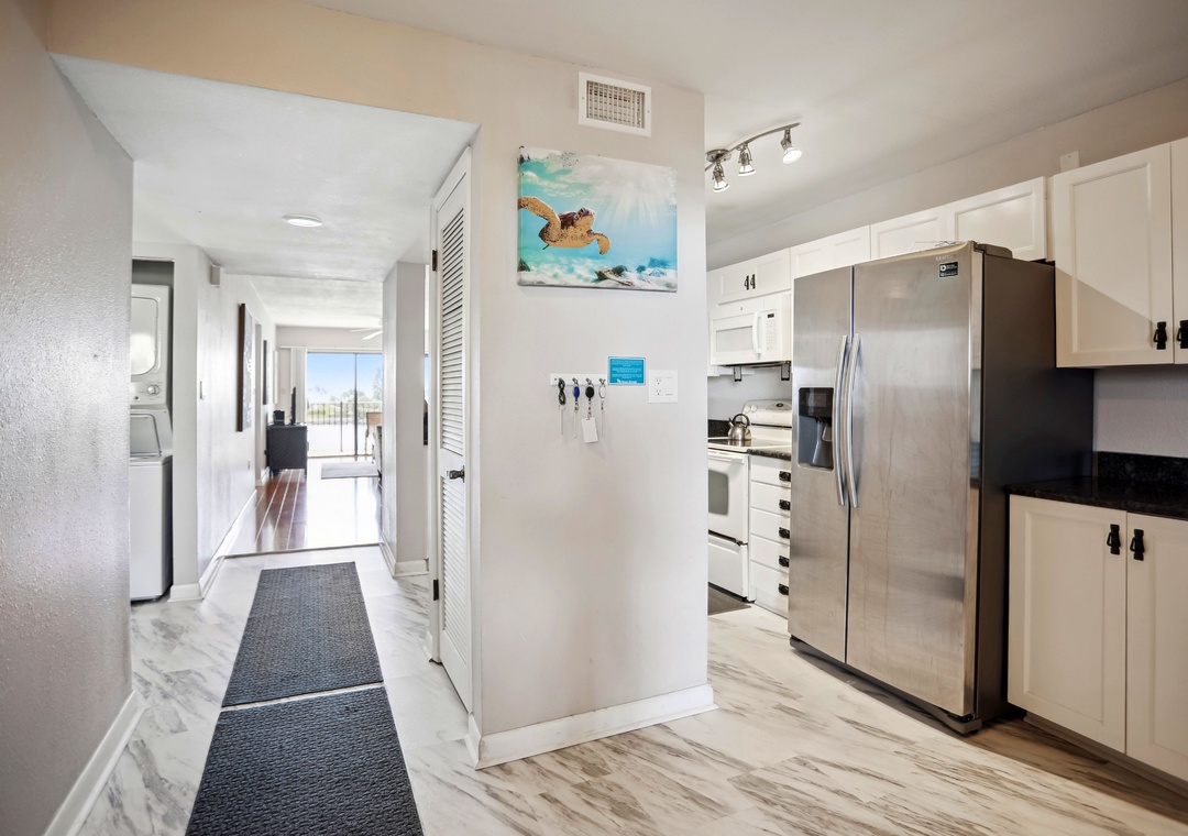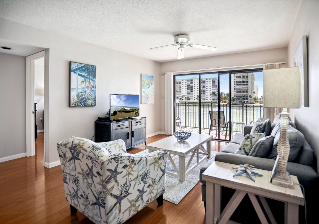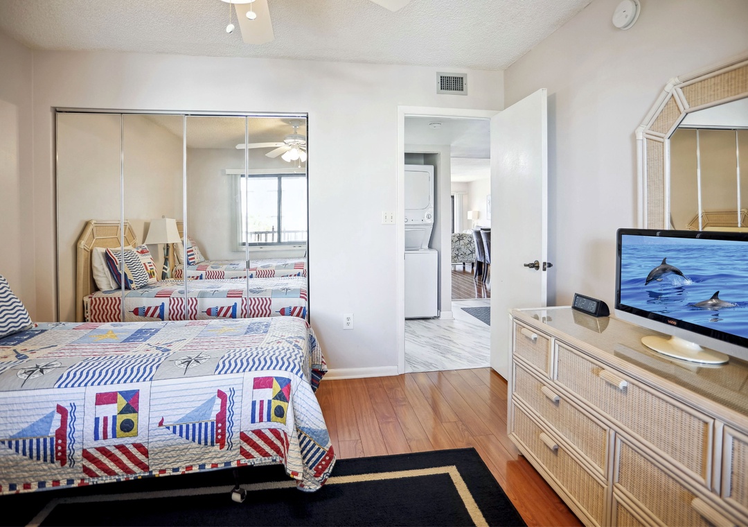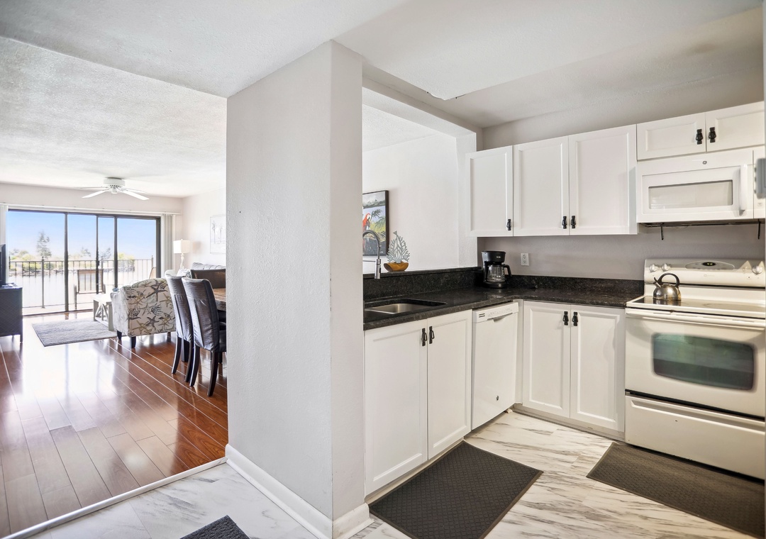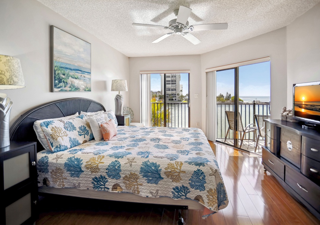 If you prefer a unique view, this condo is located on the very tip of the island. The breathtaking view from the private balcony and the master bedroom is of Blind Pass (the opening between the Intracoastal Waterway and the Gulf of Mexico. You may see dolphin, sea birds and boats on the water right outside your sliding doors as the tide moves in and out of the Pass. The fully equipped, newly renovated kitchen features granite counter tops and state of the art appliances. Everything you need to prepare a delicious meal for the family! The condo has stunning wooden floors throughout. Washer/Dryer in the condo, free Wifi and free parking is available. Plus, you just walk across the property to the beach.