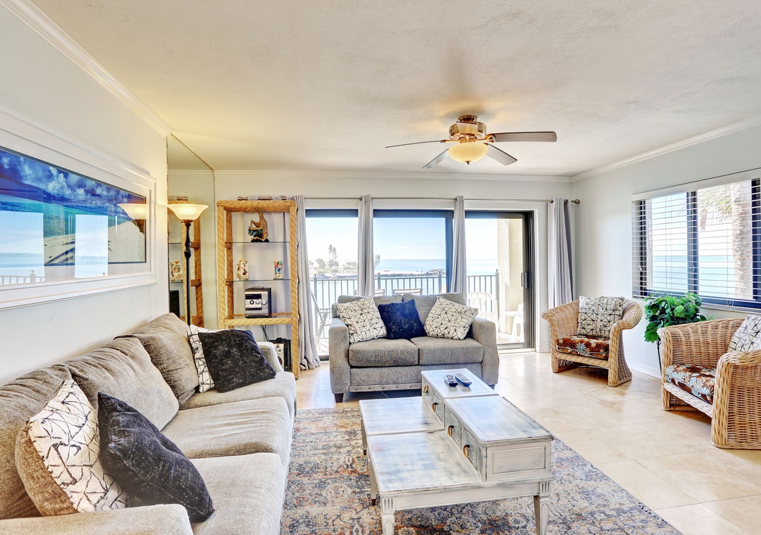 Inside, the condo is beautifully decorated with tropical décor and offers plenty of space to unwind. The well-equipped kitchen is stocked with dishes, utensils, cookware, and updated stainless steel appliances, making it easy to prepare meals at home. Enjoy dining at the table or extra seating at the kitchen counter. The private balcony off the living room is the perfect spot to relax and soak in the coastal scenery.