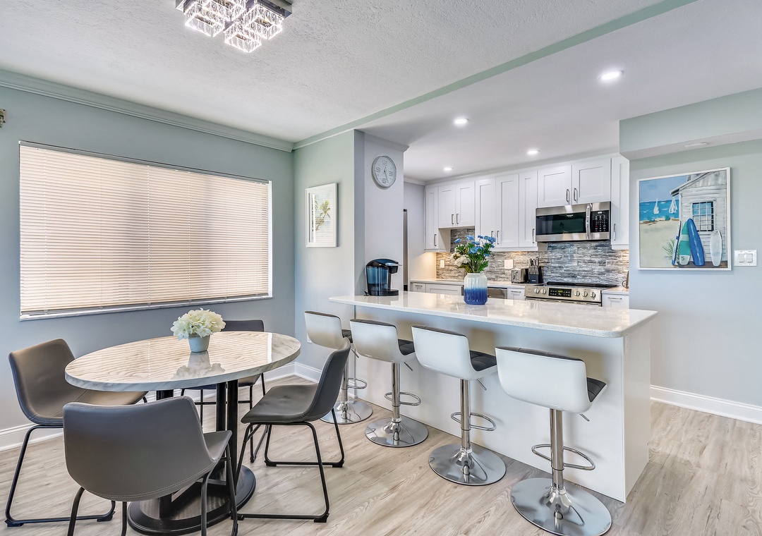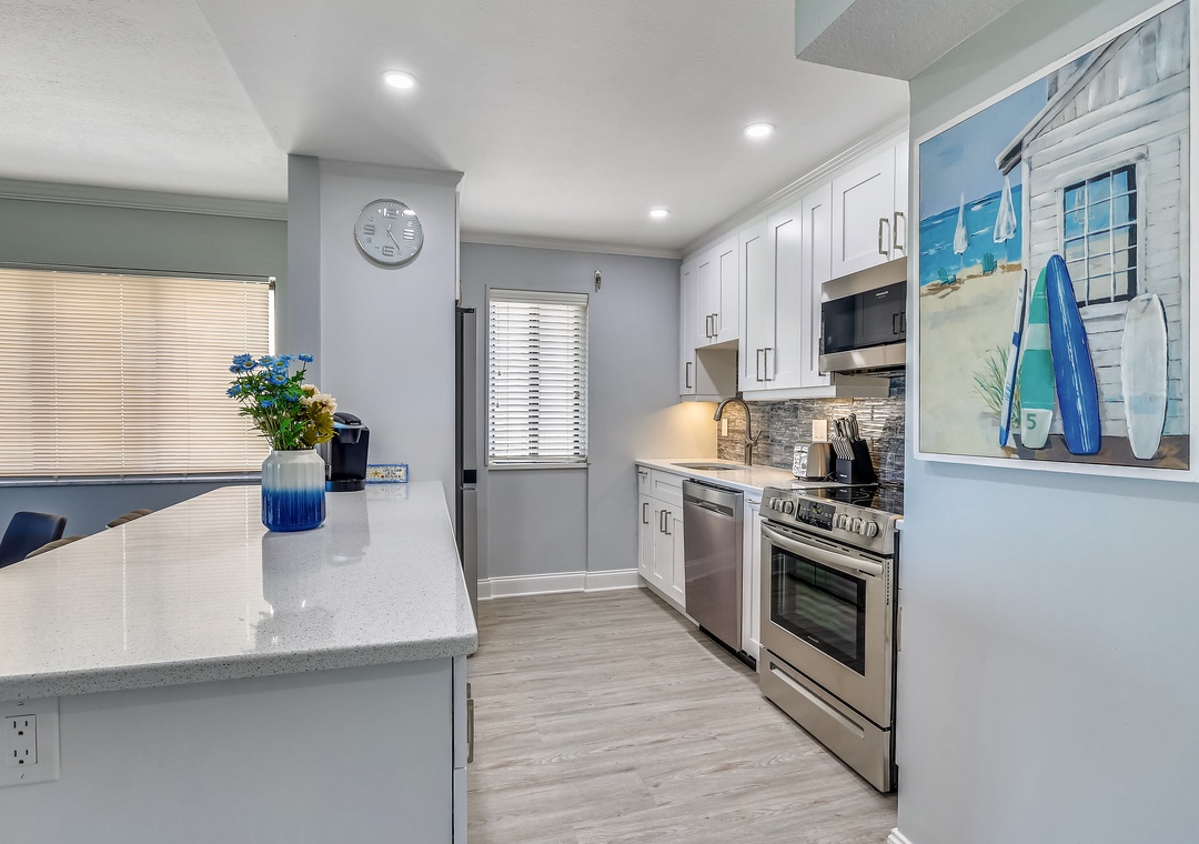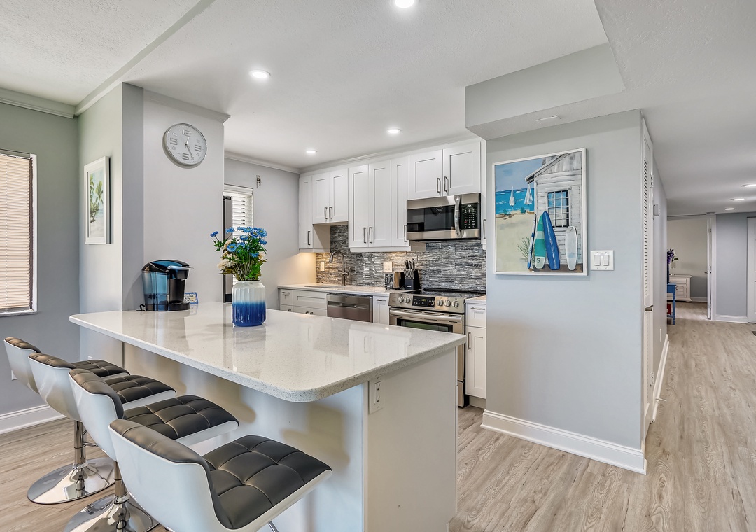 This completely remodeled, modern and bright condo features a brand new, fully equipped kitchen with state-of -the-art stainless steel appliances, granite countertops and an island for preparing meals, seating and entertaining. Beautiful new flooring throughout and the tasteful decor will make you feel right at home from the moment you walk in. Both bathrooms feature granite counter tops large walk in showers. Your private balcony faces the Gulf of Mexico and is a perfect spot for watching the beautiful Florida sunsets. You have miles of white sand beach to explore. Located in the popular Sunset Beach neighborhood, this lovely condo has wireless internet service.