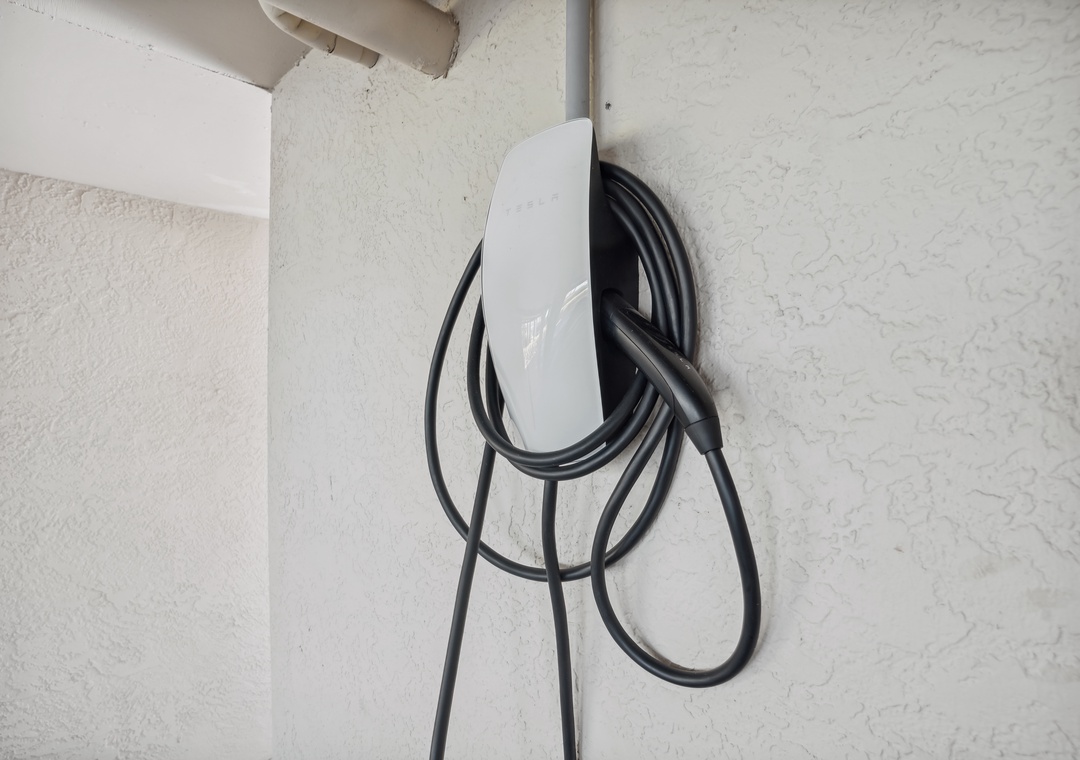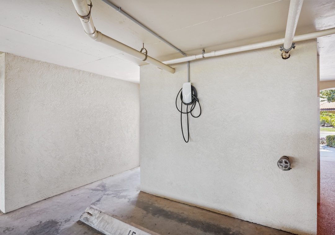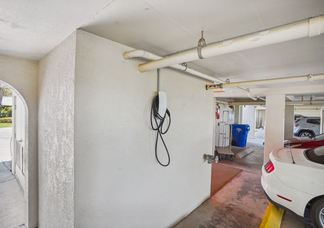 This condo's parking space is equipped with an electric Tesla charger!