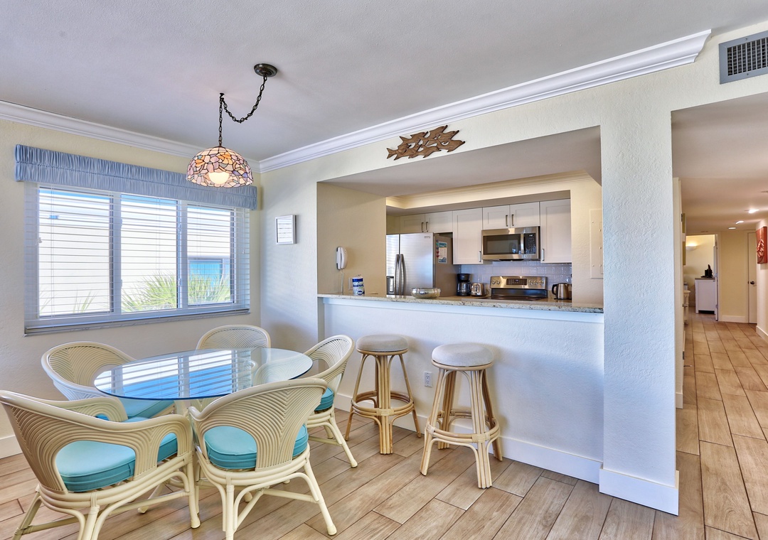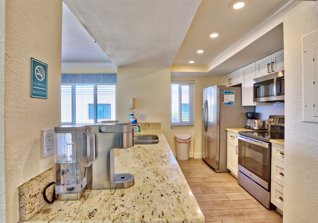 This top floor corner unit with its light and bright coastal décor offers you the chance to experience true Florida living at its best. Gather together in your spacious living room while planning your vacation fun or venture out to your private balcony and absorb the magnificent hues in the sky as the sun sets into the Gulf. The up-to-date kitchen is fully equipped with a Keurig coffee maker and stainless-steel appliances. Other amenities include a TV in each bedroom, wifi services and a washer/dryer in the unit for added convenience.