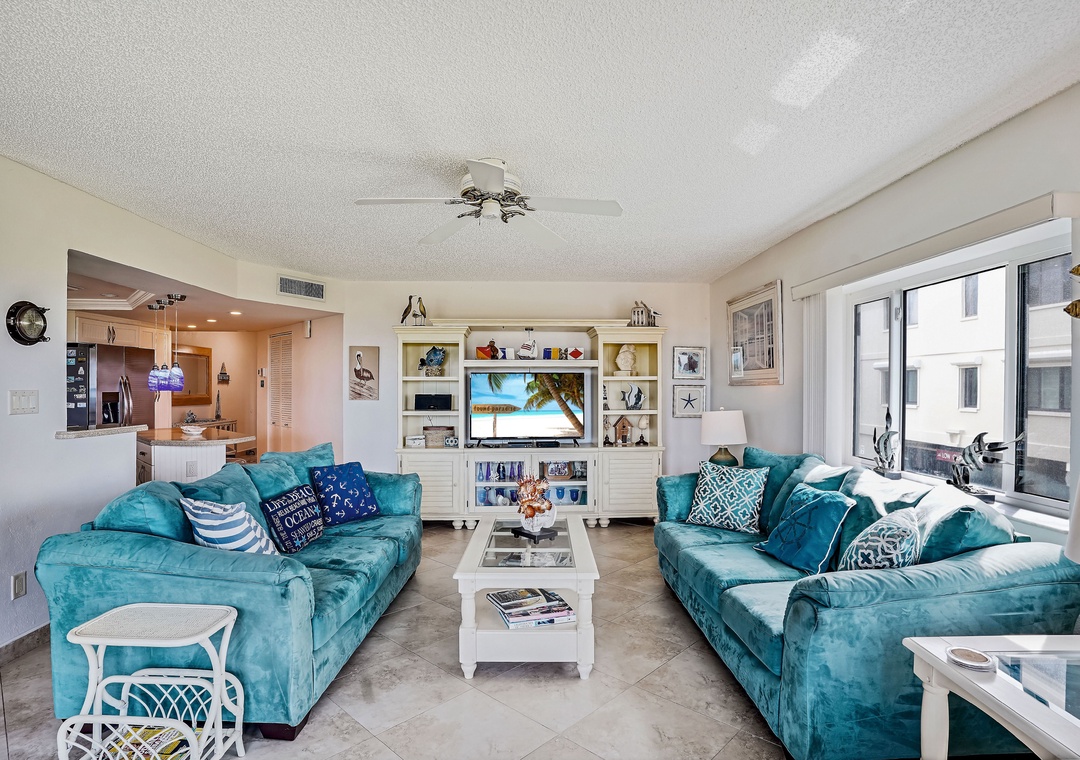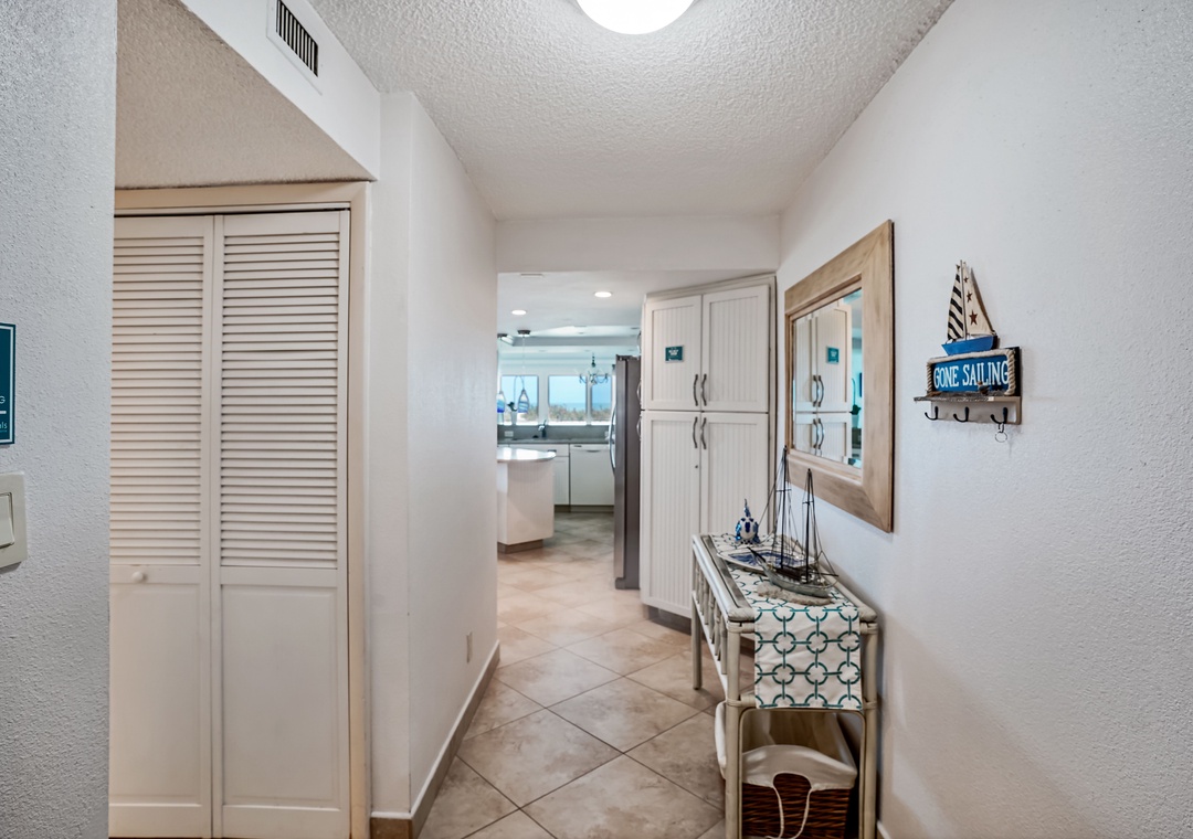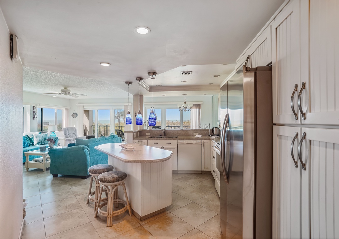 This fantastic south corner beachfront unit is the perfect place to kick back and enjoy your vacation. The light and bright nautical décor creates the perfect background for you to enjoy the best the beach has to offer. Your private balcony coupled with the additional windows create fabulous sunsets for your viewing pleasure. The spacious living room and newly remodeled, open kitchen allows plenty of gathering room for the whole gang. The kitchen is fully equipped and there is a washer and dryer for your use. Other amenities include a TV in each bedroom and wireless internet service and free nationwide calling. Building #9 is located right next to the large swimming pool and Jacuzzi tub onsite.