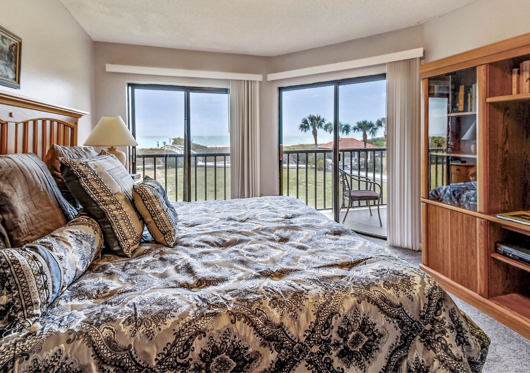 Escape to paradise in this beautiful 2-bedroom, 2-bathroom beachfront condo at Land's End. Enjoy the lovely updates throughout this condo, including a full stocked kitchen ready for you to create in! The master bedroom has a comfy King sized bed, along with balcony access and ensuite. The master bathroom boasts a brand-new walk-in shower, adding an extra touch of luxury to your beach retreat! The guest bedroom has 2 full sized beds for your groups comfort, and the bright living room area with beachfront balcony will be the perfect place to gather and unwind. Building #9 is located right next to the large swimming pool and Jacuzzi tub onsite.