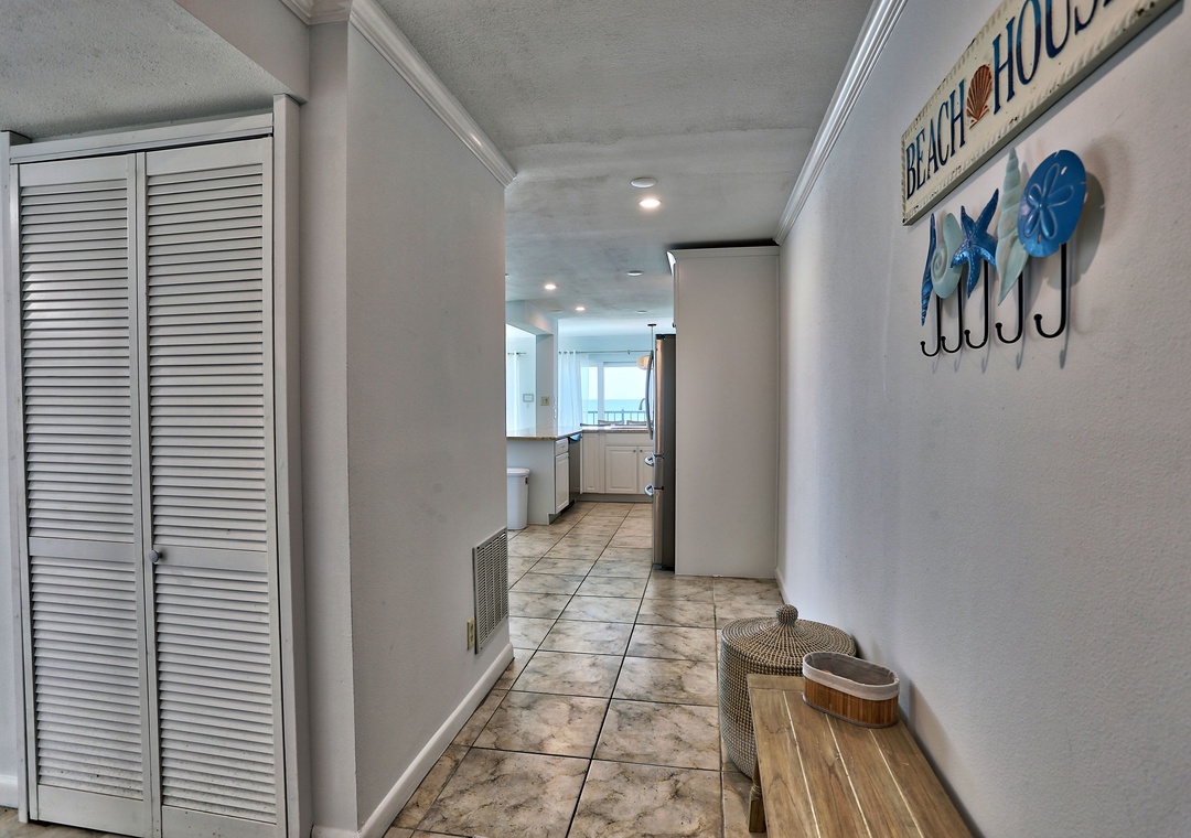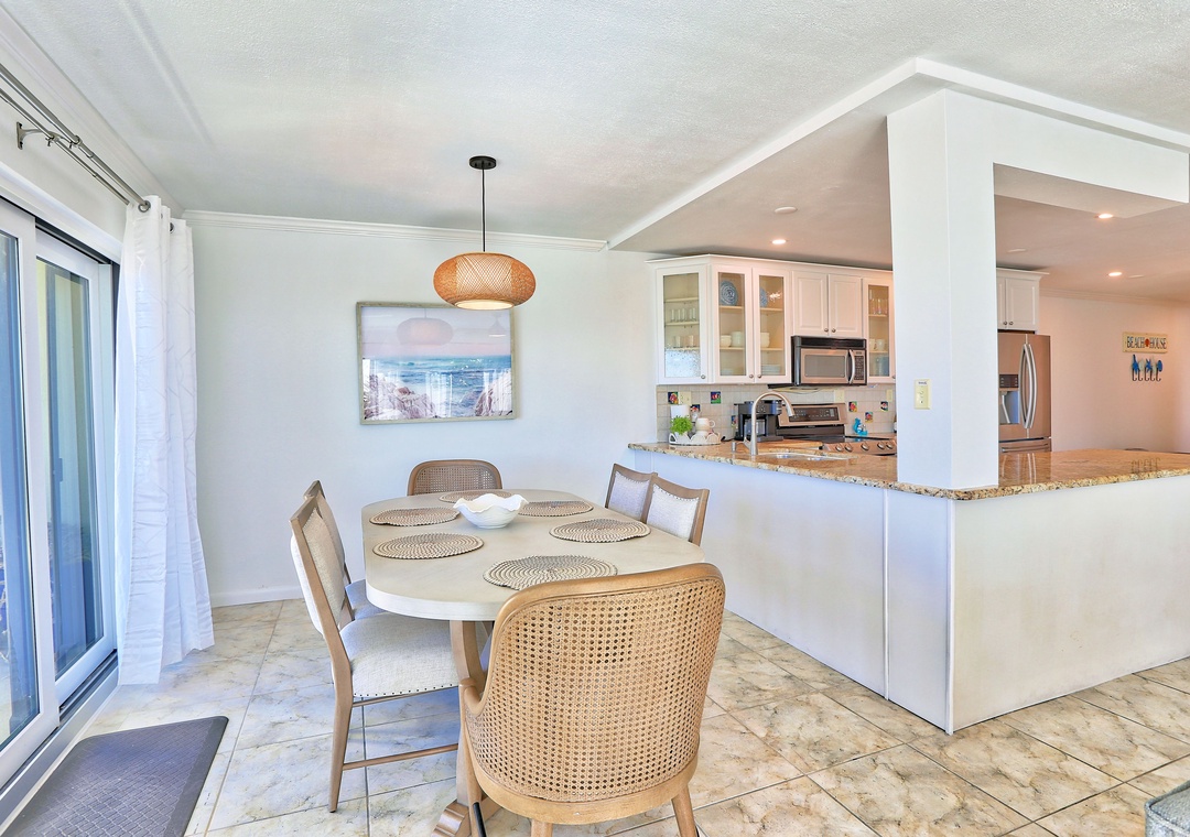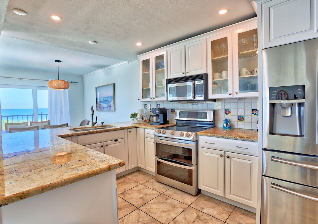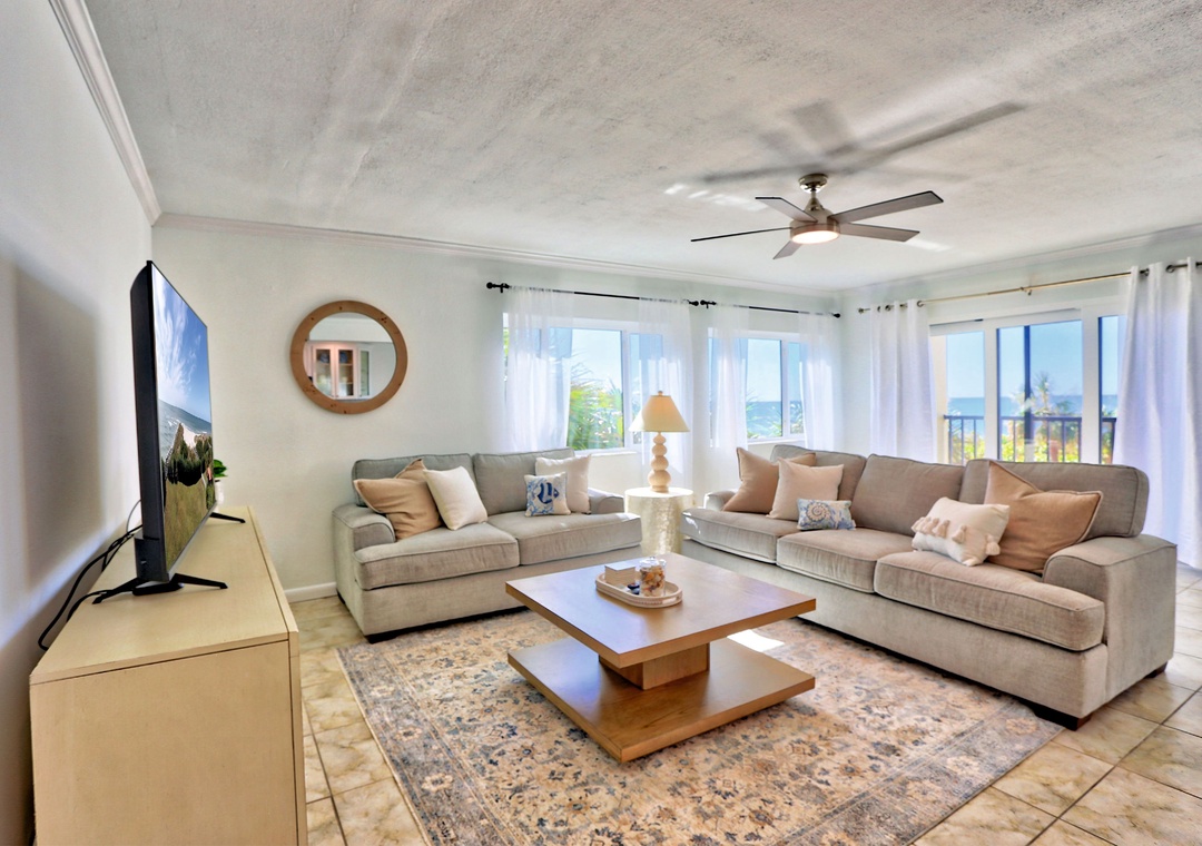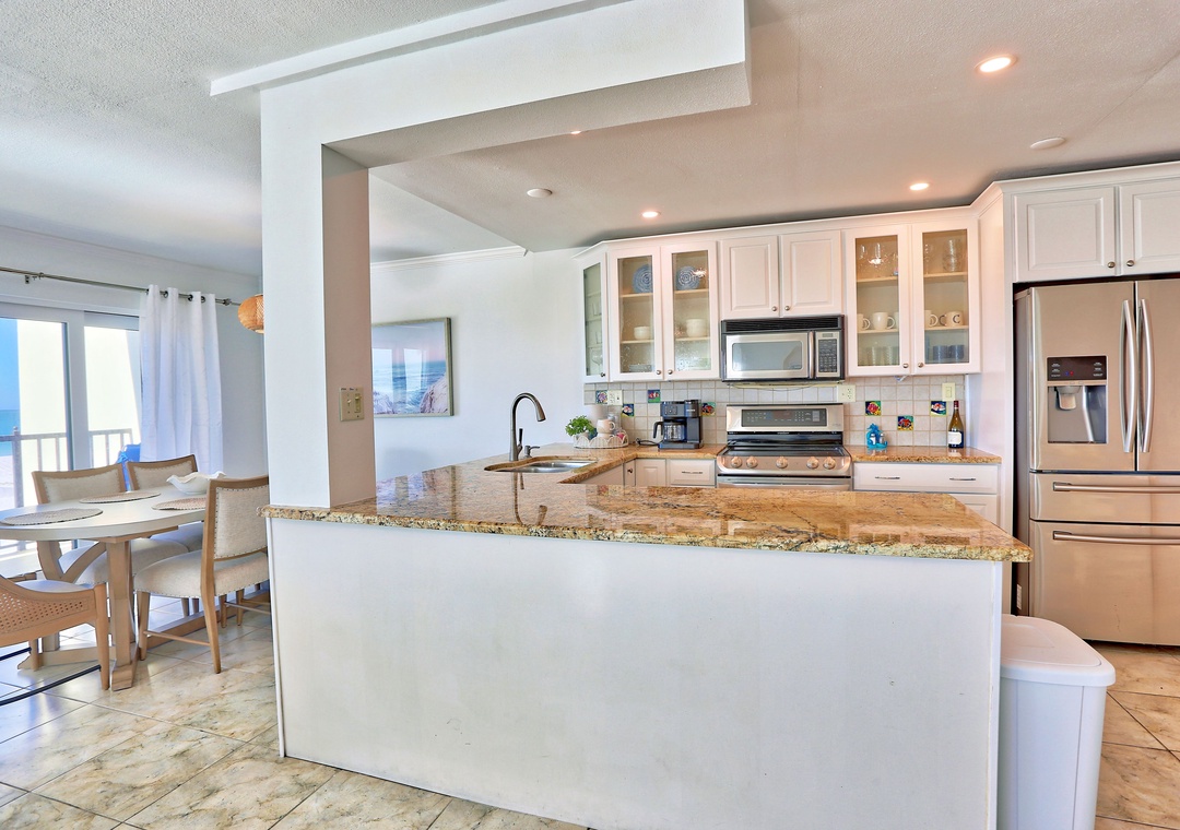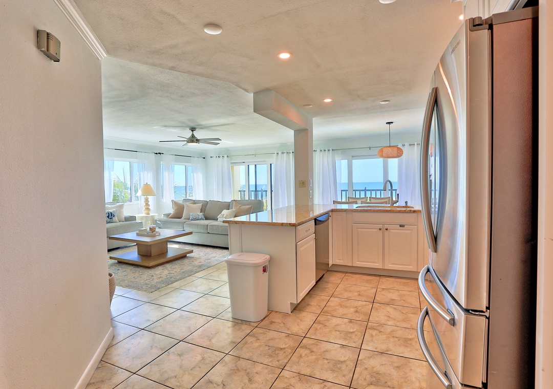Welcome to Land's End 9-301! This beautiful 2-bedroom, 2-bathroom condo is the perfect beach retreat. As an end unit, it features a wider private balcony with stunning beachfront views and the opportunity to watch a breathtaking sunset every night. The open living area is both spacious and inviting, with comfy couches, a dining table that comfortably seats all, and easy access to the balcony. The fully equipped kitchen offers plenty of counter space, stainless steel appliances, and all the cookware, dishes, and utensils needed for preparing meals at home.