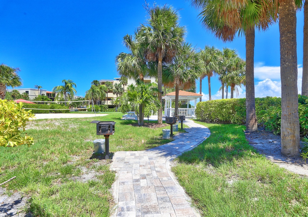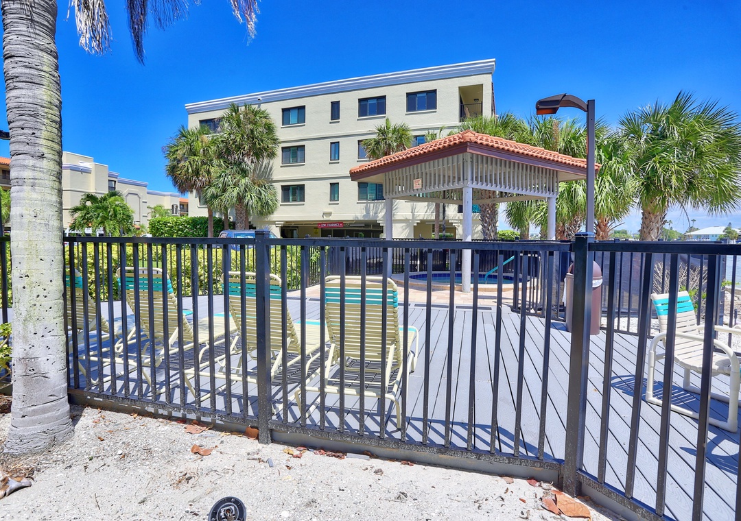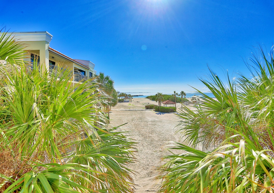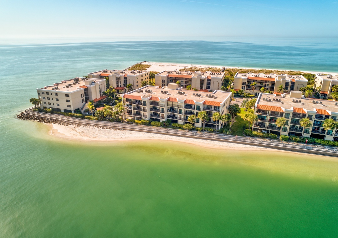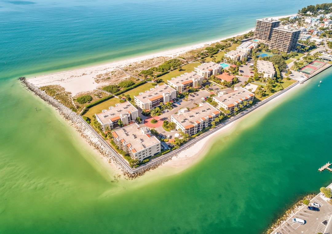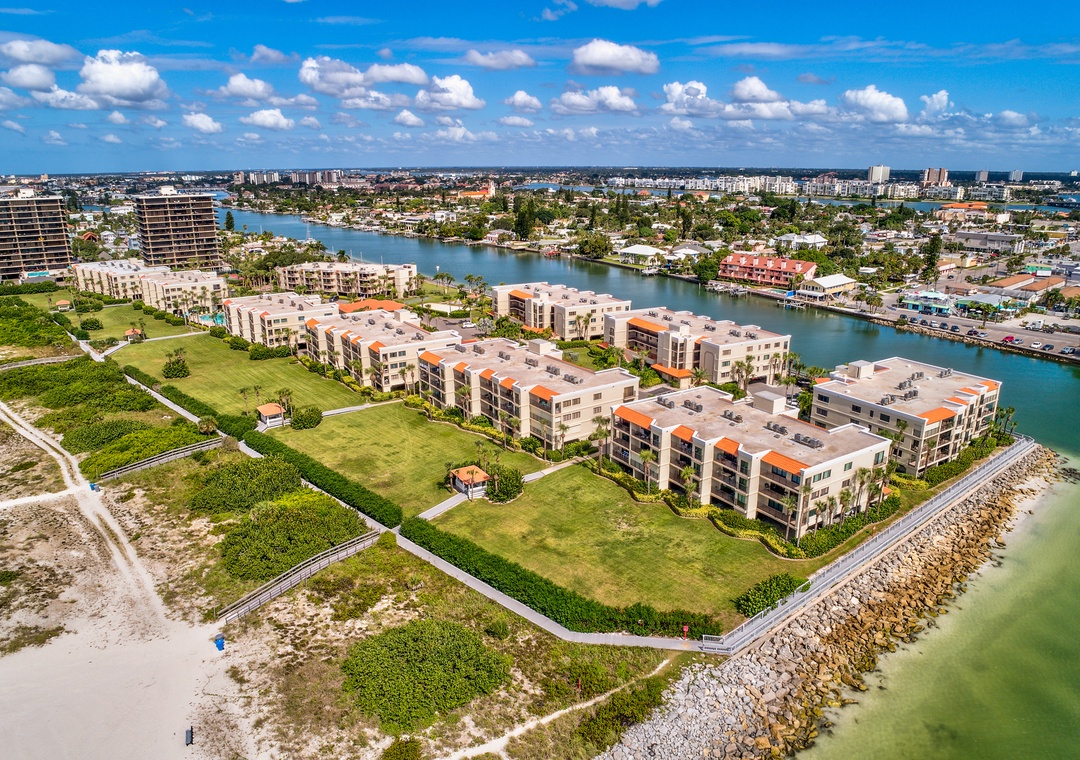 Land's End is a gated waterfront community in Treasure Island, nestled at the end of a peninsula and surrounded by water on three sides. To the east, it borders a channel of the Intracoastal Waterway, while the Gulf of Mexico lies to the west, and Blind Pass to the south. Residents can enjoy stunning views of boats passing through the channel, with dolphins and manatees often spotted nearby. The community features 10 buildings and a range of amenities, including a large, heated pool, hot tub, tennis and pickleball courts, sand volleyball, shuffleboard, gazebos, and a BBQ grilling area. Direct beach access onsite for all offers a perfect blend of relaxation and recreation for anyone.