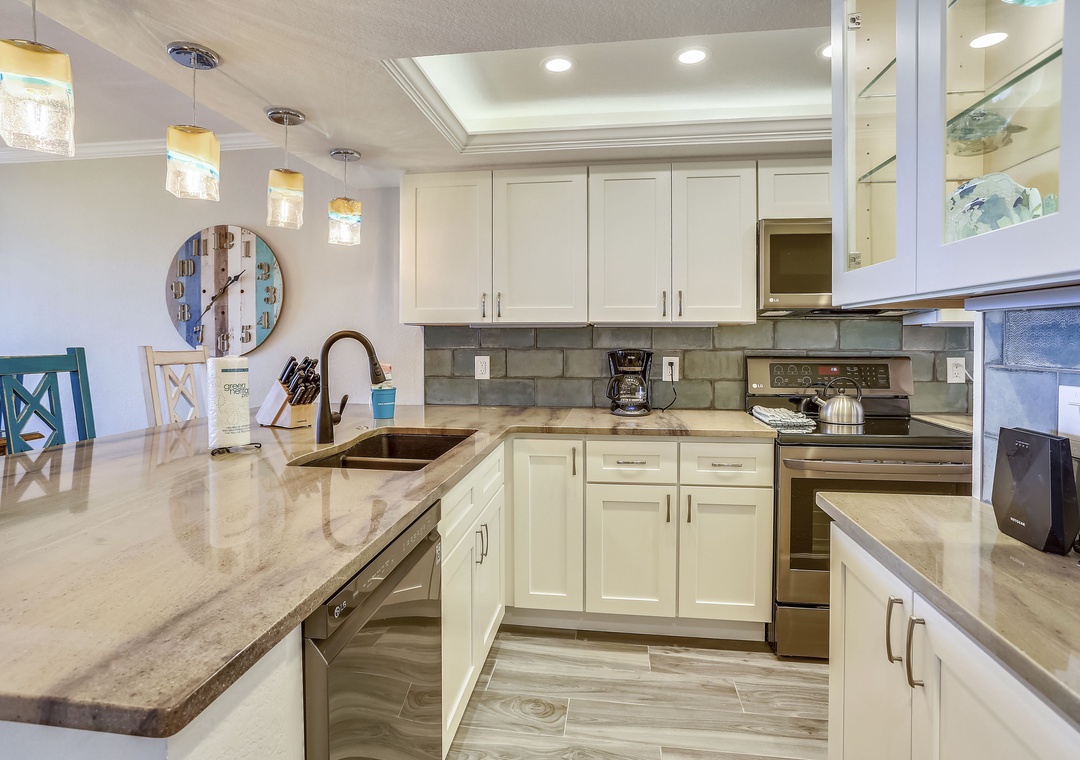 The kitchen is very well equipped!! All new appliances and a wine fridge. Just awesome. Note, they have a regular coffee maker, no Keurig, so get coffee grounds.