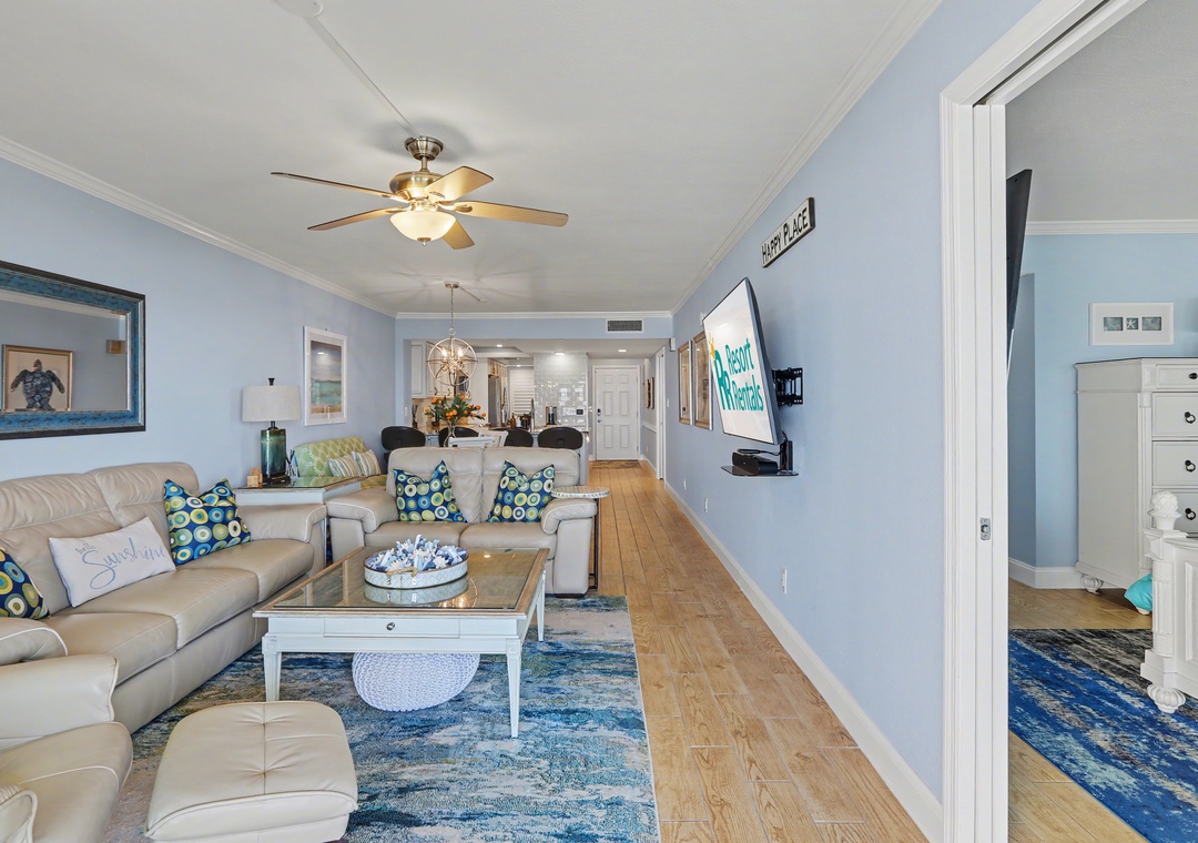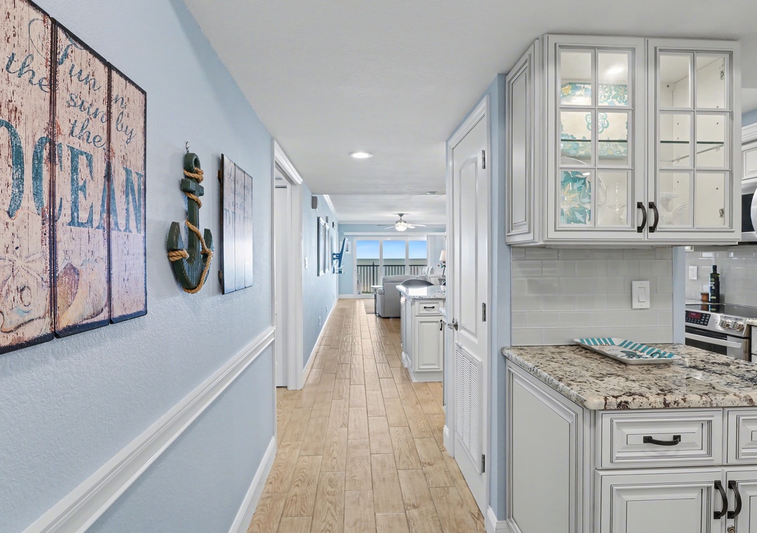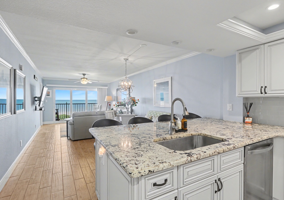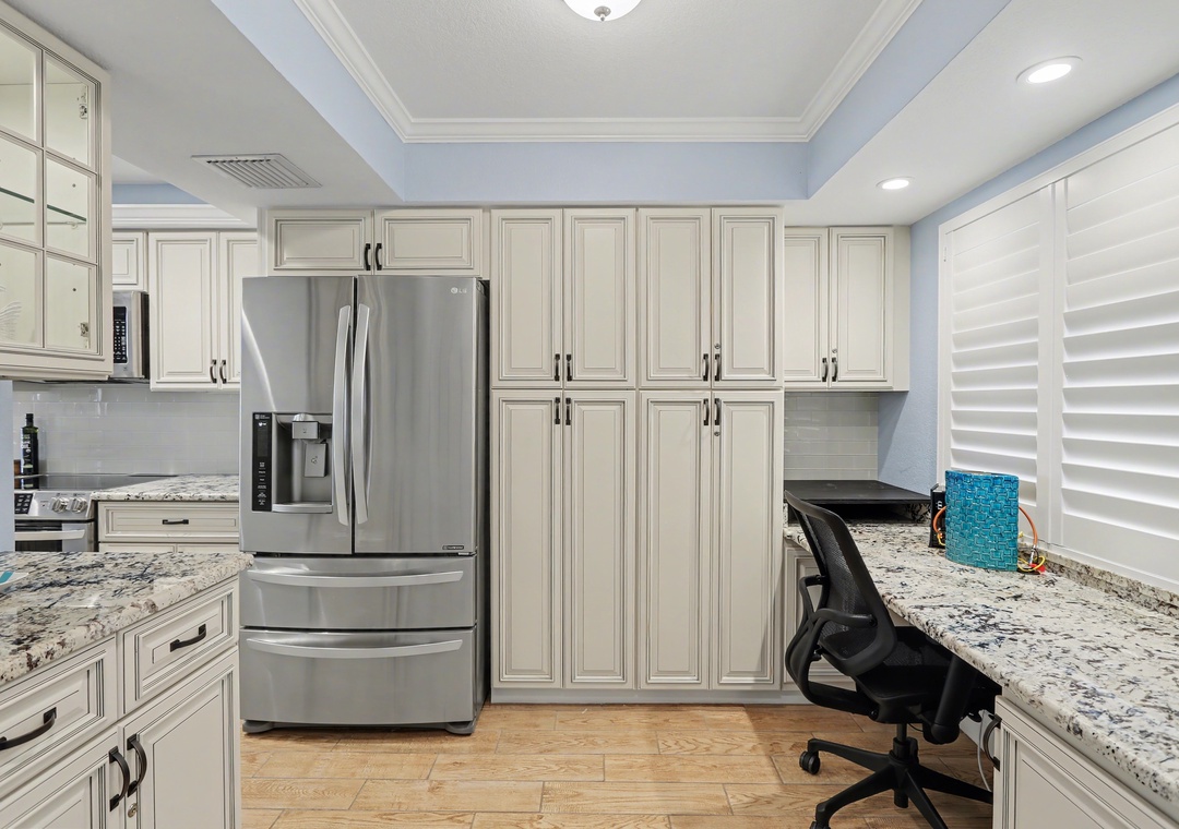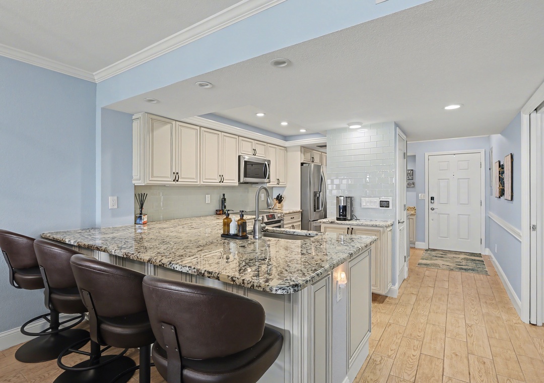 Step inside to bright natural light streaming through the wall of balcony sliders in the living room, where the open floor plan seamlessly connects the kitchen, dining area, and living space. The living room offers a leather couch and loveseat, a large smart TV, and access to the balcony overlooking the beach and Gulf of Mexico. The dining table is set for four, with additional barstool seating at the spacious, extended kitchen counter. The modern kitchen is gorgeous—fully stocked with cookware, dishes, and utensils, featuring ample cabinet space and top-of-the-line stainless steel appliances—making it the perfect place to prepare your favorite meals. A built-in desk off the kitchen is ideal for remote workers balancing productivity with beachside relaxation.