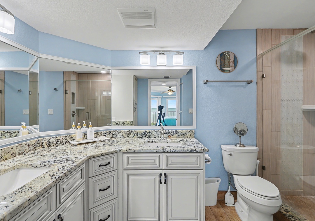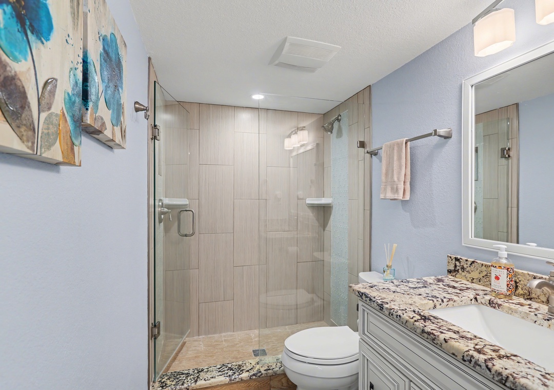 Both bedrooms are comfortable and inviting. The master bedroom includes a king bed, TV, beautifully updated en-suite bathroom with a large walk-in shower, and access to the balcony. The guest bedroom has a Smart TV and offers a unique bunk setup with a king bed on the bottom and queen on top, providing flexible and cozy sleeping arrangements. The updated guest bathroom also features a spacious walk-in shower. For your convenience, a washer and dryer are located right inside the condo. You will also have assigned parking and free wifi.