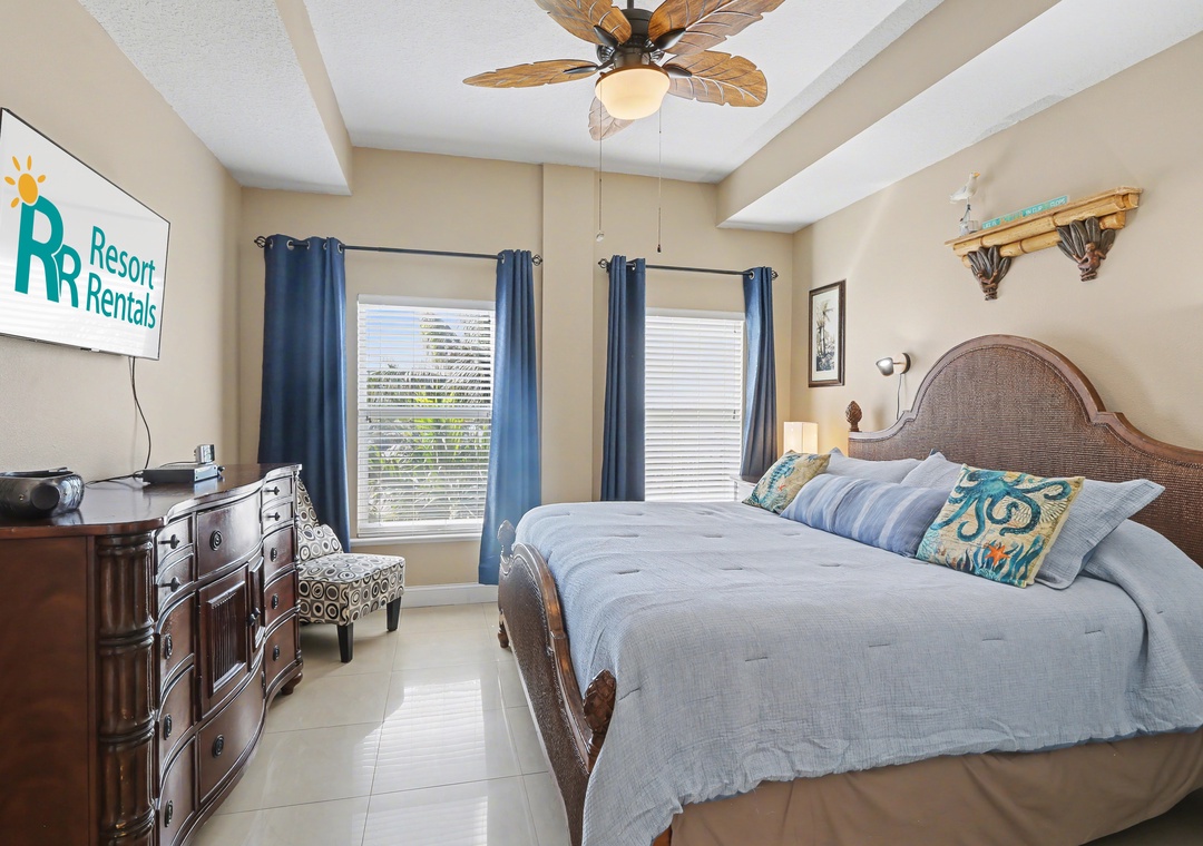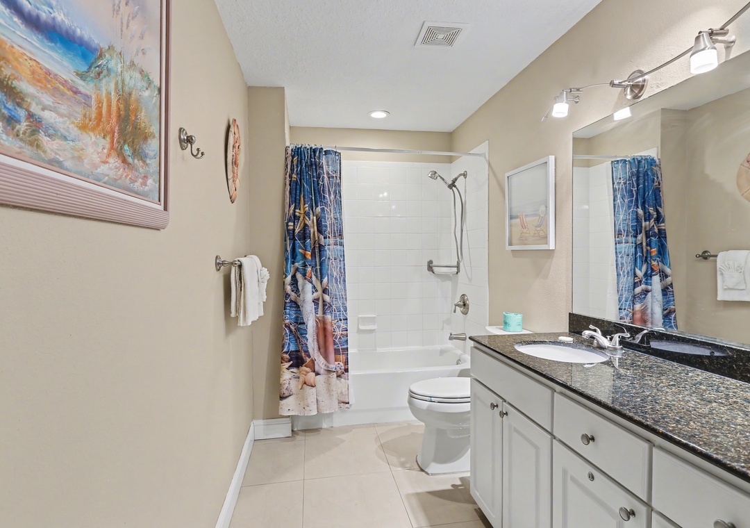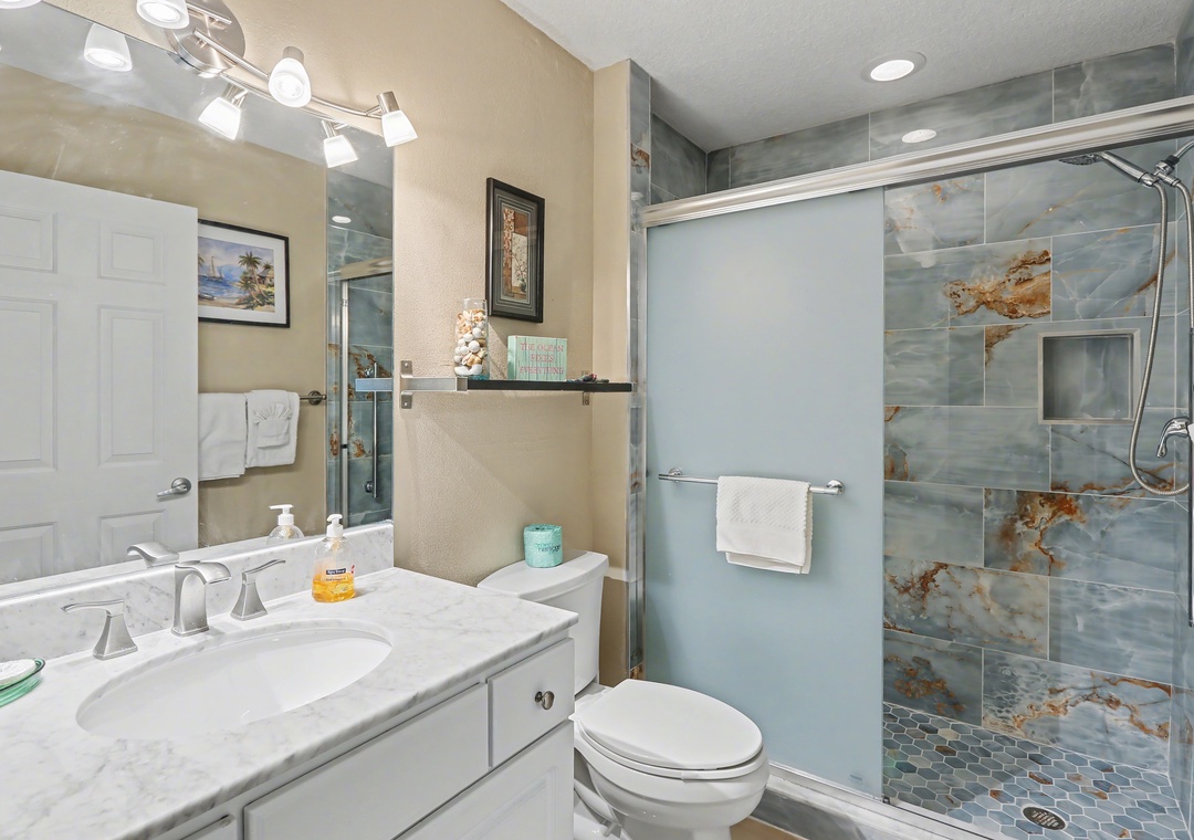 The master bedroom features a king bed, TV, and an attached bathroom with a tub/shower combo. The guest bedroom offers a comfortable queen bed and TV, and an upgraded guest bathroom showcases a walk-in shower with beautiful tile work. For additional sleeping space, the living room sofa pulls out into a bed.
