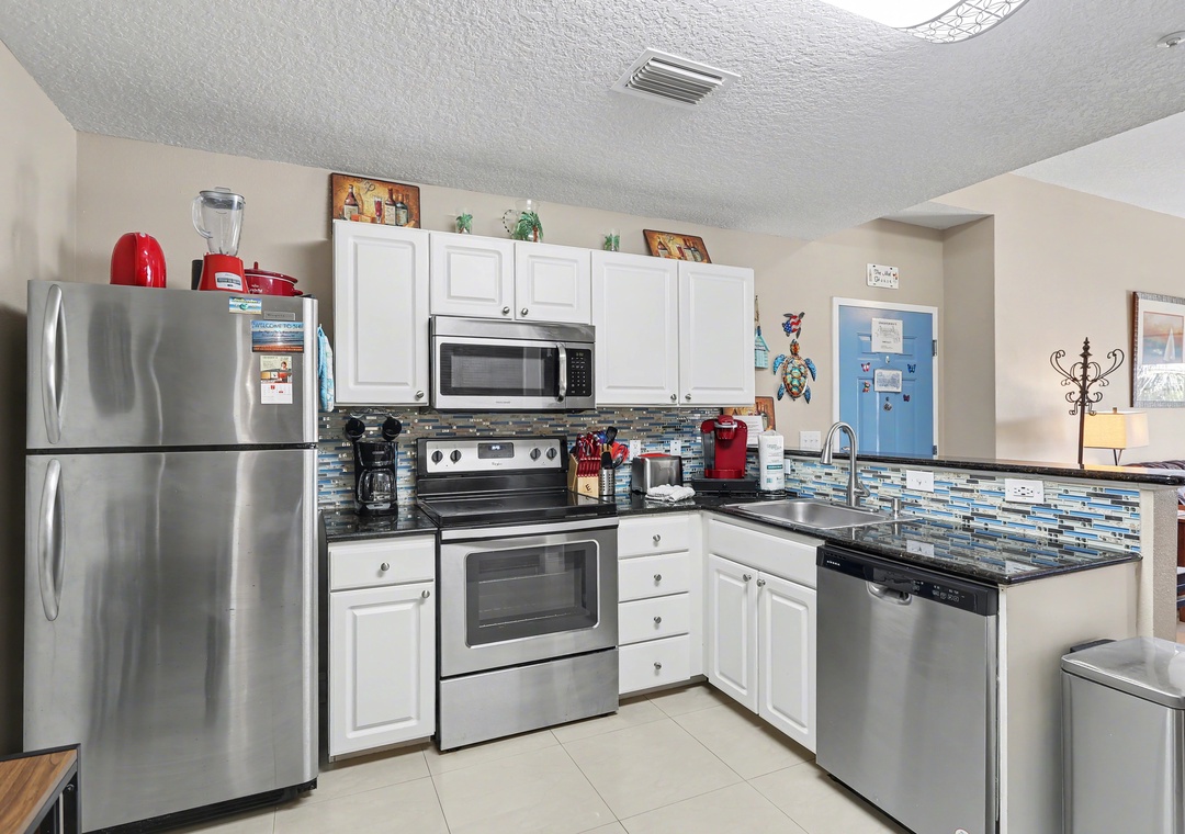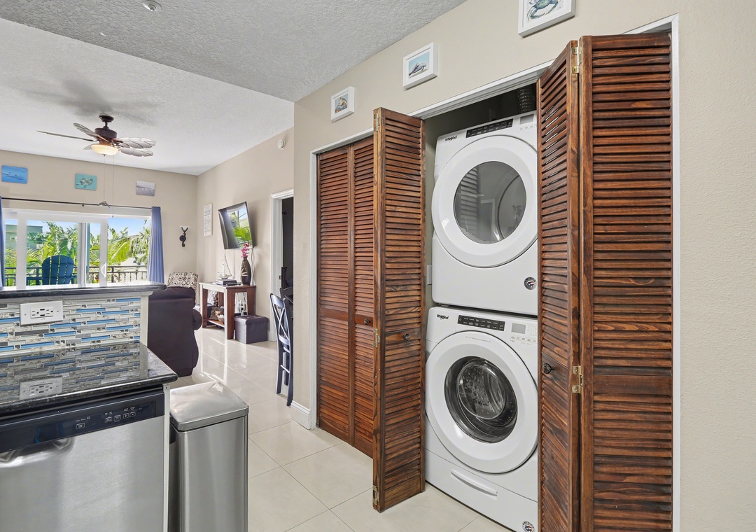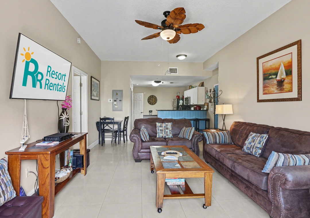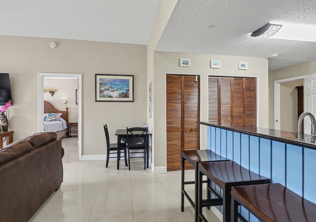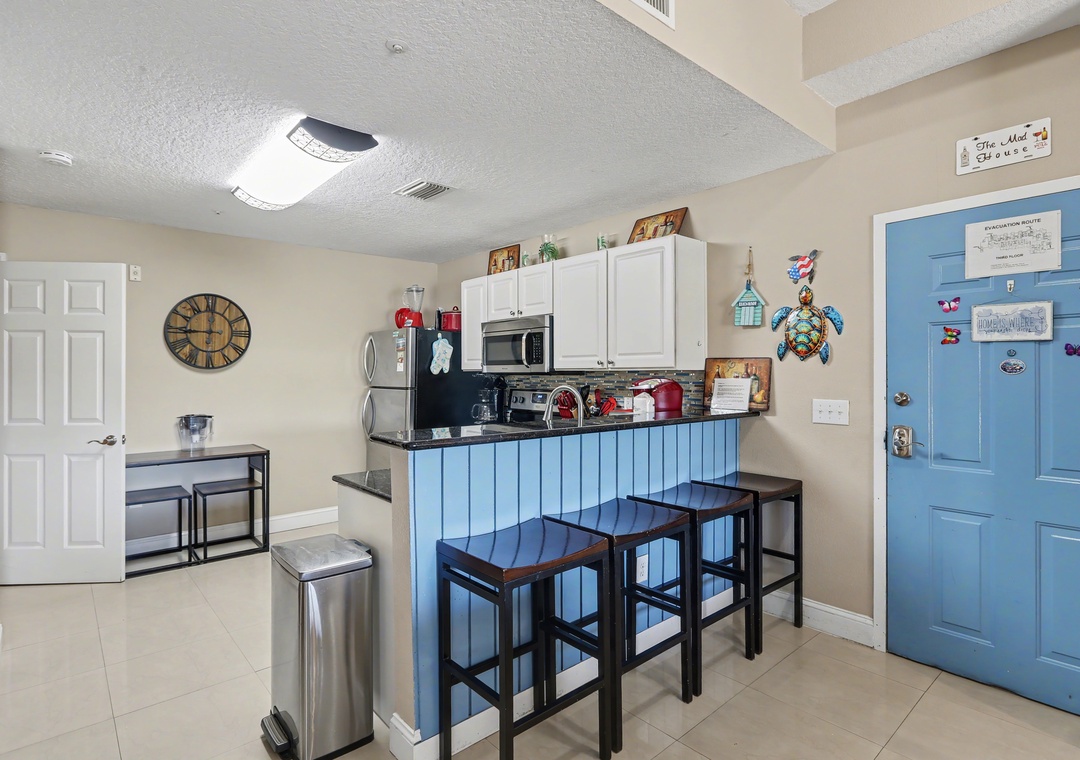 Inside, you’ll find a modern, comfortable living space featuring a cozy couch and sofa, a large flat-screen TV, and easy access to the private balcony—perfect for unwinding after a day in the sun. The living room opens to the dining area and kitchen, which includes a small dining table plus additional bar-stool seating at the counter. The kitchen offers generous counter space, stainless steel appliances, and is fully stocked with dishes, cookware, and utensils, all accented by a stylish backsplash and contemporary finishes. A washer and dryer off the kitchen add extra convenience during your stay.