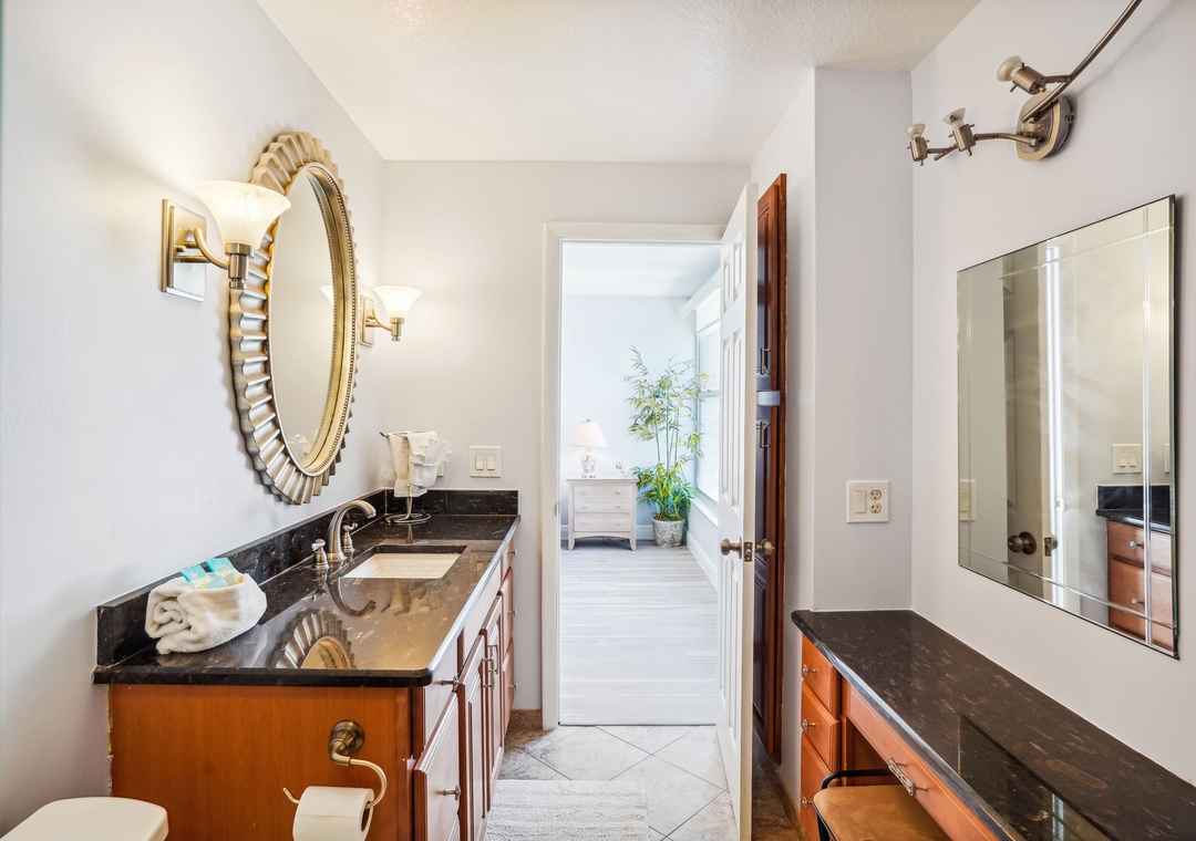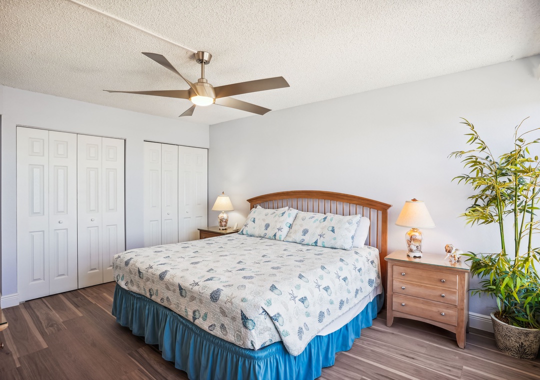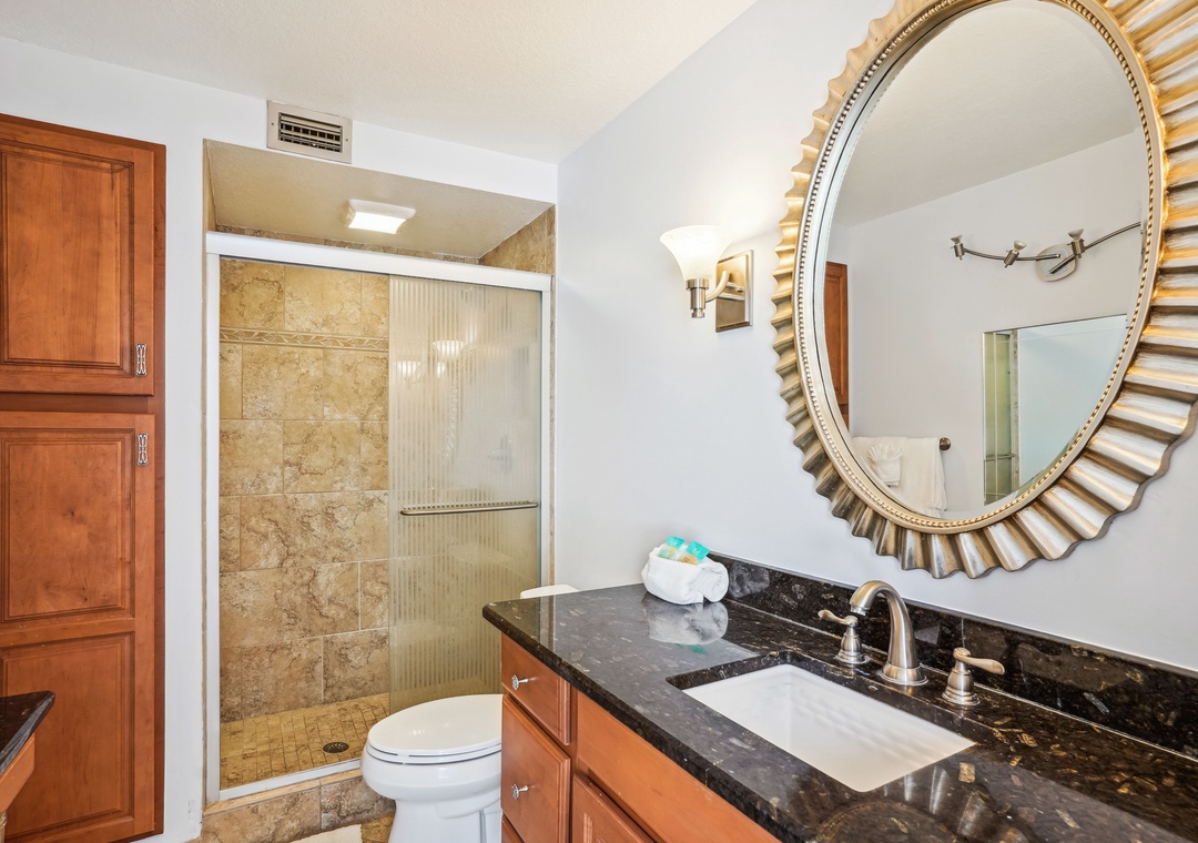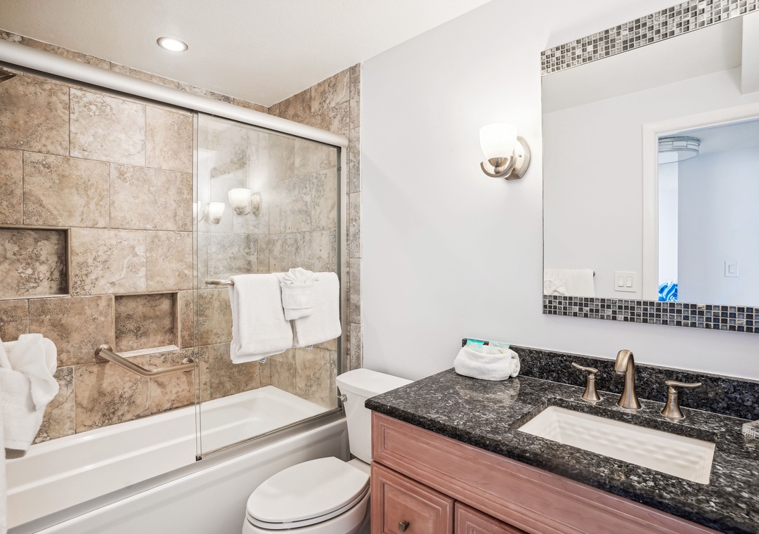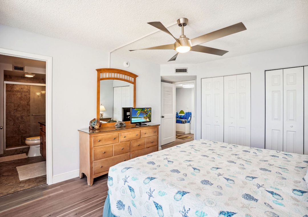 The primary bedroom has a king size bed with adjoining full bathroom. The guest bedroom is outfitted with another king size bed. Just outside the guest bedroom is a large full bathroom that features a tub shower combo.