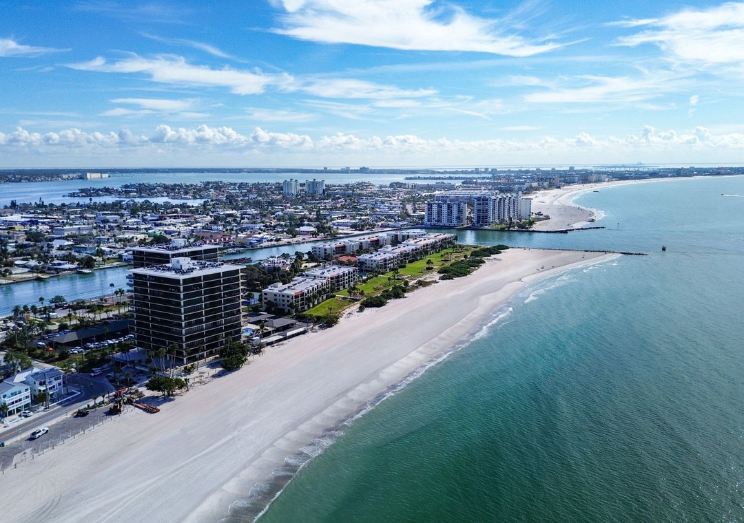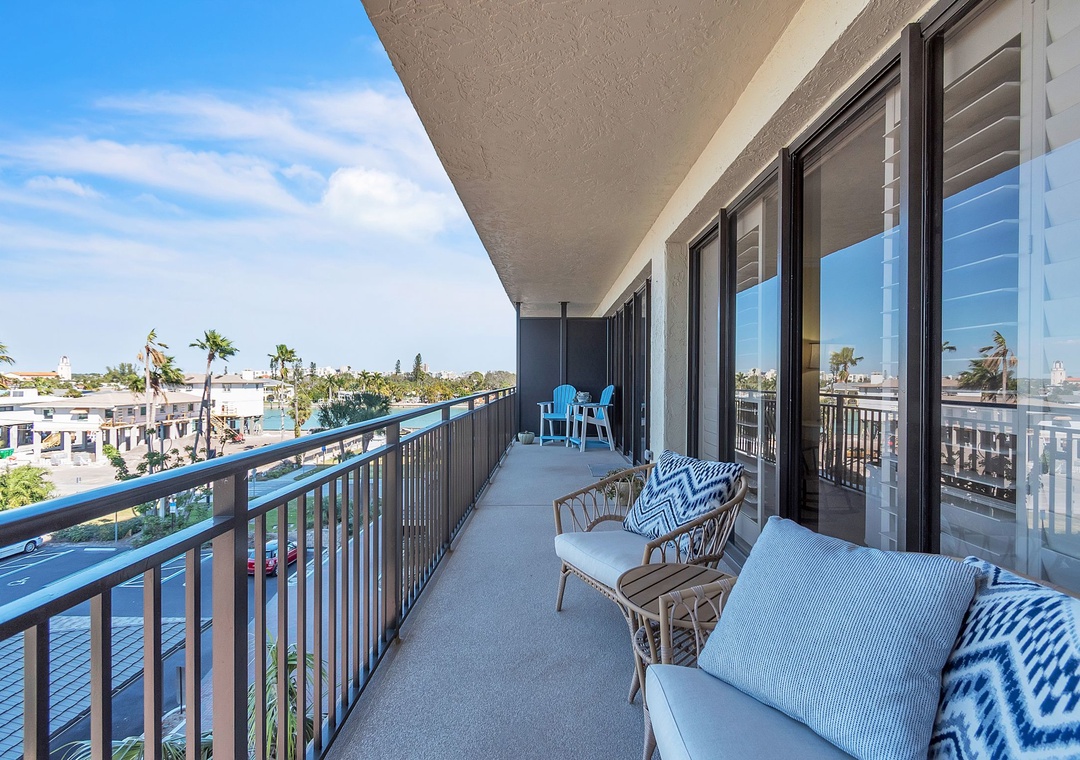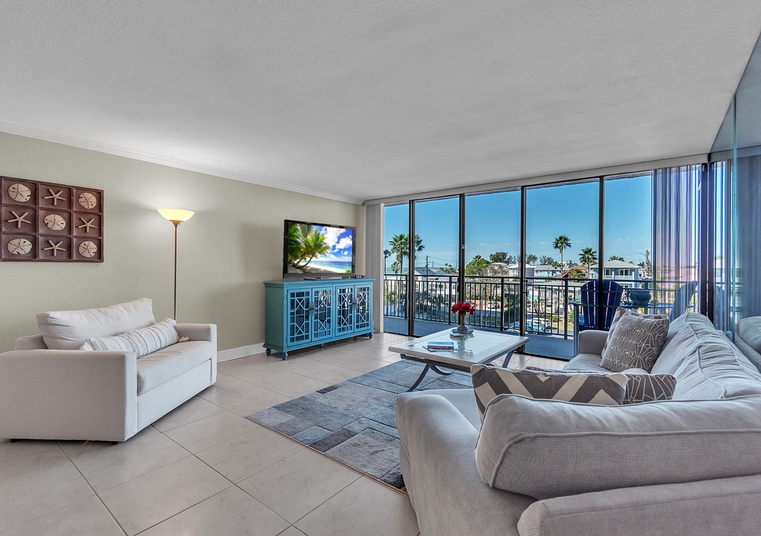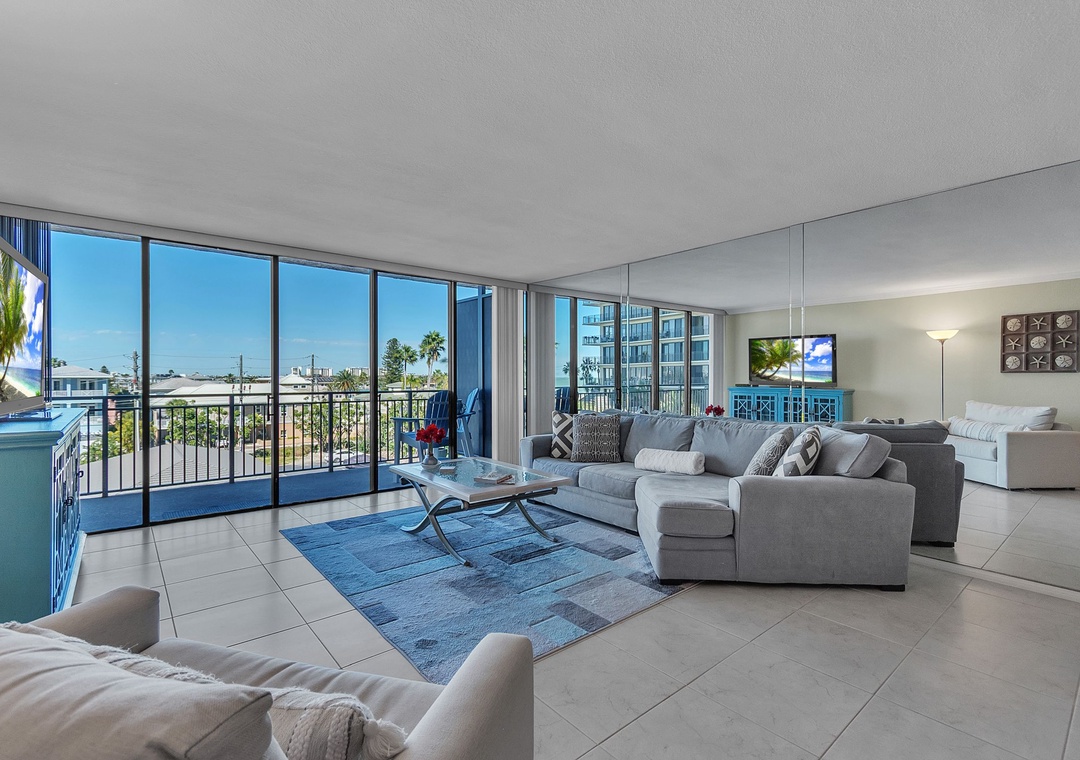 Mansions By The Sea in Treasure Island is a beautifully landscaped waterfront community made up of two buildings, uniquely situated with the Gulf of Mexico on one side and the Intracoastal Waterway on the other—truly surrounded by water and tropical scenery. Onsite amenities include a heated beachside pool with a spacious pool deck and lounge chairs, a community room, workout room, library, and tennis/pickleball courts (with the tennis court located just across the street). Beach access is conveniently located onsite, directly off the pool deck. With stunning shared common areas and a peaceful setting, this condo is perfect for extended stays.
