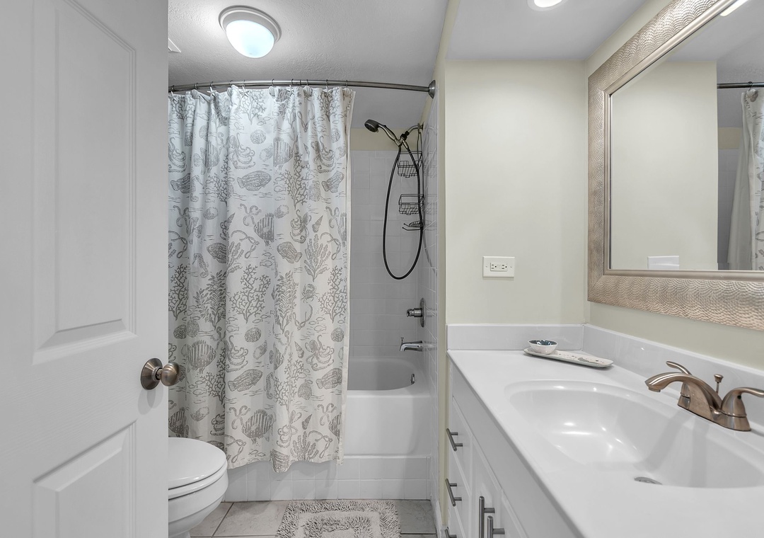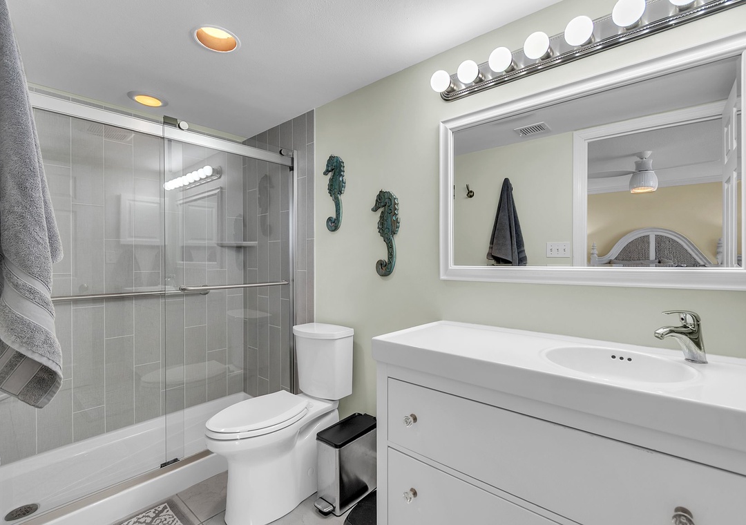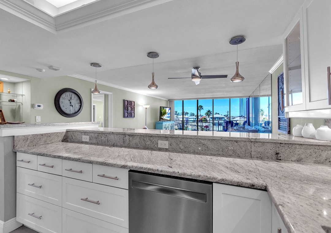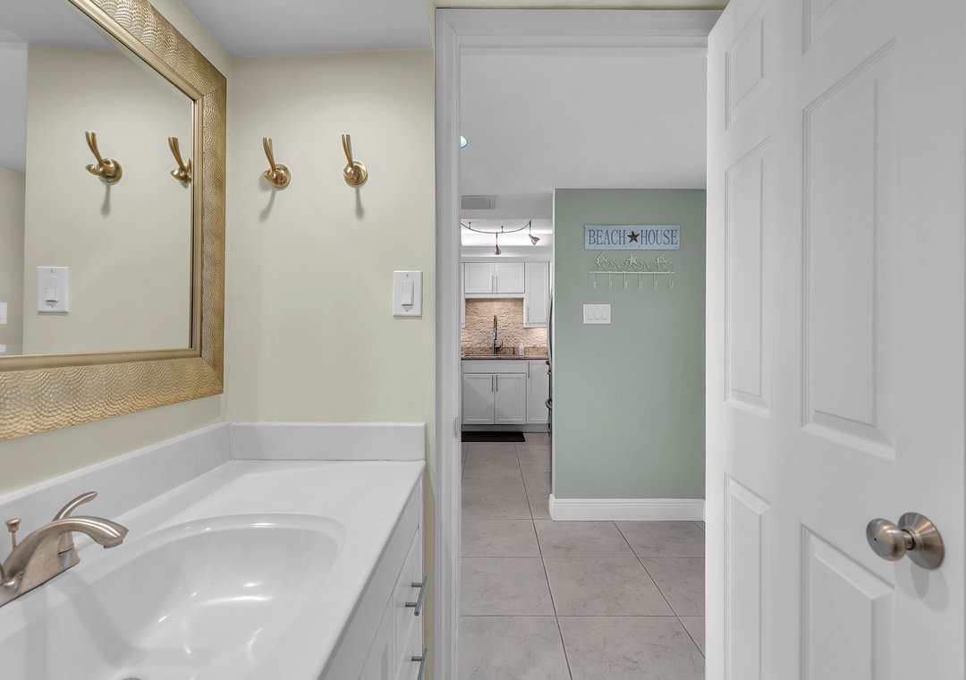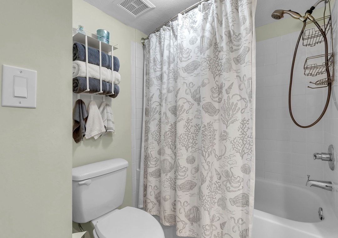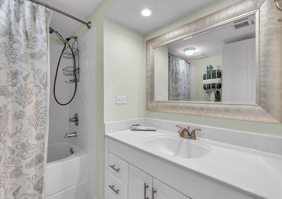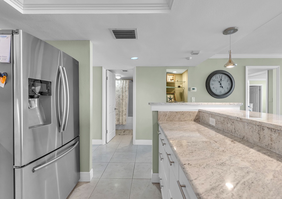 The updated, spacious kitchen opens to the living area and is fully stocked with everything you need to cook meals or prepare snacks for the beach. Stainless steel appliances, ample counter space, and additional counter seating make the kitchen both functional and inviting. Dishes, cookware, and utensils are all provided for your convenience. A full bathroom with a tub/shower is located just off the kitchen, while the bedroom features a queen bed, TV, private balcony access, and an attached master bathroom with a large walk-in shower. For added comfort, the condo also includes an in-unit washer and dryer.