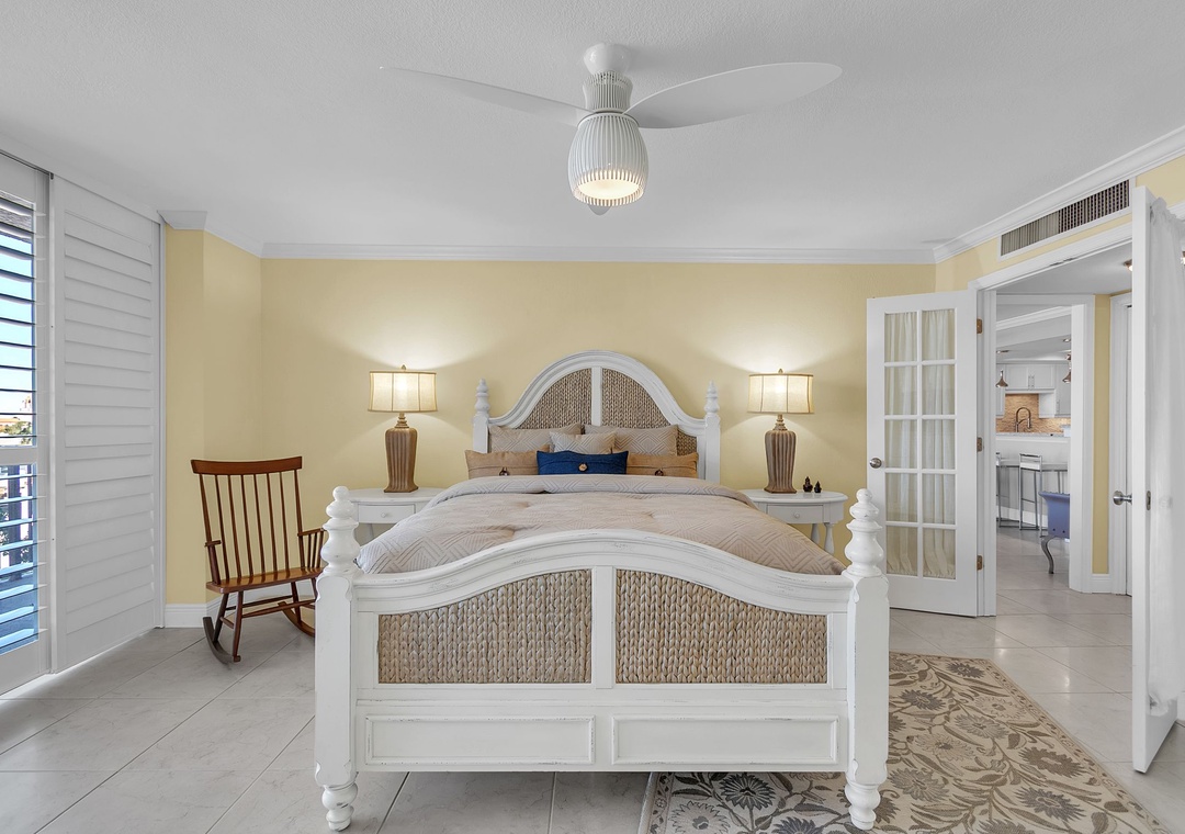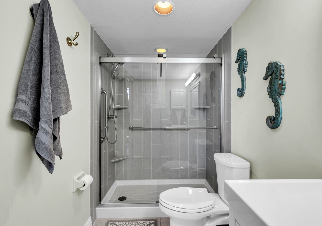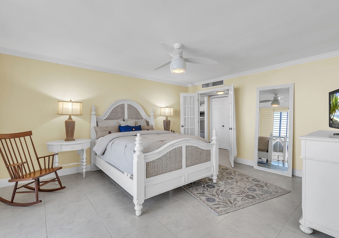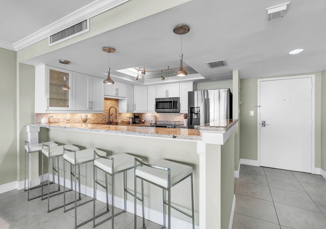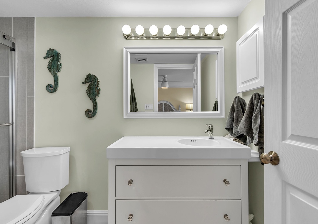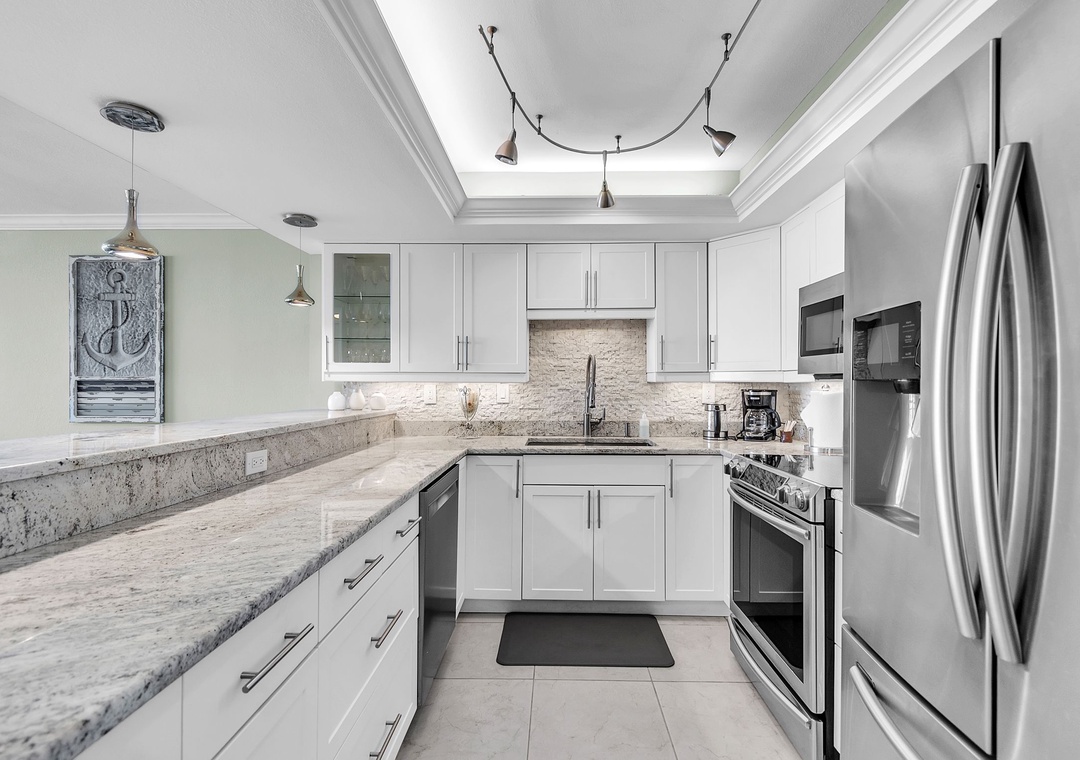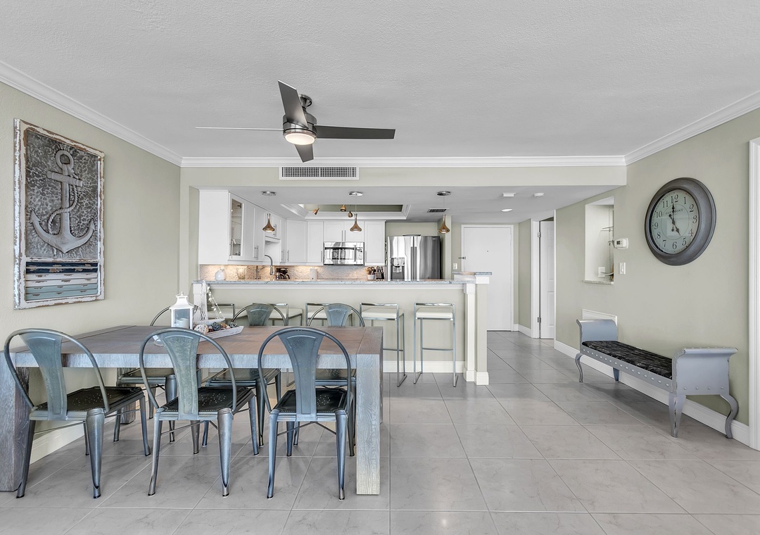 The updated, spacious kitchen opens to the living area and is fully stocked with everything you need to cook meals or prepare snacks for the beach. Stainless steel appliances, ample counter space, and additional counter seating make the kitchen both functional and inviting. Dishes, cookware, and utensils are all provided for your convenience. A full bathroom with a tub/shower is located just off the kitchen, while the bedroom features a queen bed, TV, private balcony access, and an attached master bathroom with a large walk-in shower. For added comfort, the condo also includes an in-unit washer and dryer.