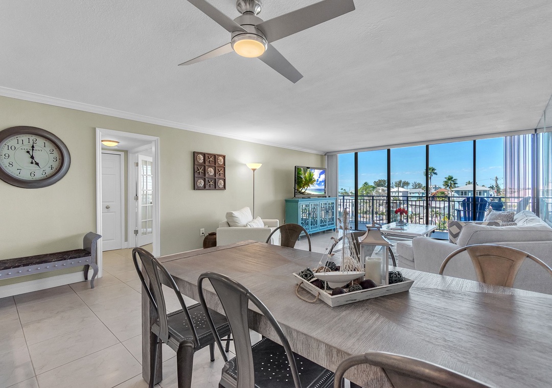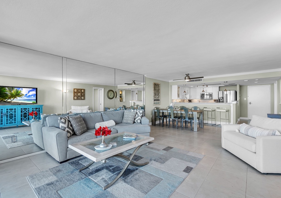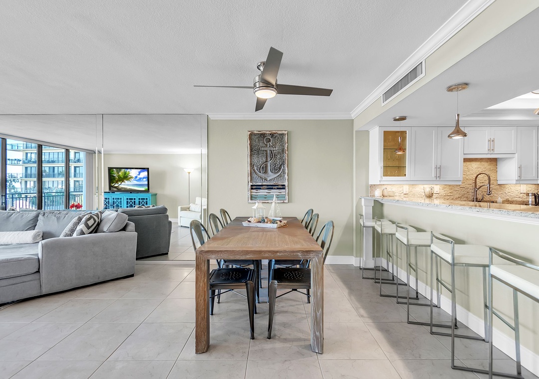 Welcome to Mansions By The Sea #306A, a bright and spacious 1-bedroom, 2-bathroom condo designed for relaxed coastal living. The open living area is filled with natural light and features a large, comfortable oversized couch and chair—the chair conveniently folds down into a twin-size bed to accommodate one additional guest if needed. A generous dining table offers the perfect spot for family dinners, game nights, or working on a favorite puzzle together. Just off both the living room and bedroom, you’ll find a large private balcony—an ideal place to enjoy the coastal breeze and unwind after a day at the beach.
