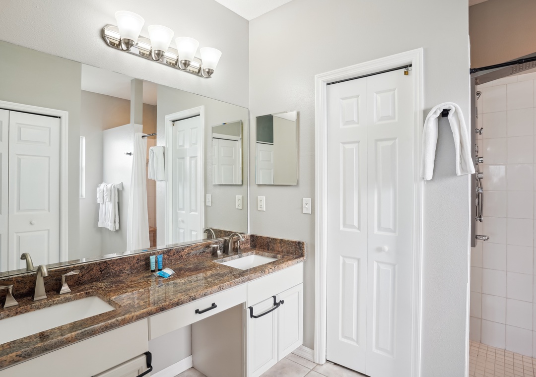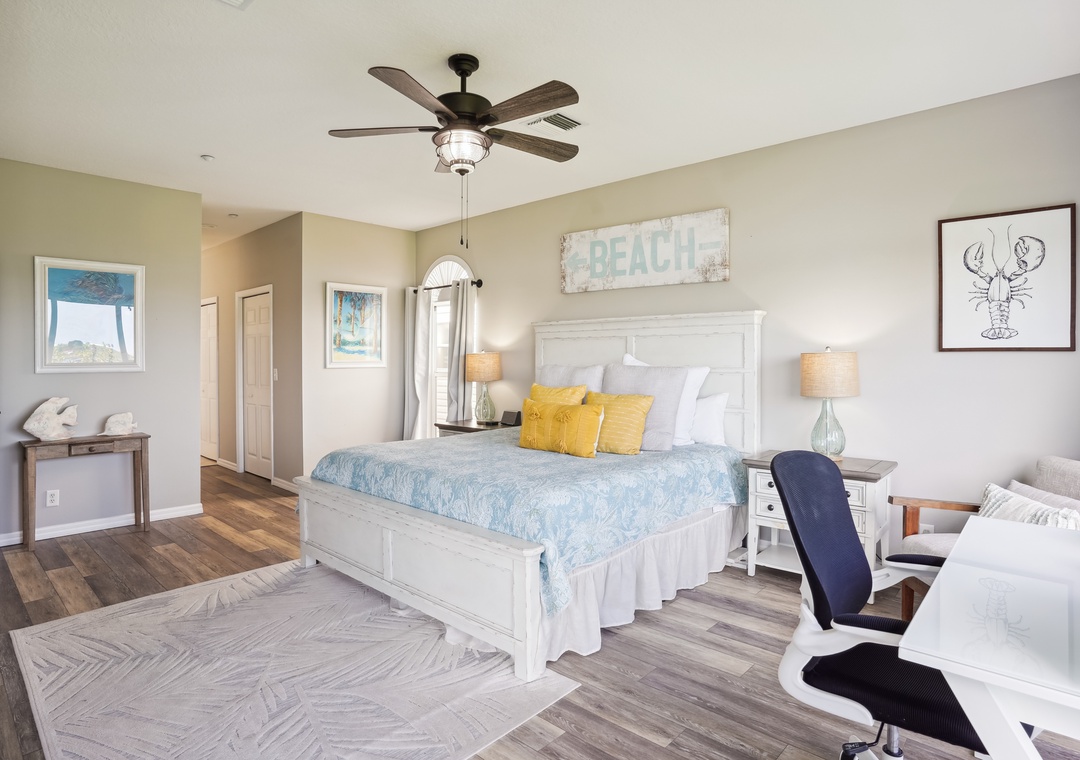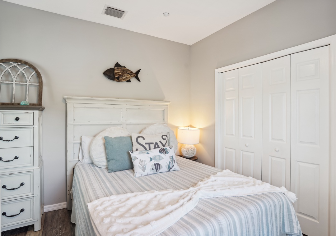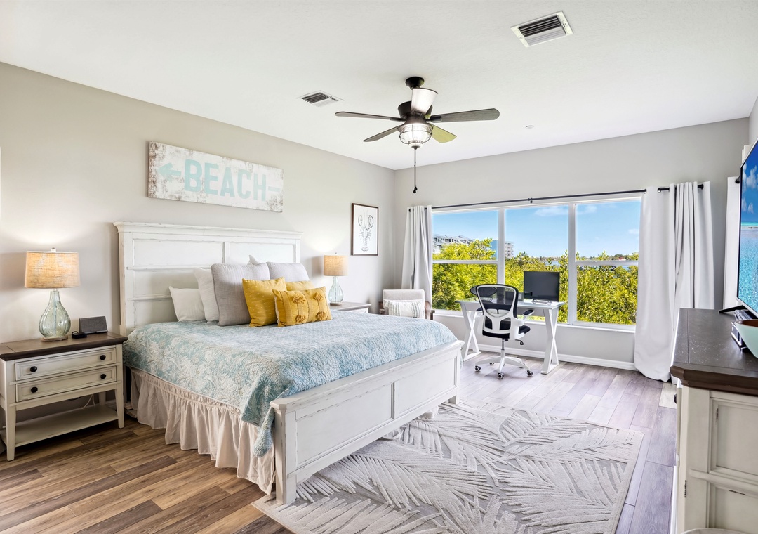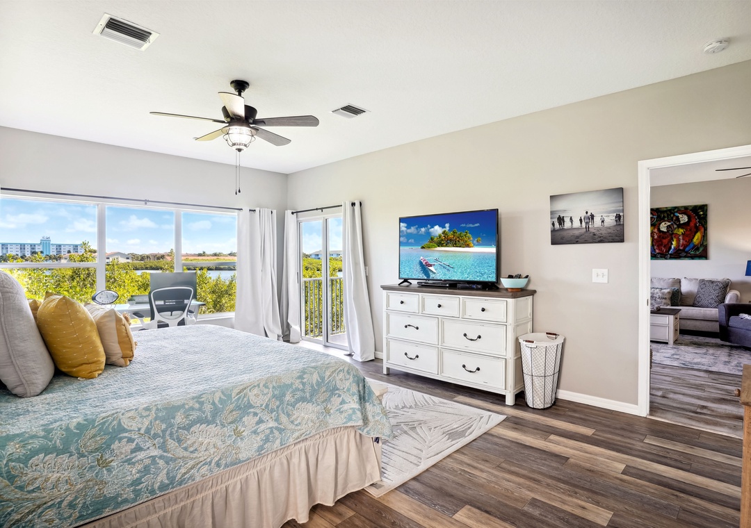 The Main Bedroom offers a king size bed, 55-inch smart TV, a desk overlooking the water, a walk-in closet, and private balcony access. Attached is a full bathroom with dual sinks and a walk-in shower. The guest bedroom offers a queen size bed as well as a twin size, triple bunk bed and a smart TV. There is a second full bathroom just across the hall with a tub/shower combo. All beds have memory foam mattresses. Please note: There is not an elevator at this property.