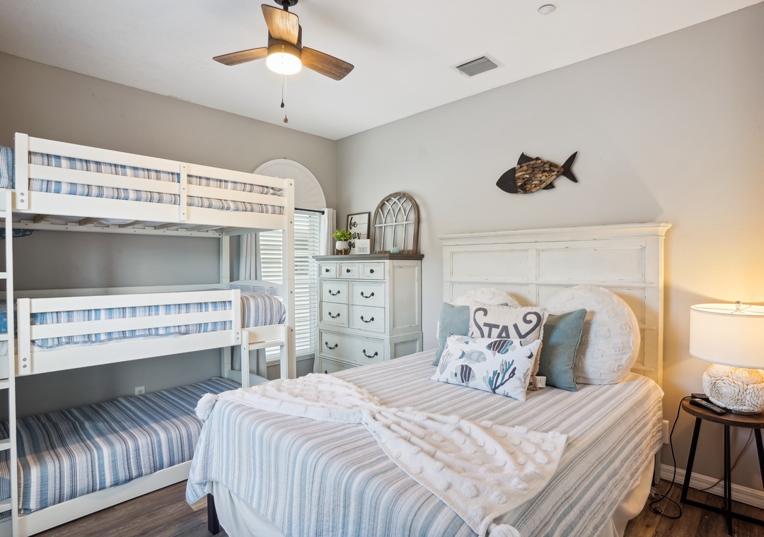 Bedroom 2: Queen Size Bed, Twin/Twin/Twin Bunk Bed